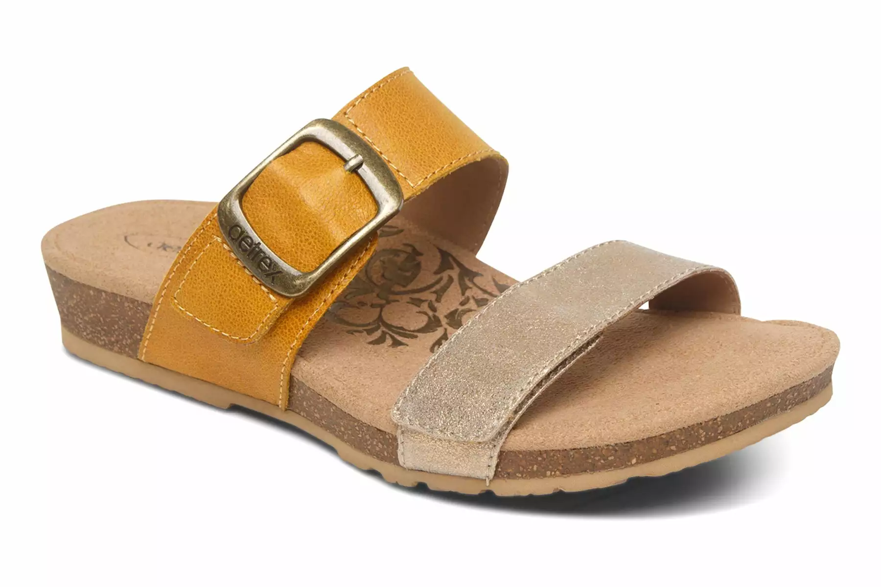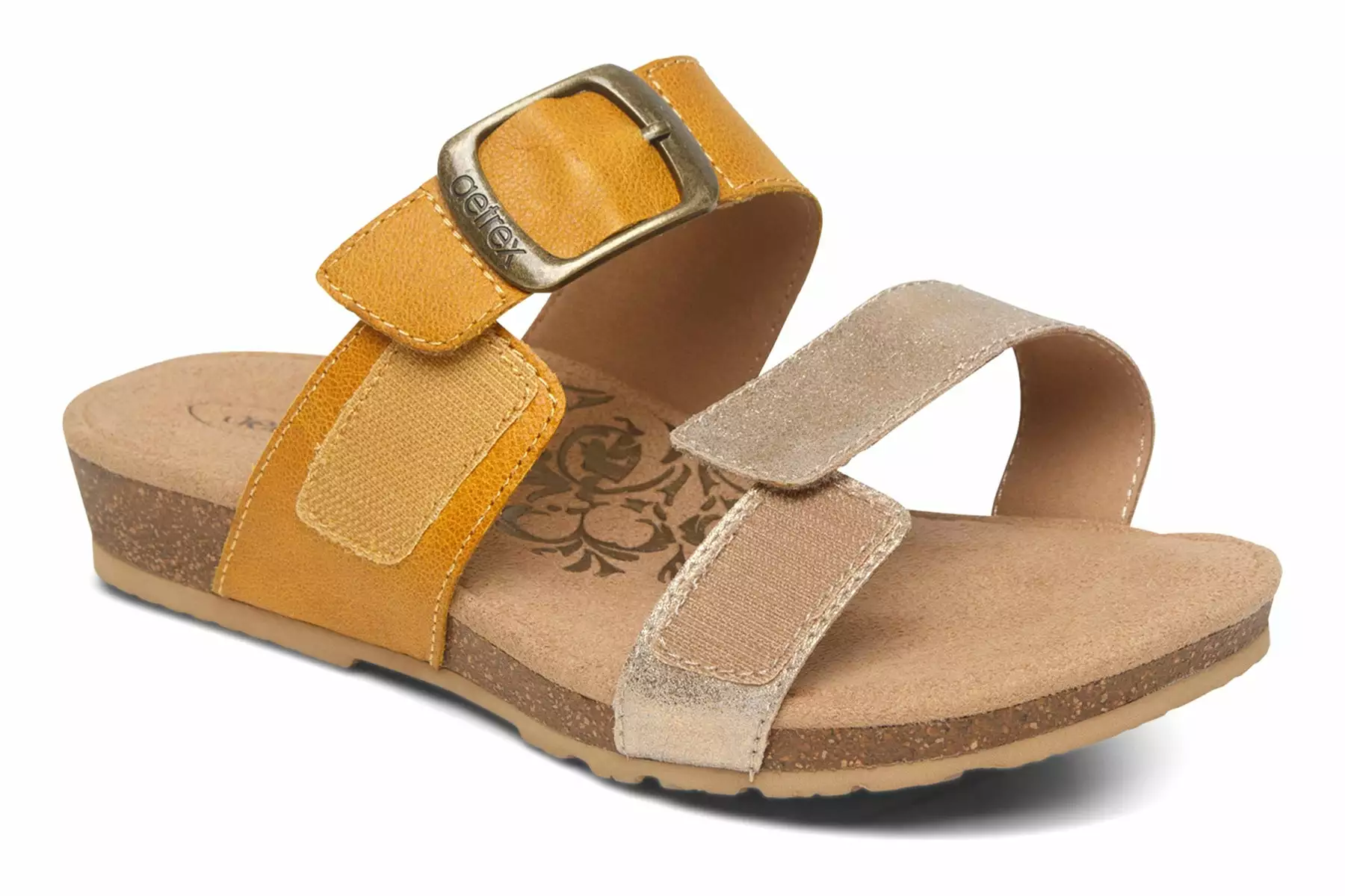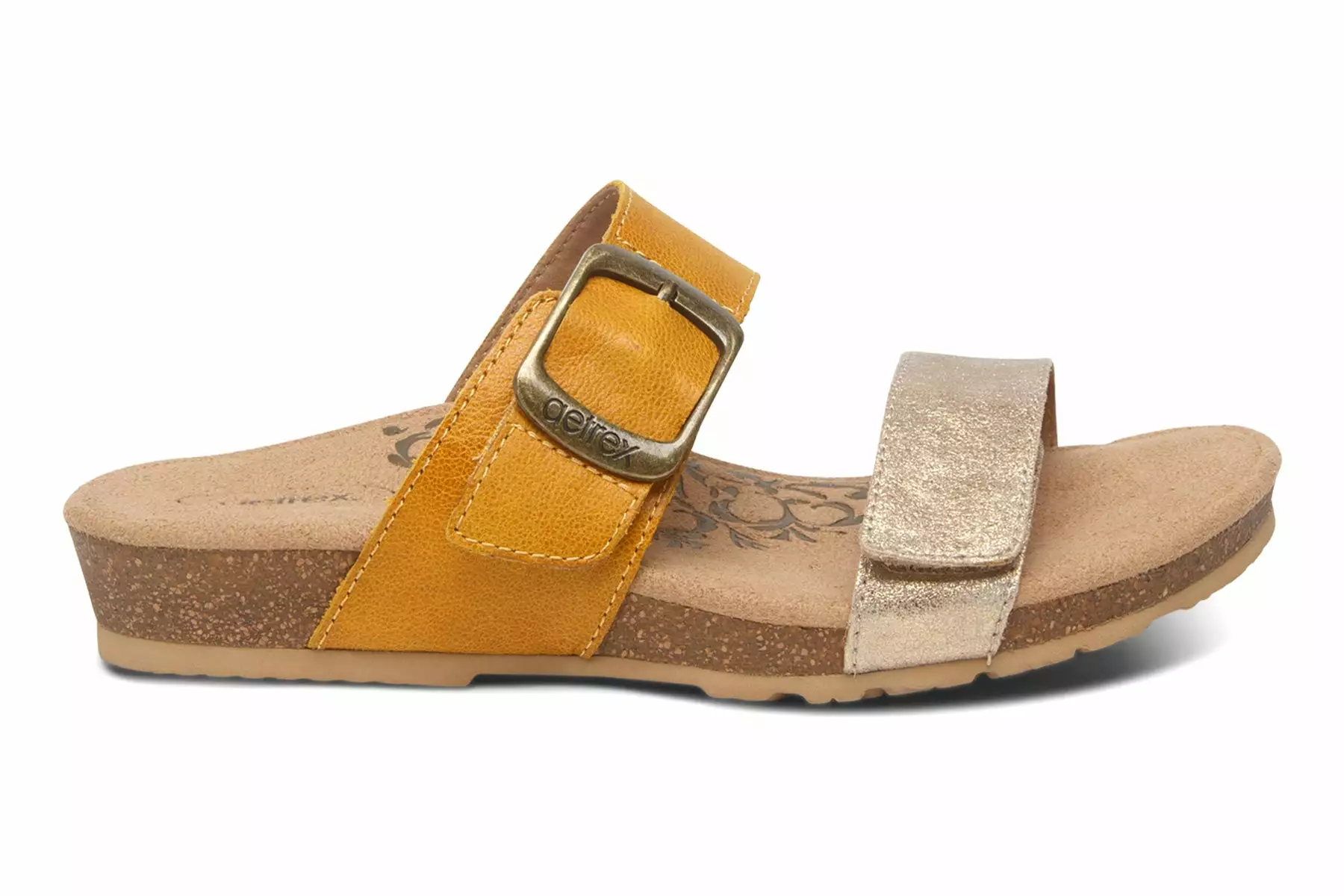 Aetrex Daisy is an adjustable slide sandal for any summertime outfit. With great arch support and a memory foam footbed, these leather slides are ideal for the outdoors. These sandals also have a lightweight cork midsole, leather hook and loop straps and durable rubber sole.