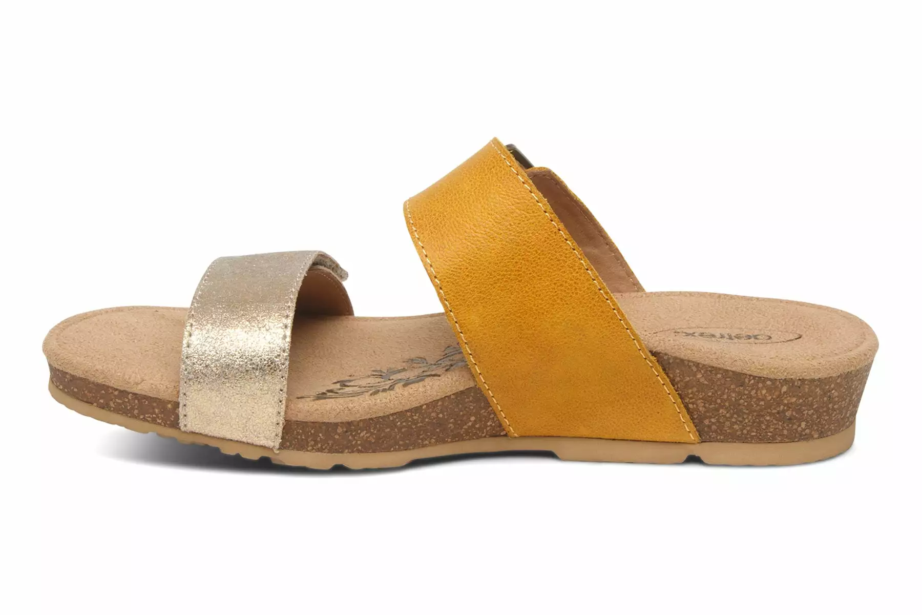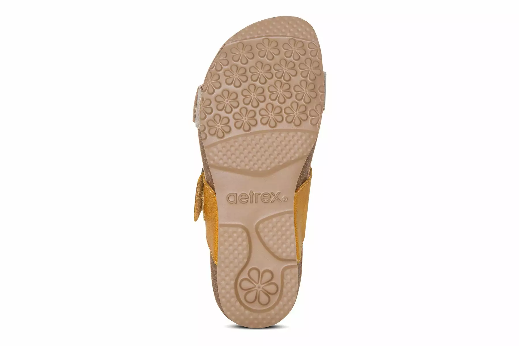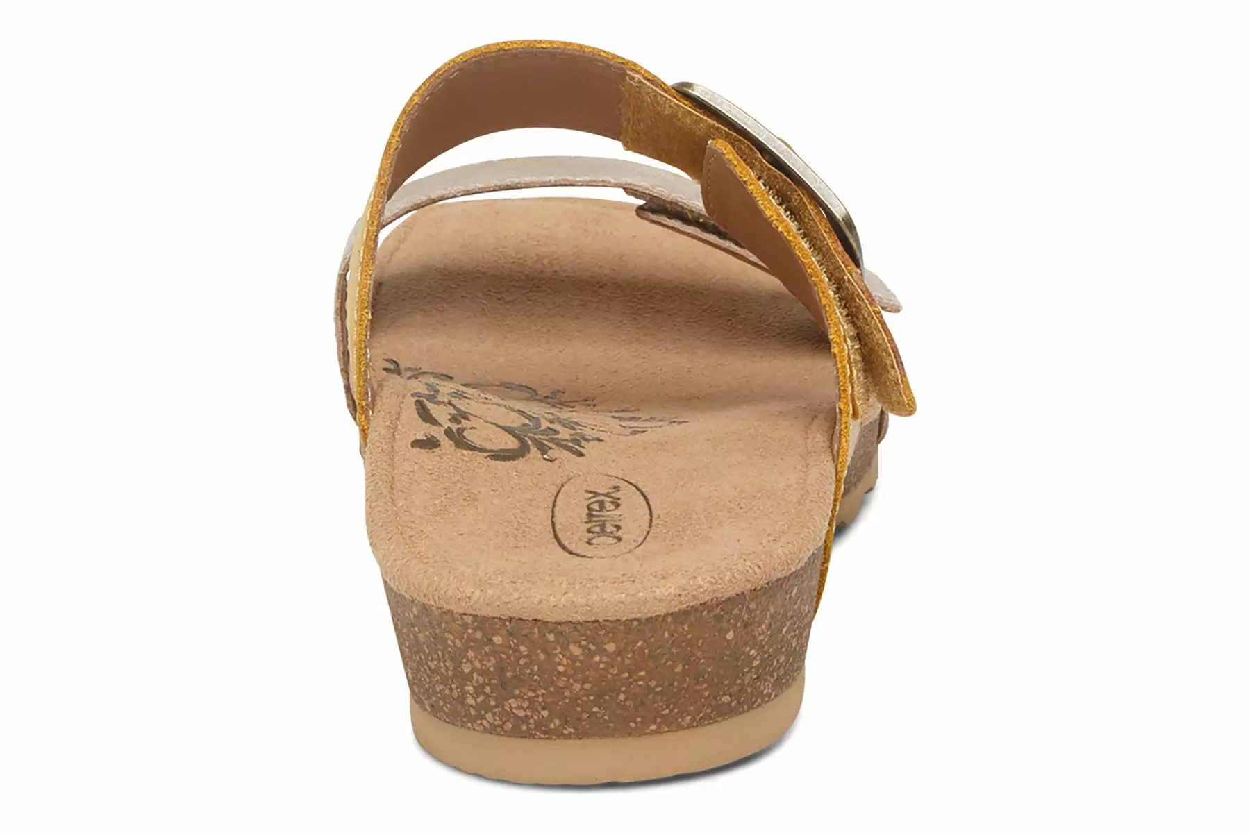 Aetrex Daisy is an adjustable slide sandal for any summertime outfit. With great arch support and a memory foam footbed, these leather slides are ideal for the outdoors. These sandals also have a lightweight cork midsole, leather hook and loop straps and durable rubber sole.