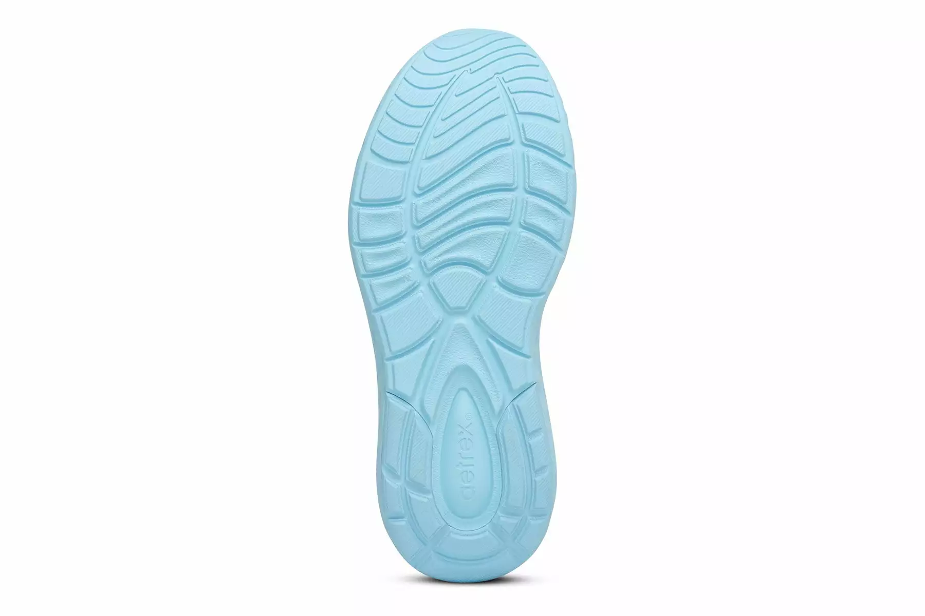 Aetrex Danika is a mesh sneaker with great arch support, thick UltraSky cushioning and adjustable laces. A padded collar and tongue provides extra comfort. A removable insole adds support, while rubber pods on the outsole offer traction and durability.