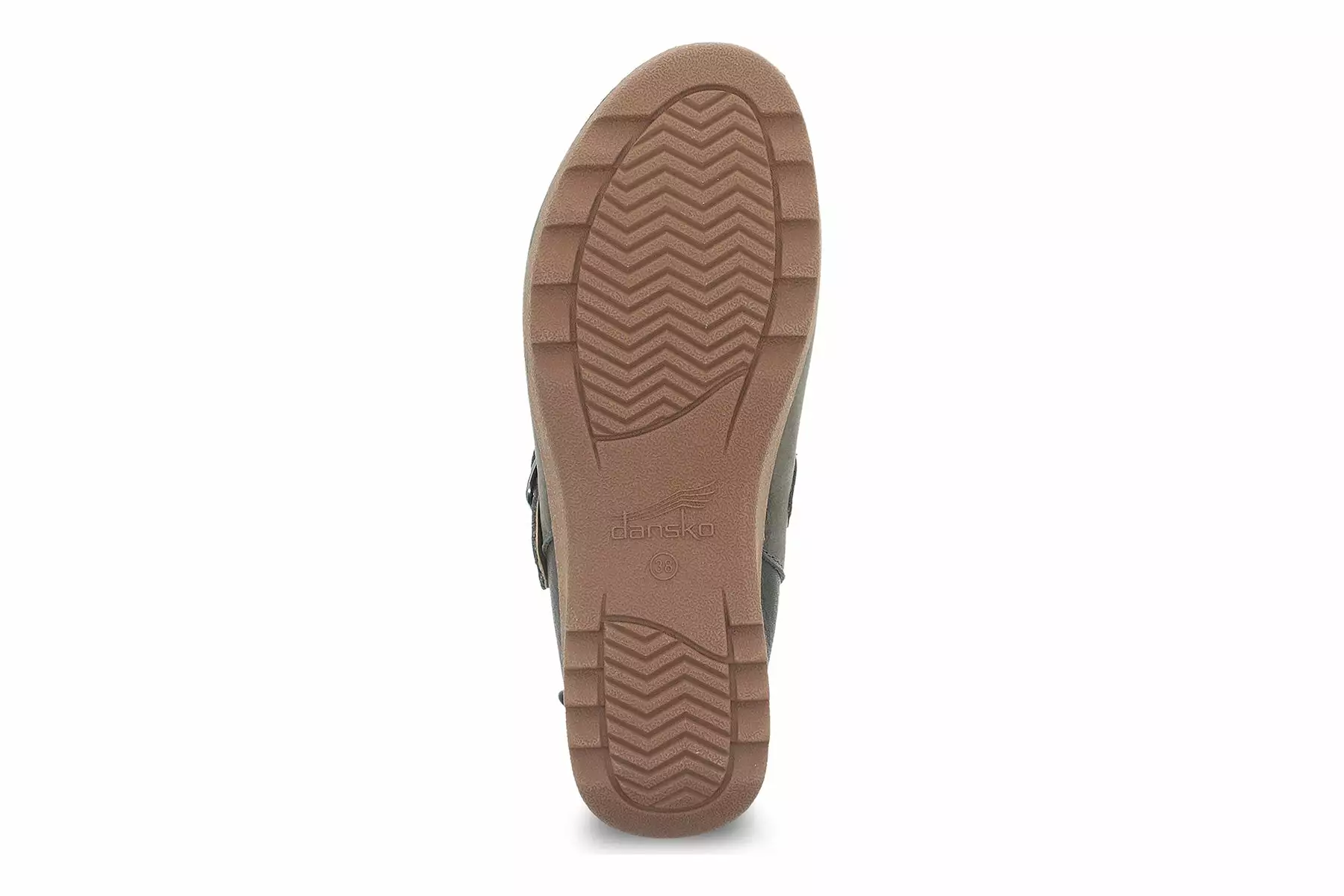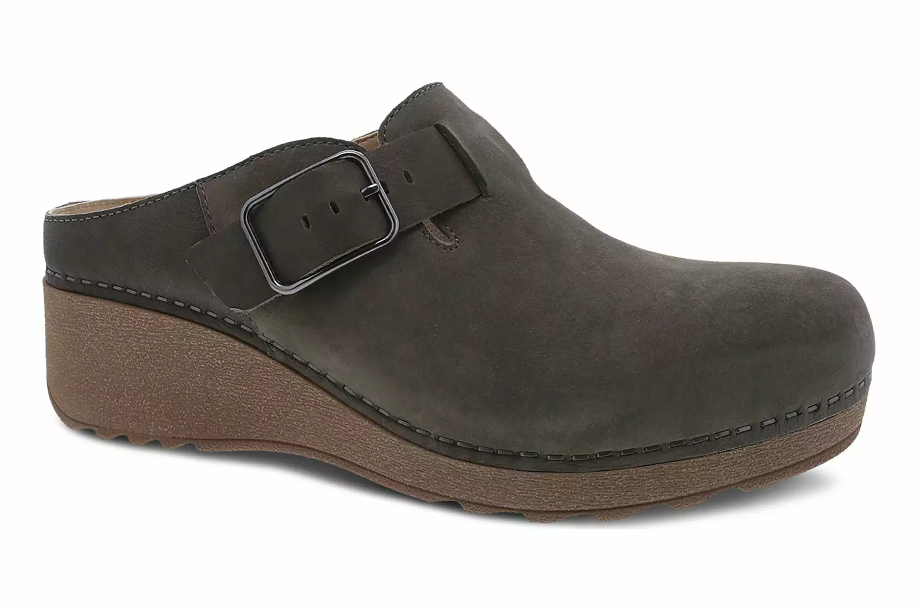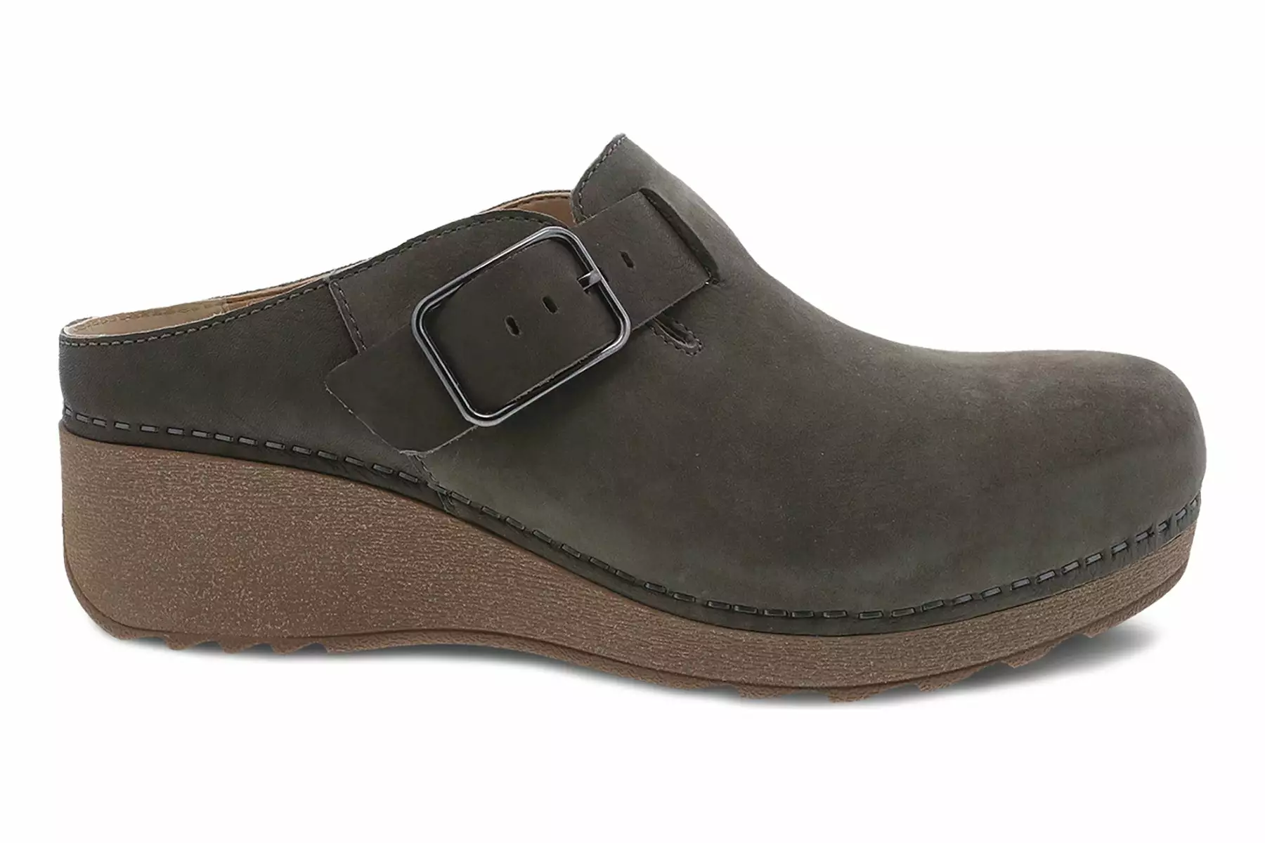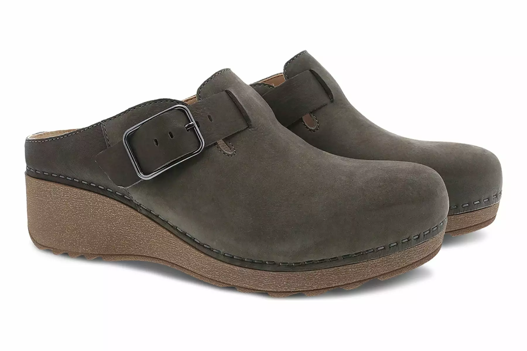 Dansko Caia is a casual mule clog with a buckle on a wedge heel. Features include Dansko’s patented stapled construction and a water and stain resistant silhouette. Nubuck leathers with 3M Scotchgard and a partially recycled EVA outsole completes this trendy clog.