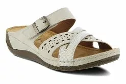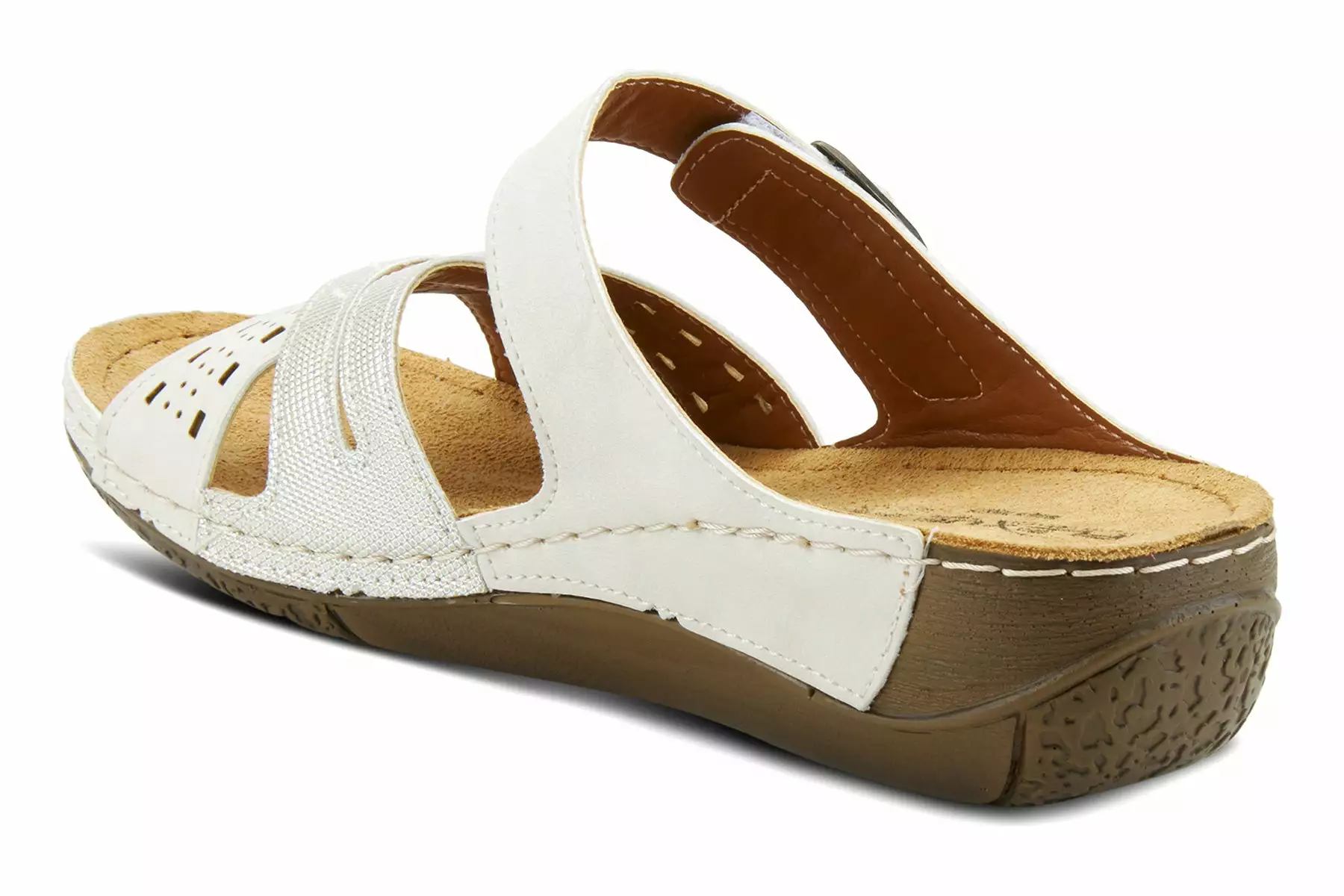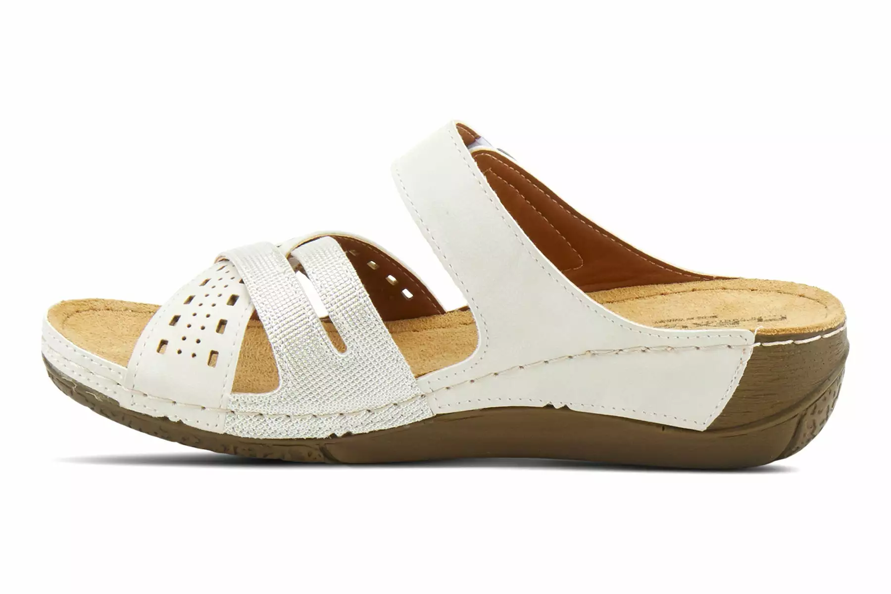 Two tone and textured slide with adjustable hook & loop fastening and shiny metal buckle detail, featuring cross over straps with cut outs, all on a polyurethane wedge outsole with heavy stitch detail.