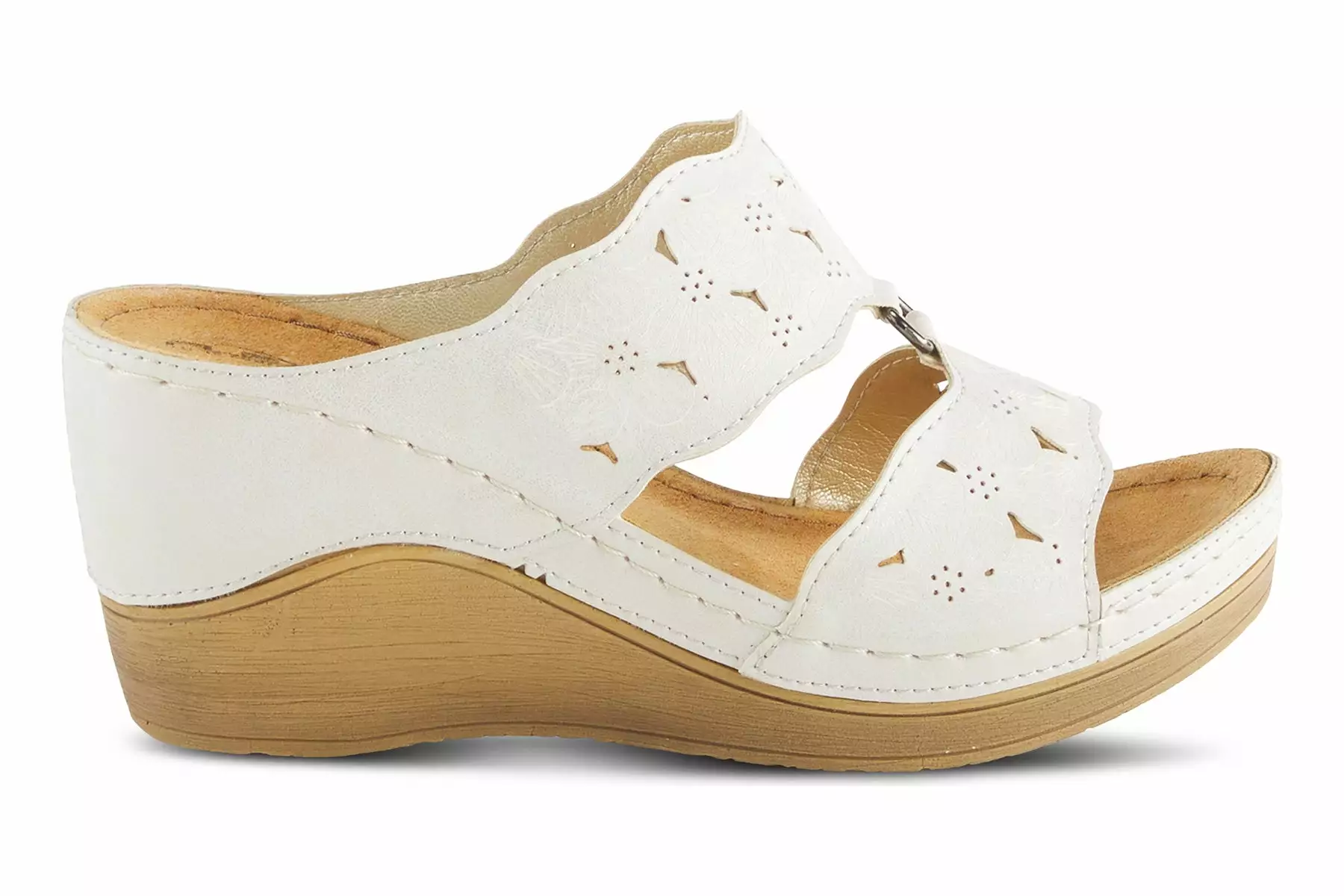 Double strapped wedge slide sandal with a connecting loop and geometric perforations