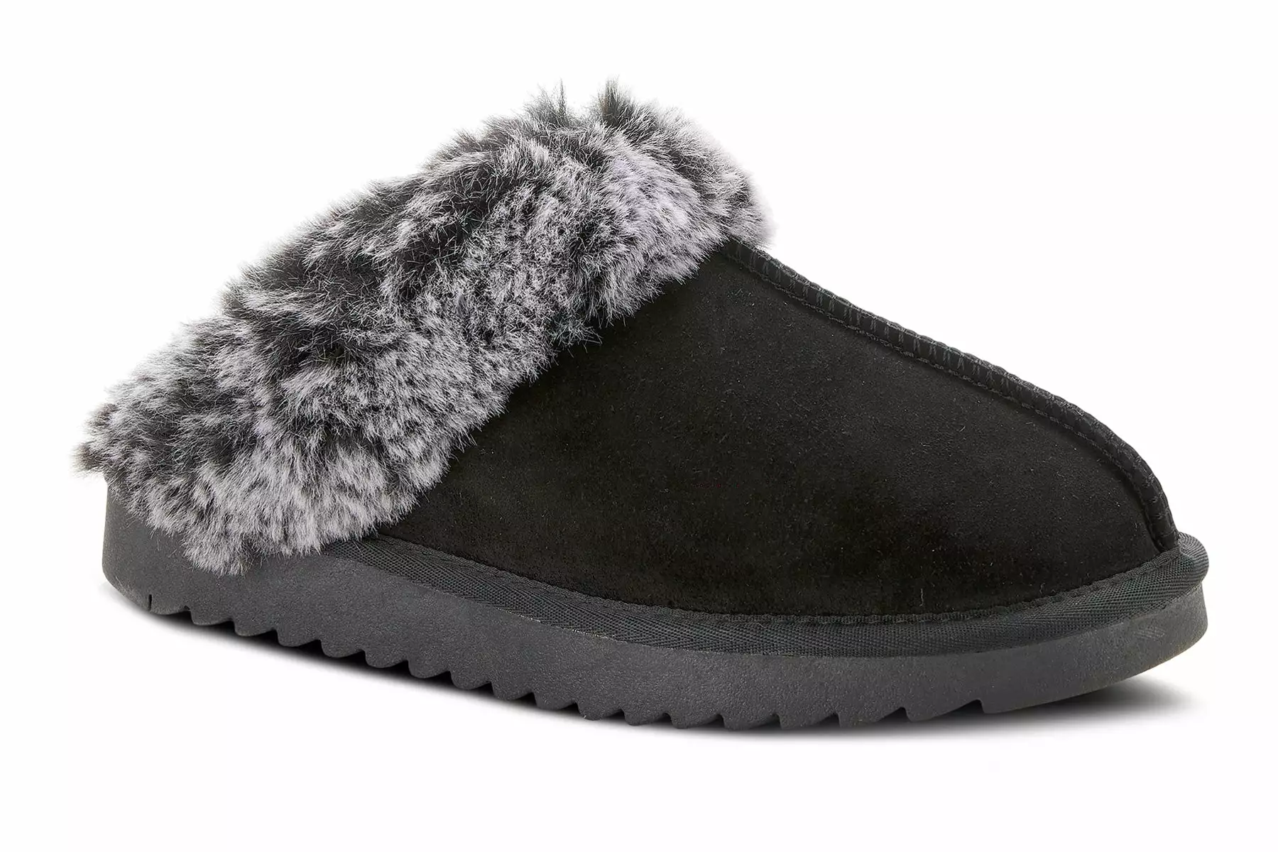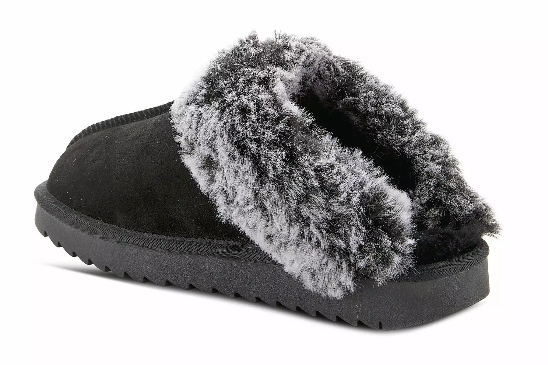 Flexus LINOHEART Indoor slide slipper with suede upper, cozy plush faux fur trim, butt-stitching detail, and cozy lining on a comfortable outsole.