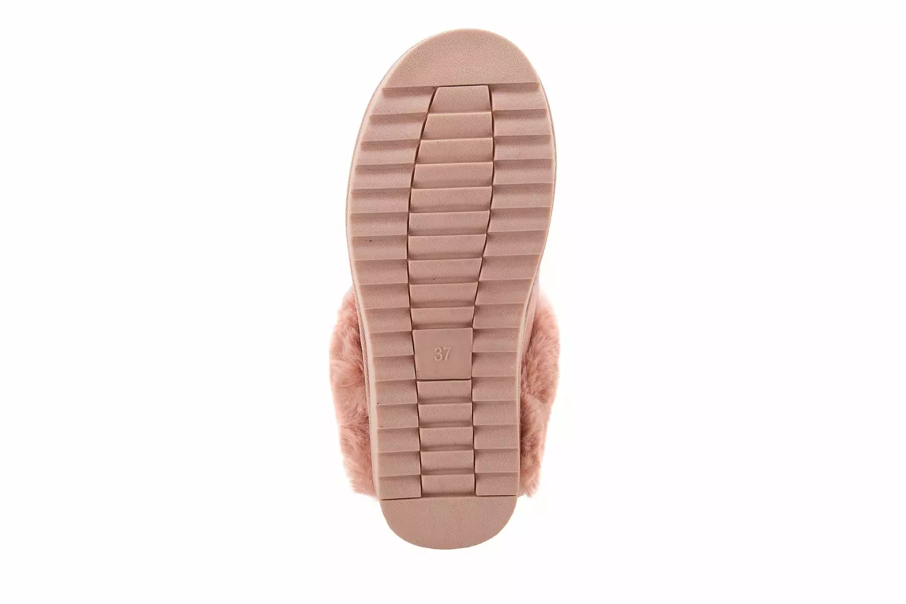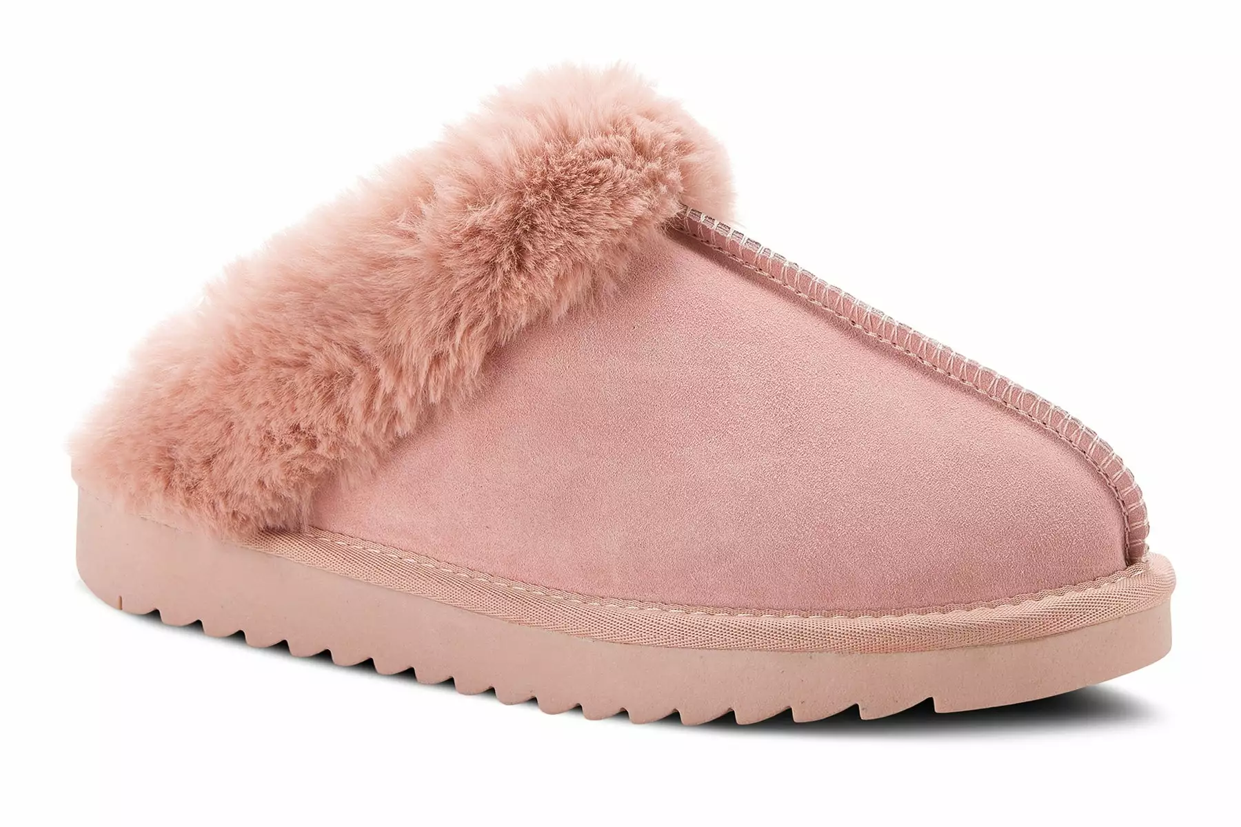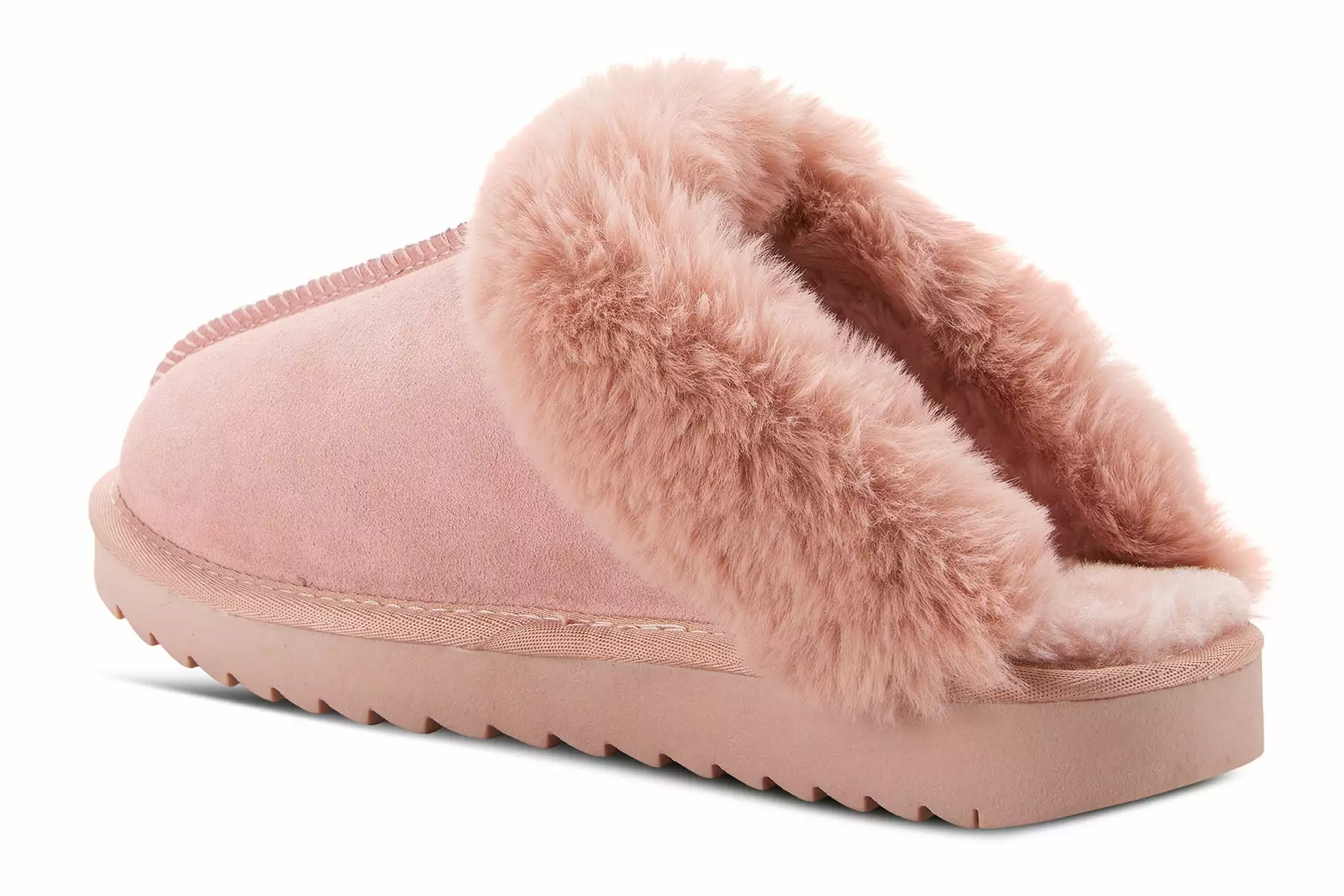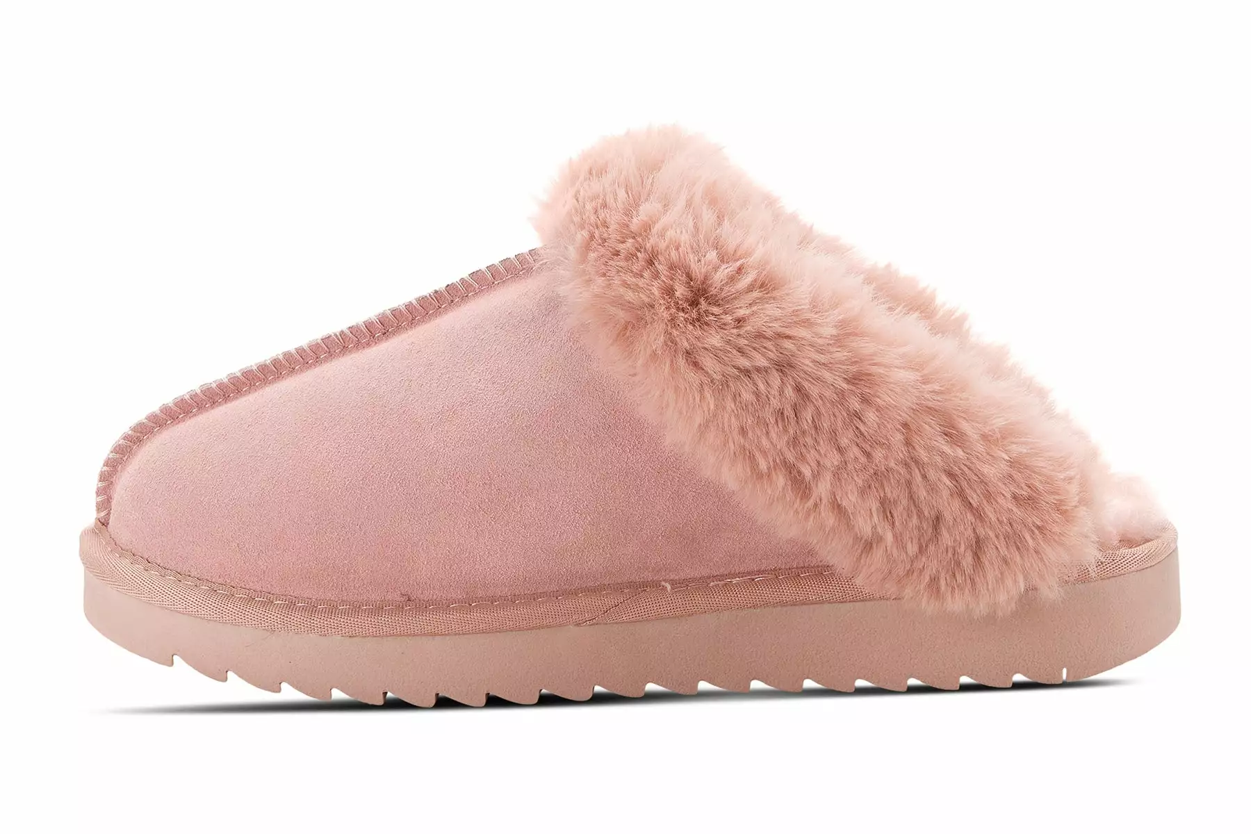 Flexus LINOHEART Indoor slide slipper with suede upper, cozy plush faux fur trim, butt-stitching detail, and cozy lining on a comfortable outsole.