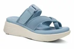 Sporty, fashionable lightweight slide sandal with toe loop featuring lycra stretch and hook and loop fastening all on a full-length padded footbed and durable sole.