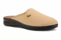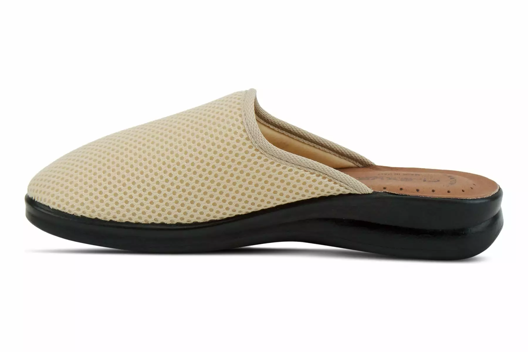 Ultra light weight slipper with mesh textile upper and metal trim design, featuring a full length leather padded footbed all on a flexible direct injection PU wedge sole.