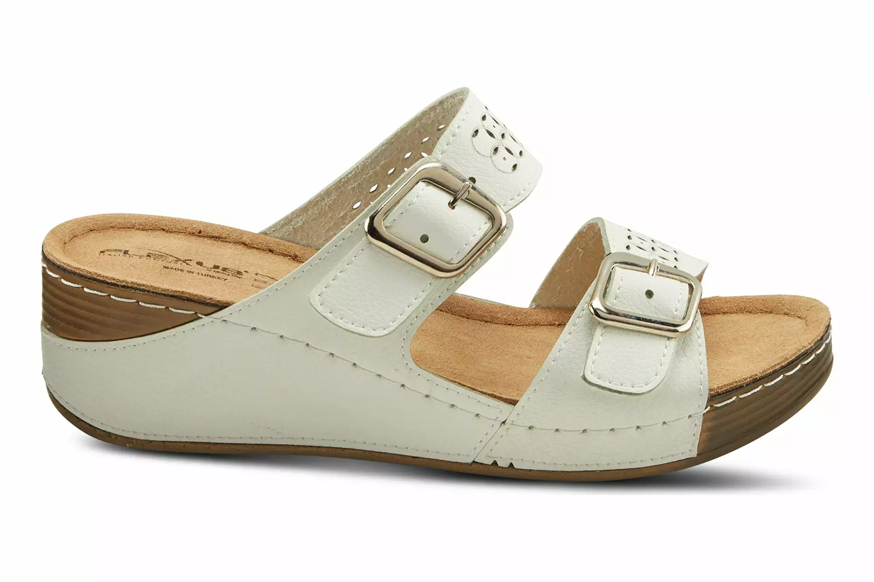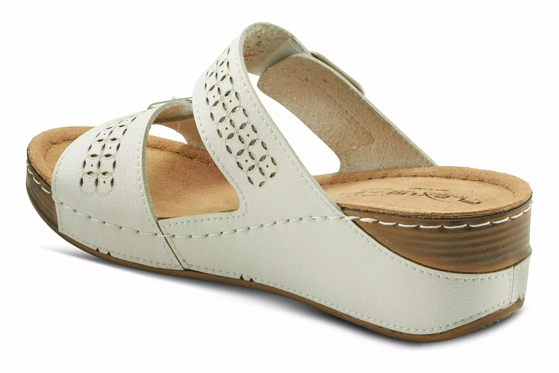 Double-strapped wedge sandal slide with geometric perforated patterns across the upper adjustable hook and loop straps; enriched by decorative buckles.