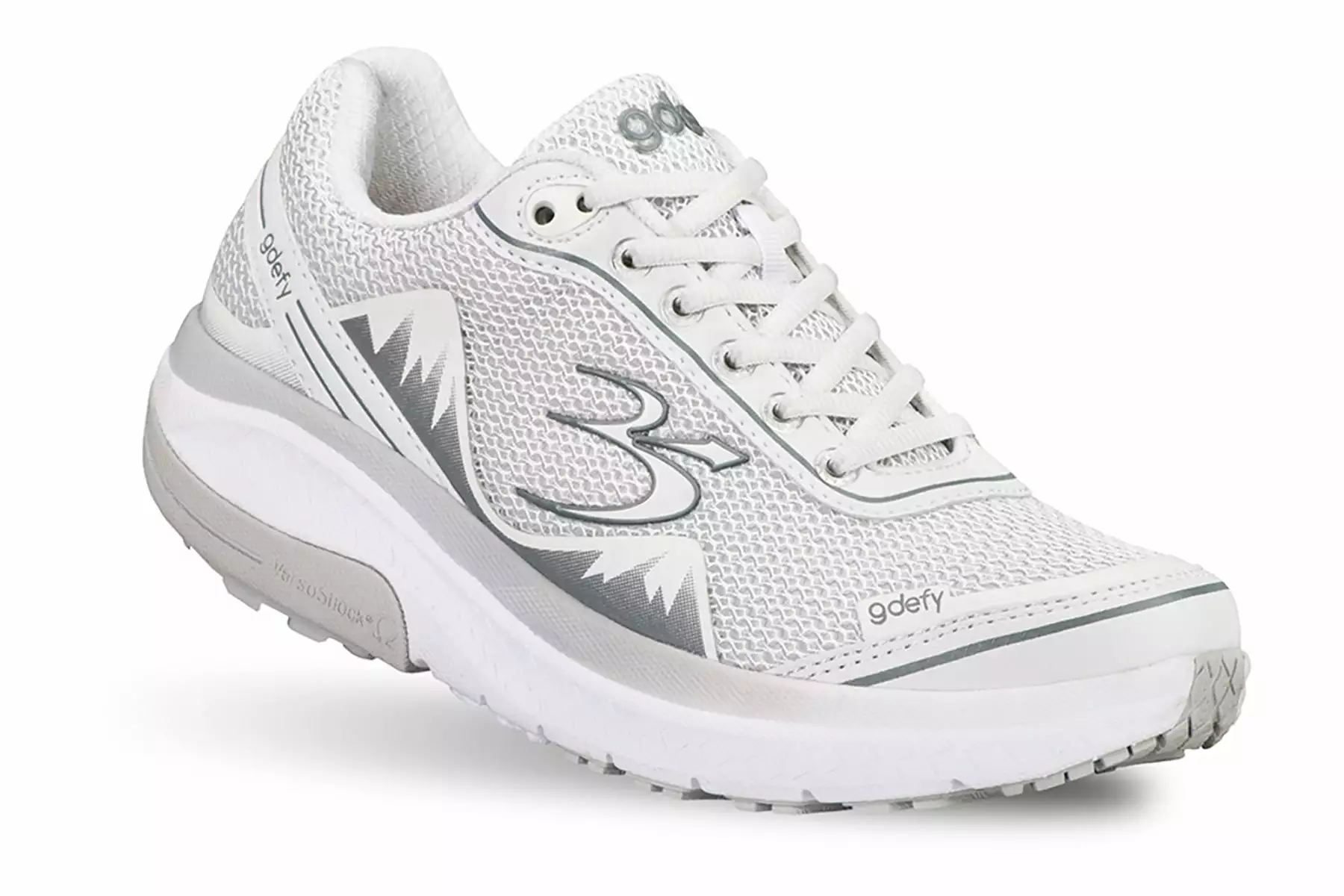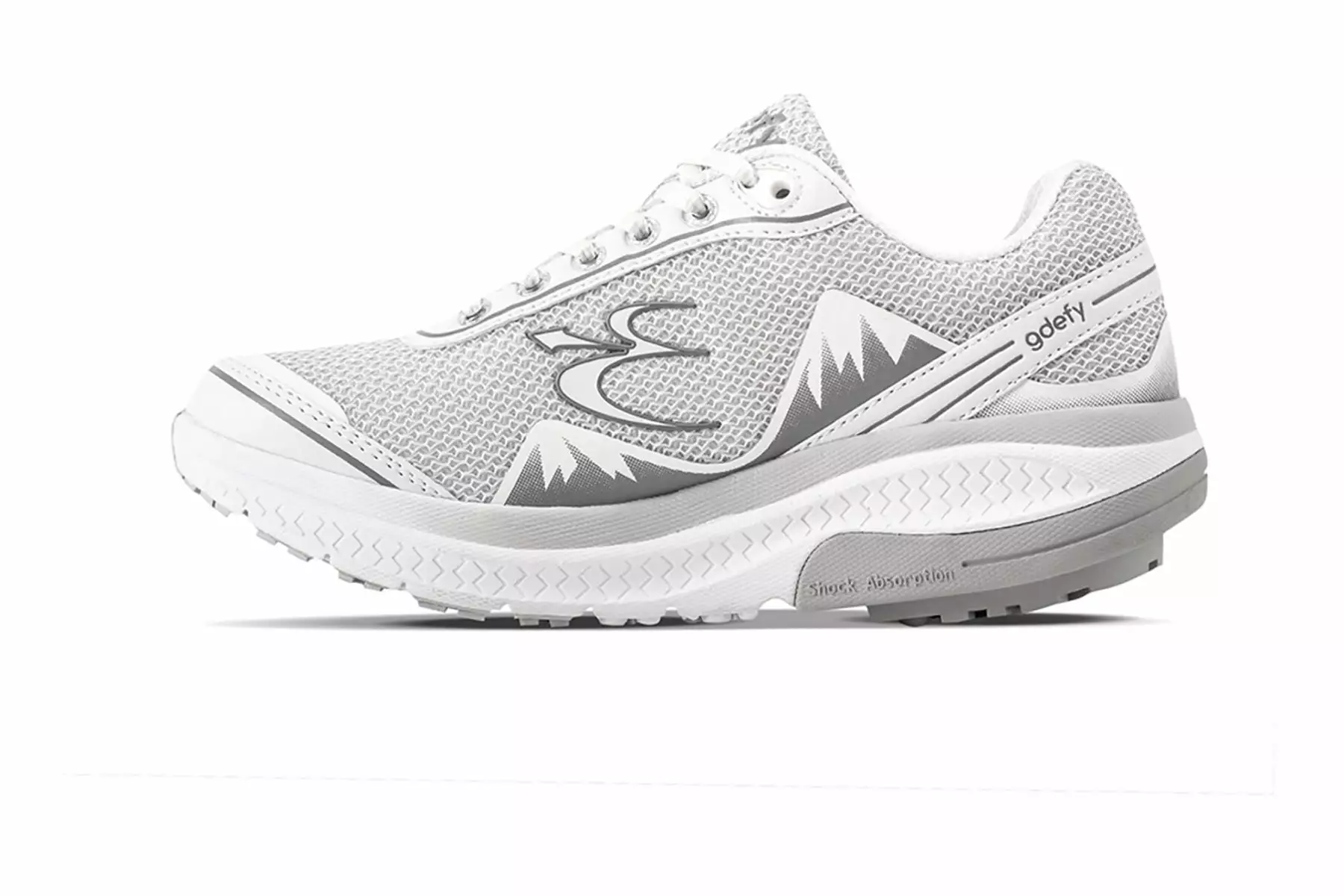 GDEFY Mighty Walk is an active sneaker designed for comfort and stability. VersoShock technology reduces knee pain and a roomy toe box helps blood circulation. A front rolling design relieves foot stress and a durable mesh upper provides breathability, flexibility and ventilation.