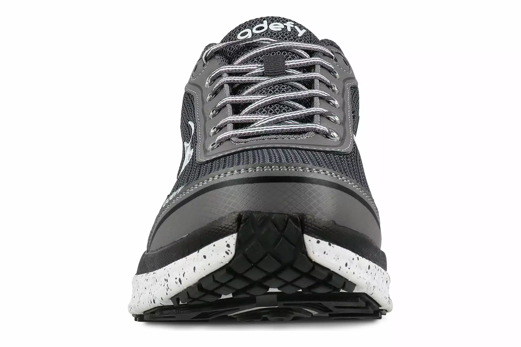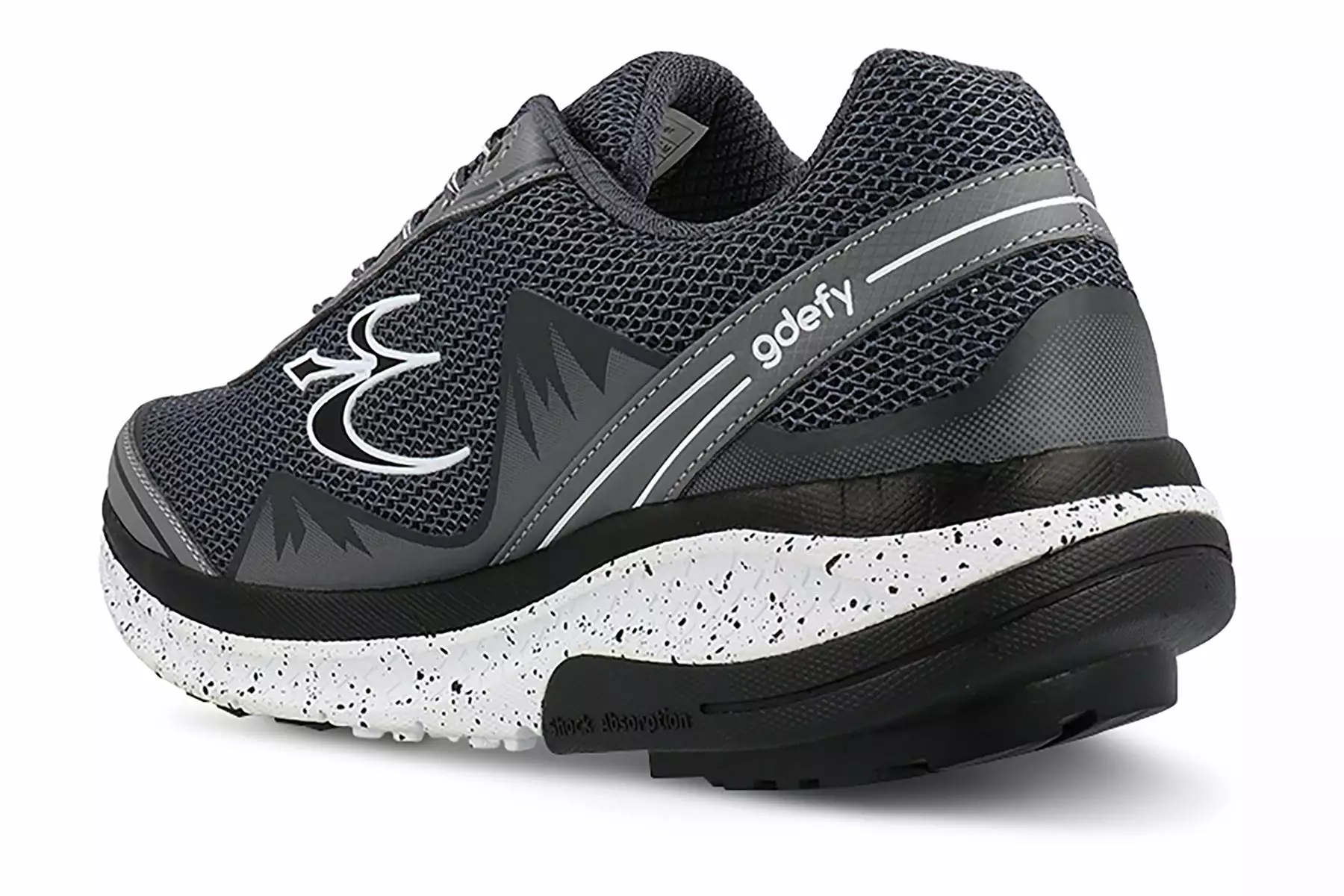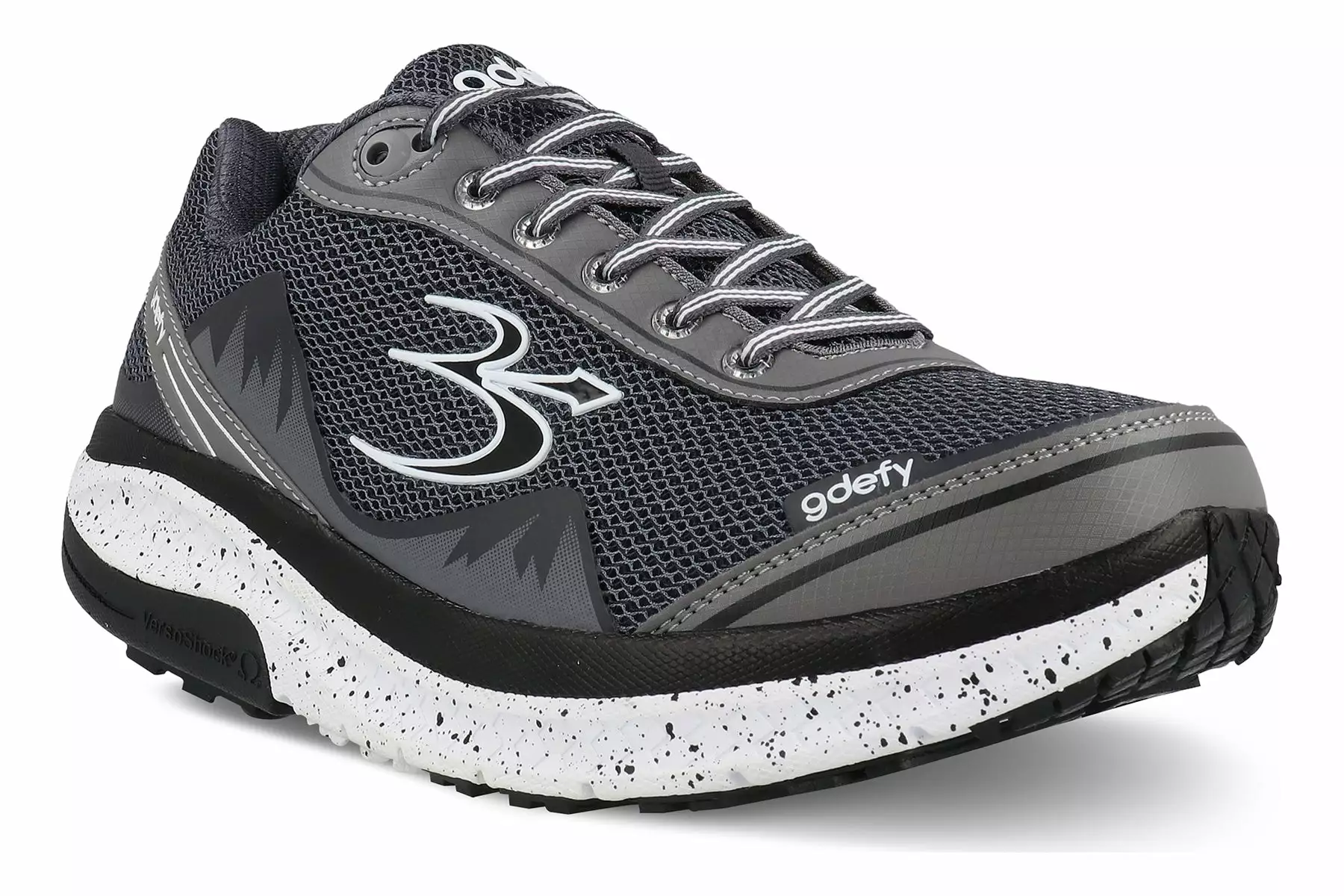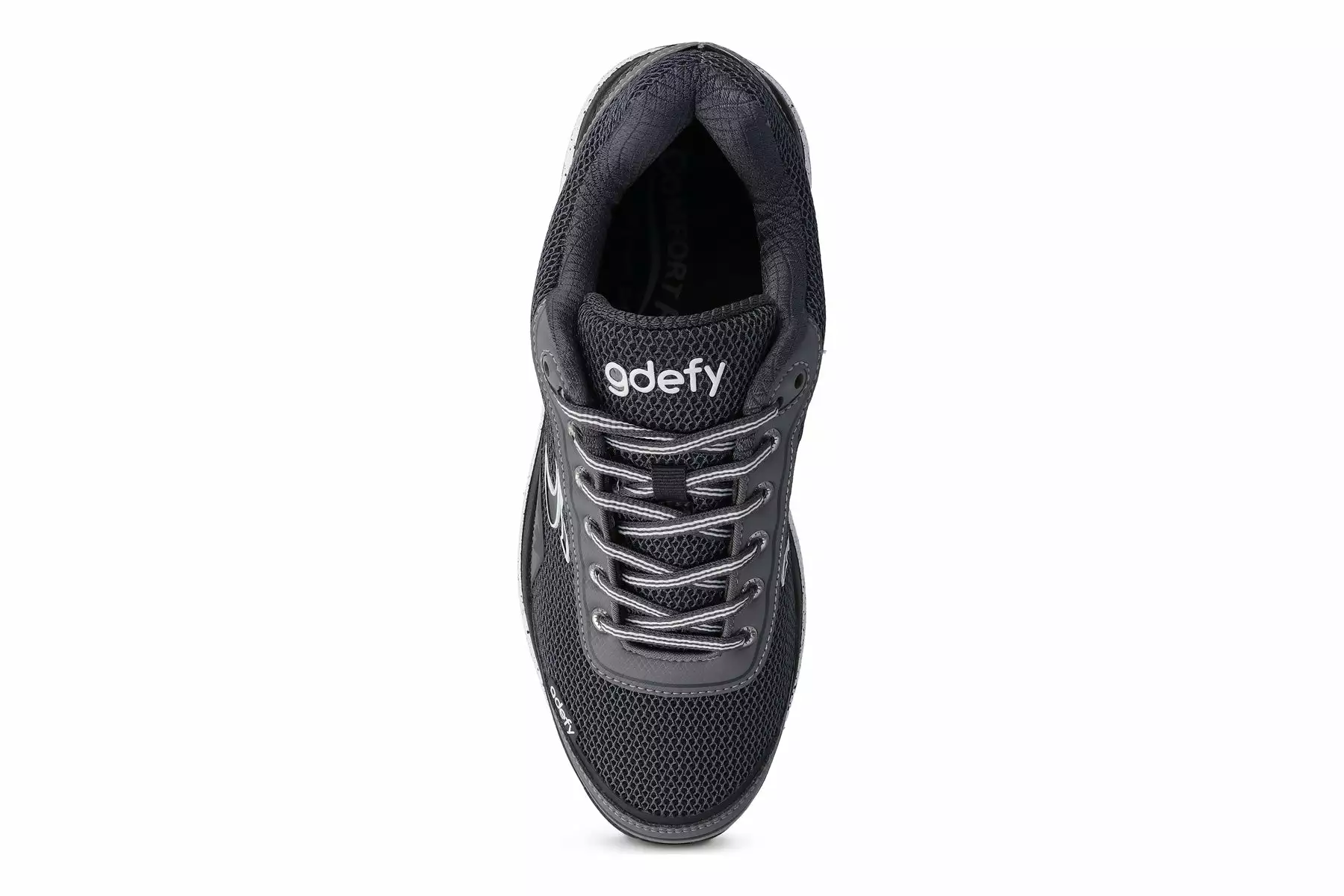 GDEFY Mighty Walk is an active sneaker designed for comfort and stability. VersoShock technology reduces knee pain and a roomy toe box helps blood circulation. A front rolling design relieves foot stress and a durable mesh upper provides breathability, flexibility and ventilation.
