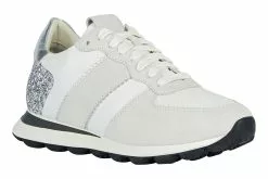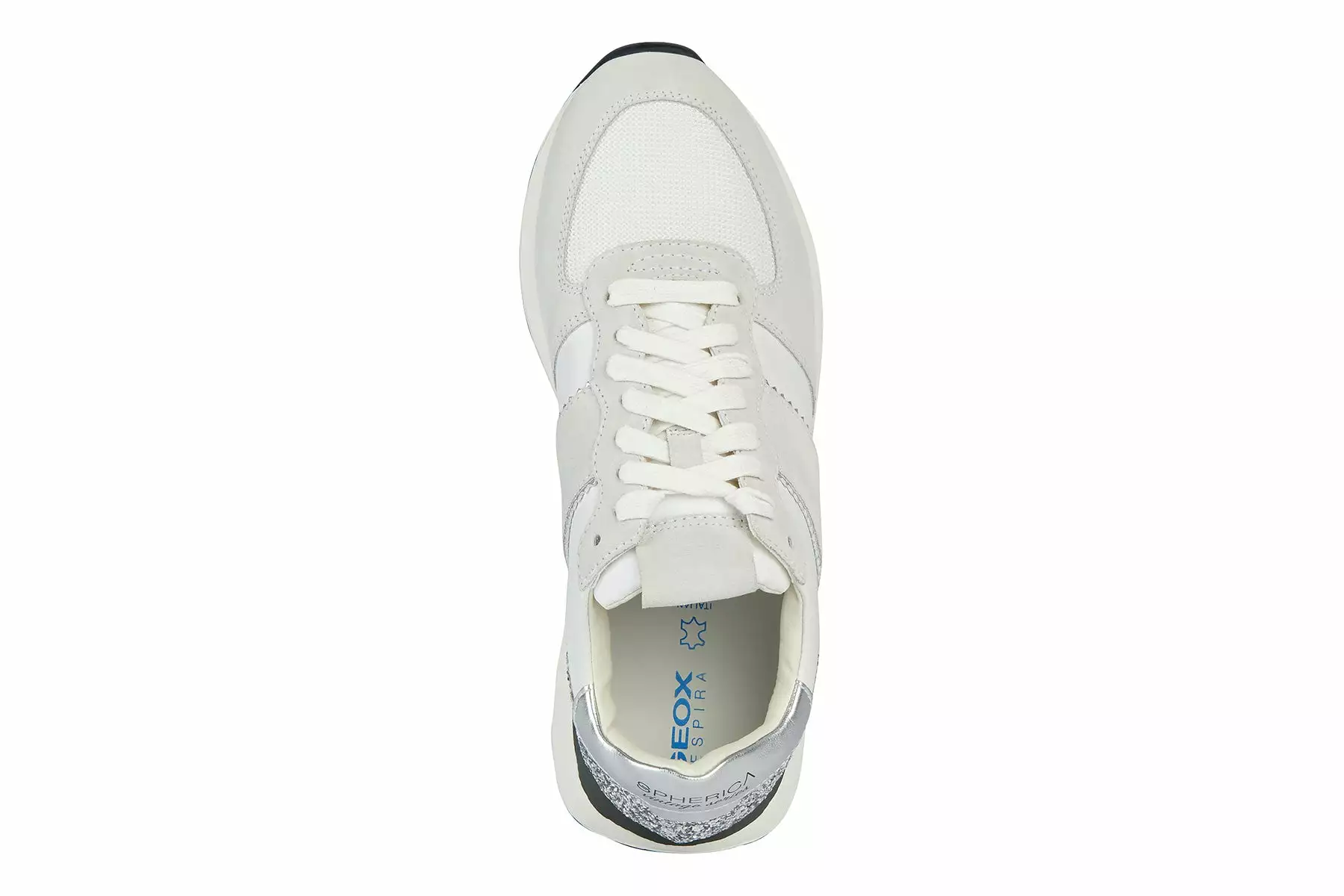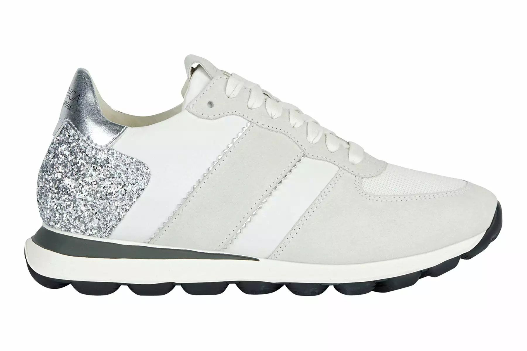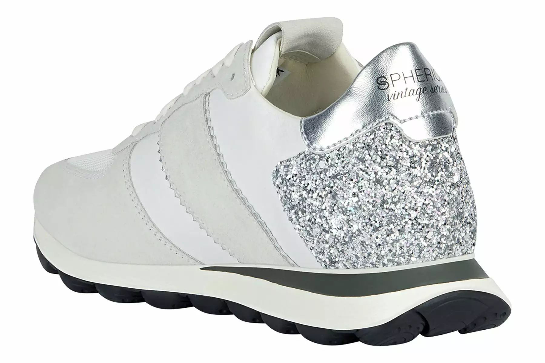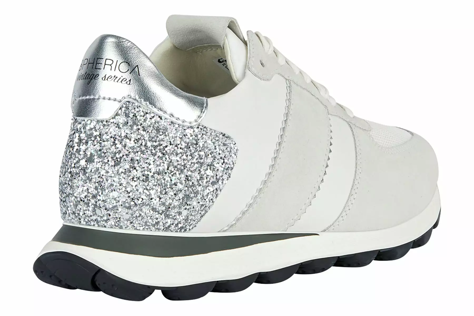 Breathable ultra-cushioned women’s GEOX Spherica Vseries sneaker with a trendy casual appeal. It boasts an eye-catching white upper in suede and nappa featuring a sparkling detail on the heel. Spherica™ VSERIES brings an incredible sensation of softness and lightness to every step along with a glamorous touch. This style runs small; we recommend purchasing a size larger than usual.
