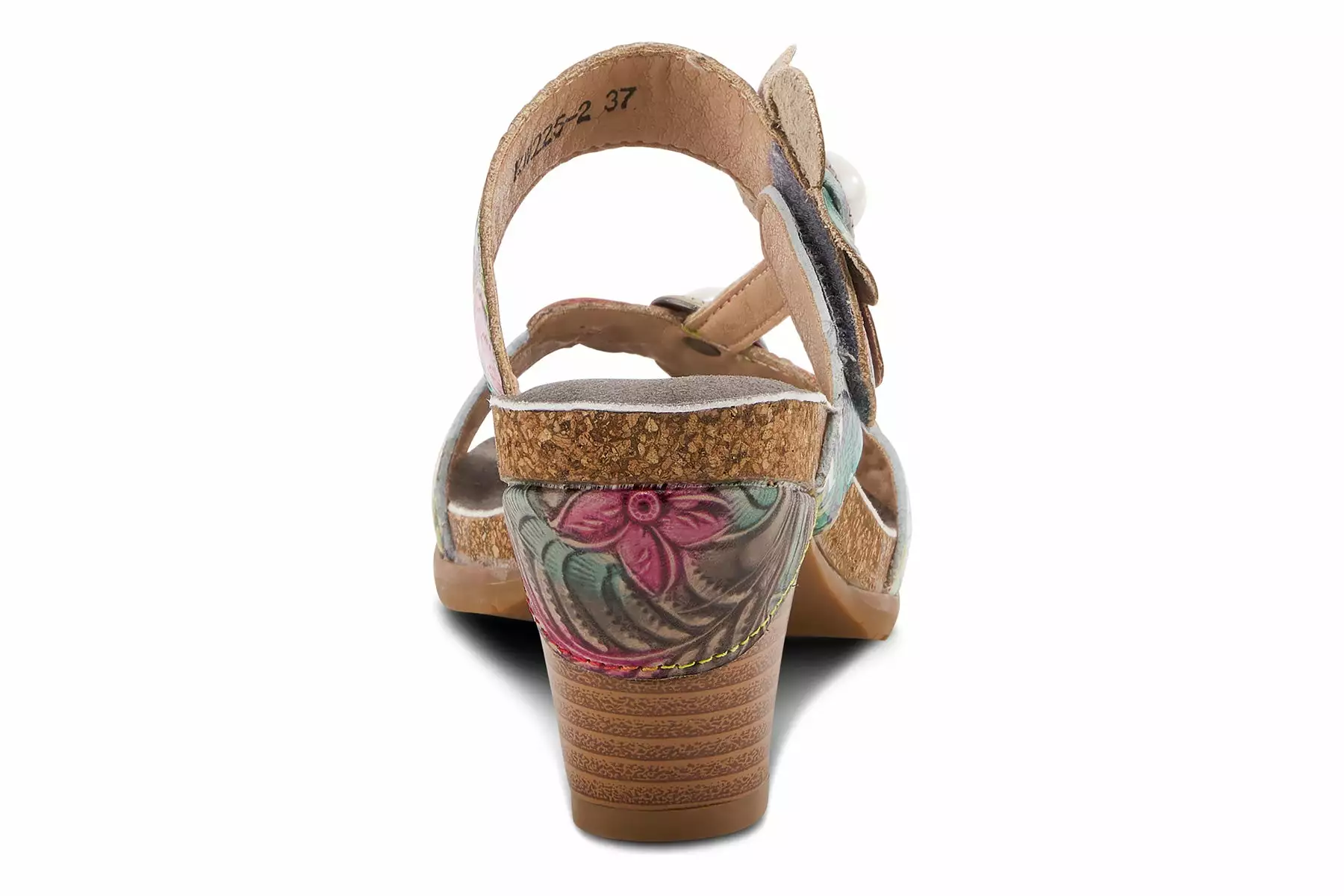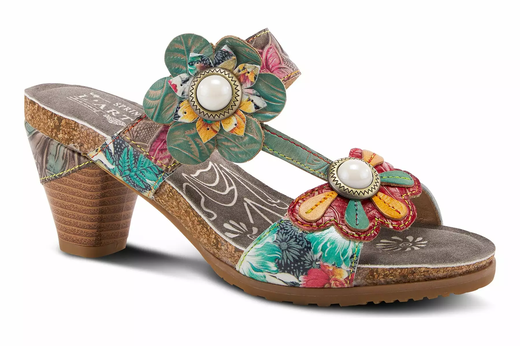 Multicolored embossed leather with asymmetrical attached center cabochon flowers showcases every foot to look fabulous! Super padded contrast etched footbed, cork midsole, leather inset, and stack looked heel.