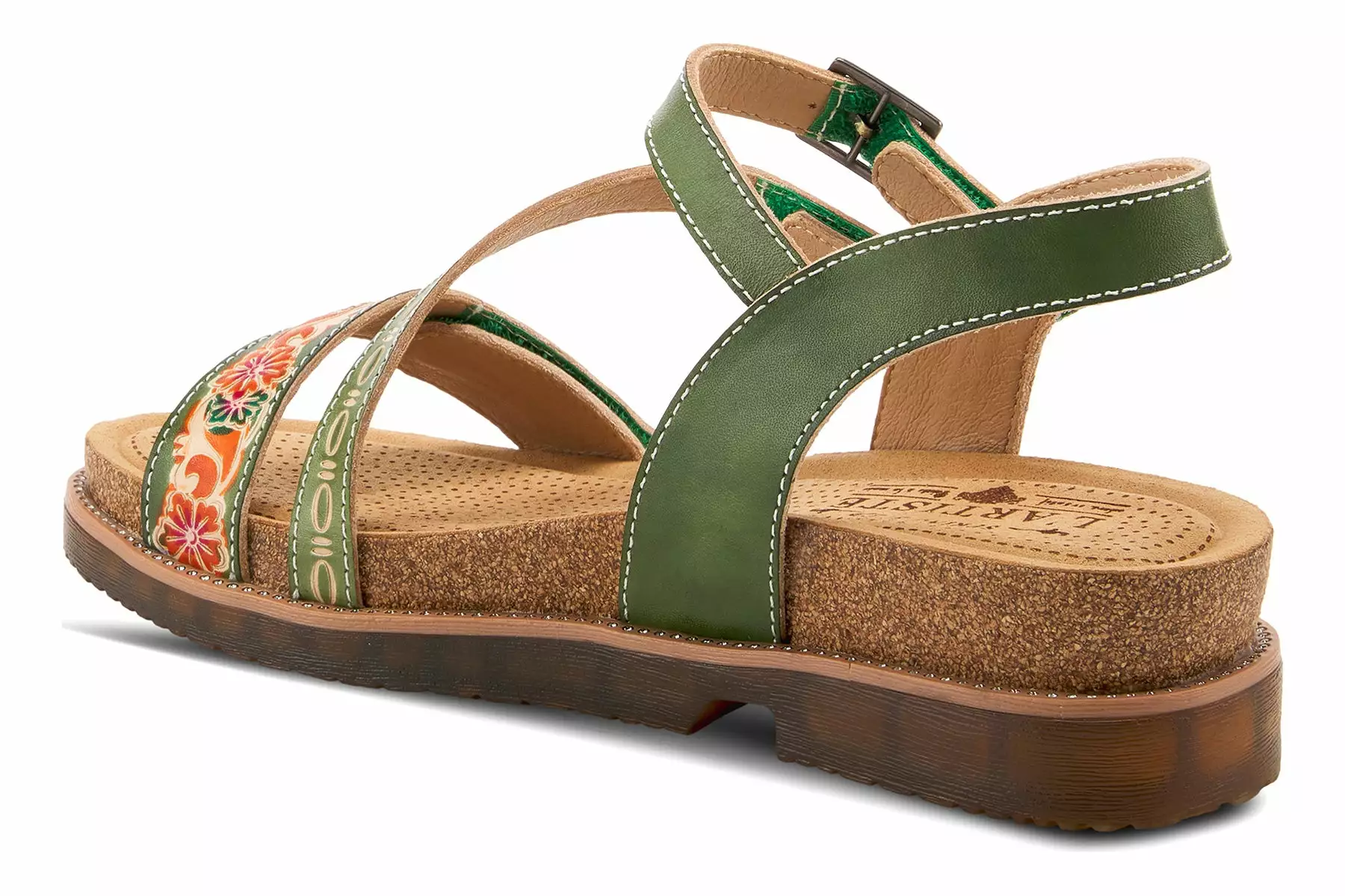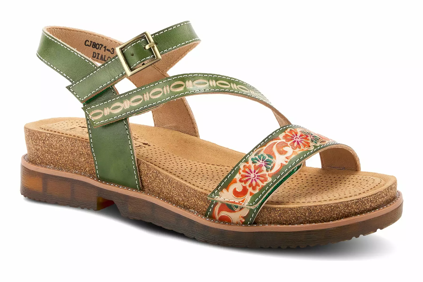 Triple adjustability for the perfect fit. Hand-painted floral/abstract design with cork infuses platform with rhinestone welt design. Slimming asymmetrical strap over the vamp of the foot