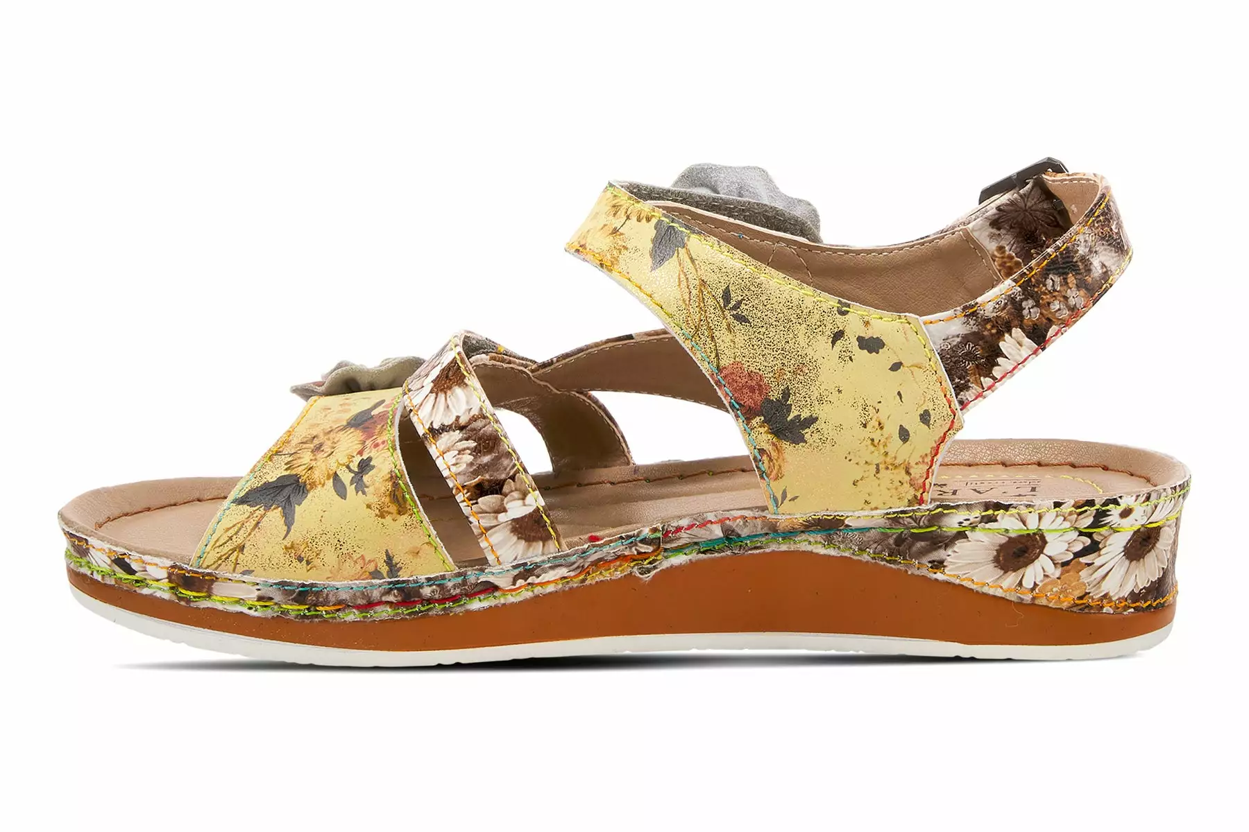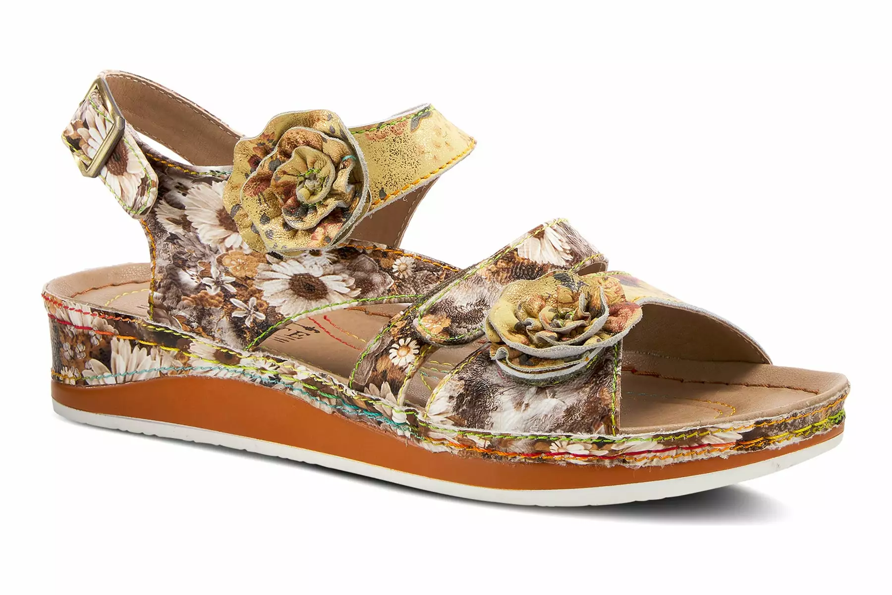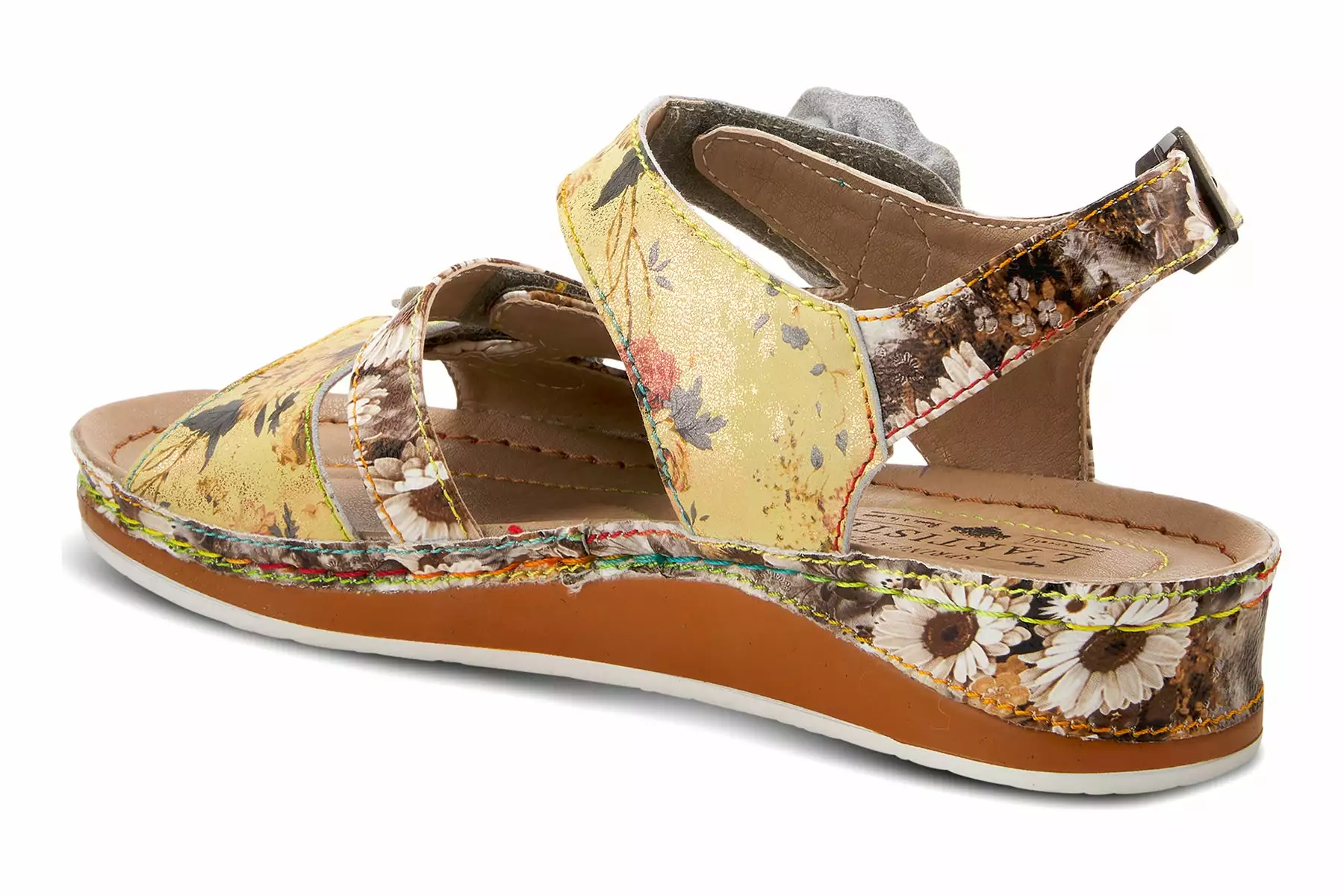 French-inspired design, a hand-painted leather sandal with triple adjustability. Featuring unique color blocking, two rosebuds and our signature rainbow stitching. This is one of our most loved constructions.