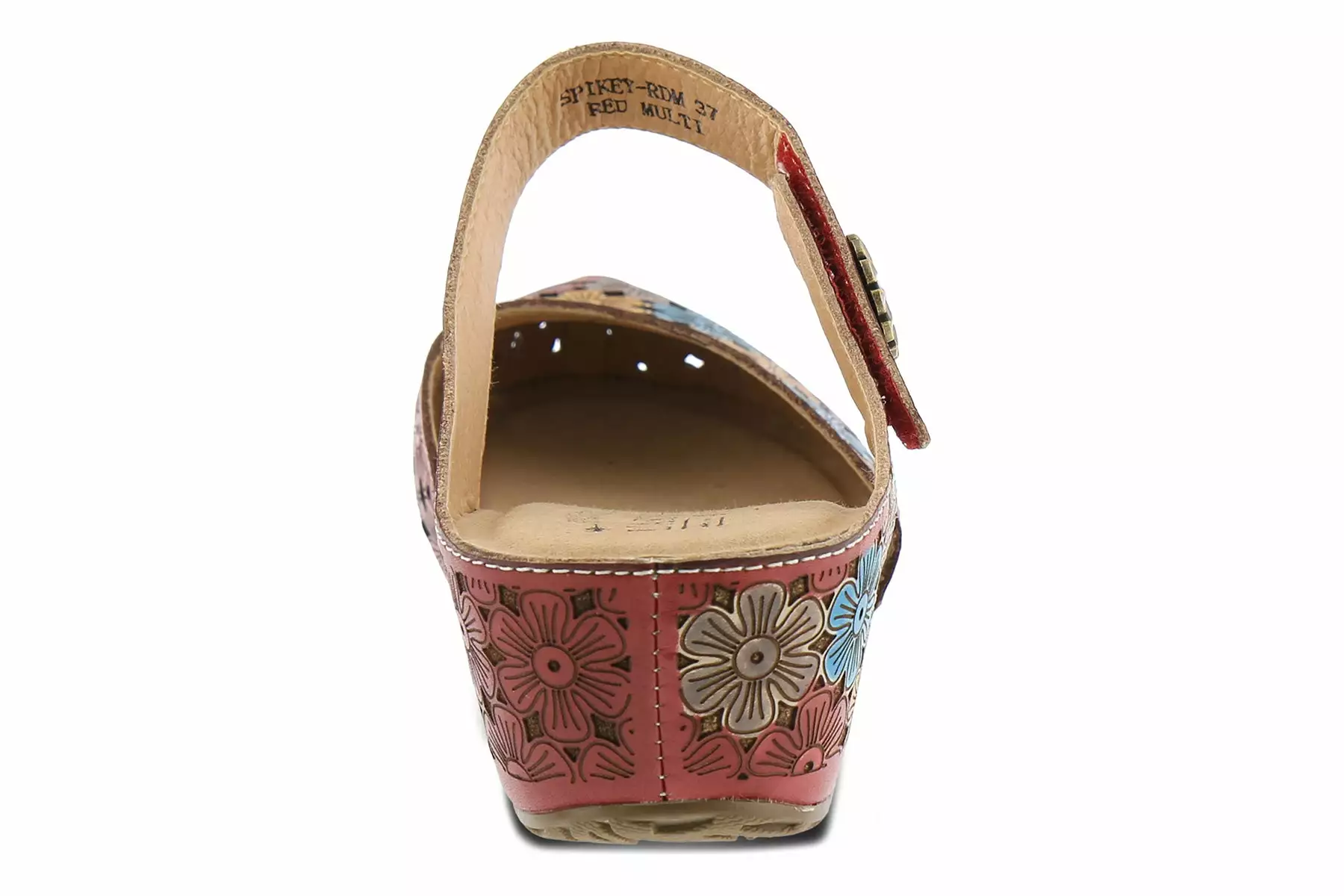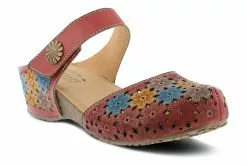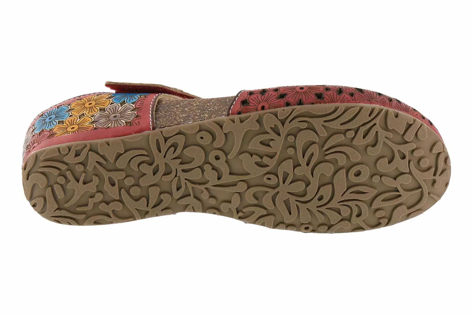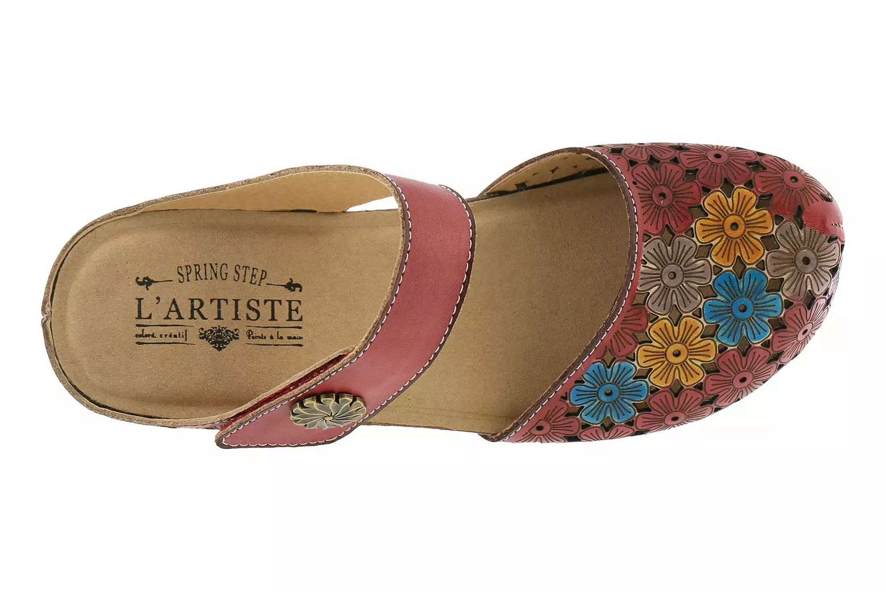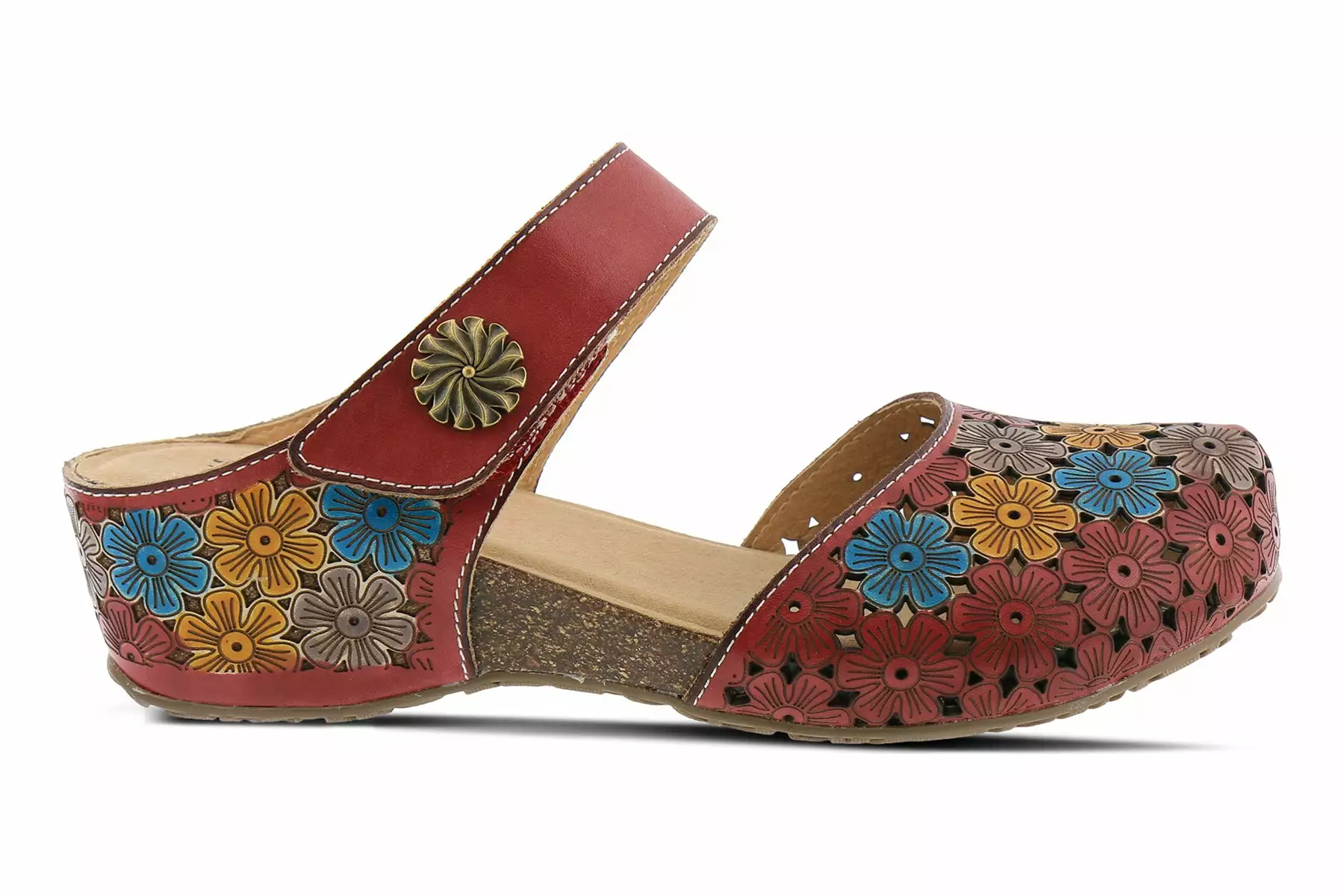 French-inspired, beautiful hand-painted premium leather clog featuring floral laser etching and cutout design, tonal stitchwork, and an adjustable hook and loop instep strap with an antiqued brushed metal ornament all on a cork and latex-wrapped, comfort wedge with a platform.
