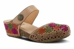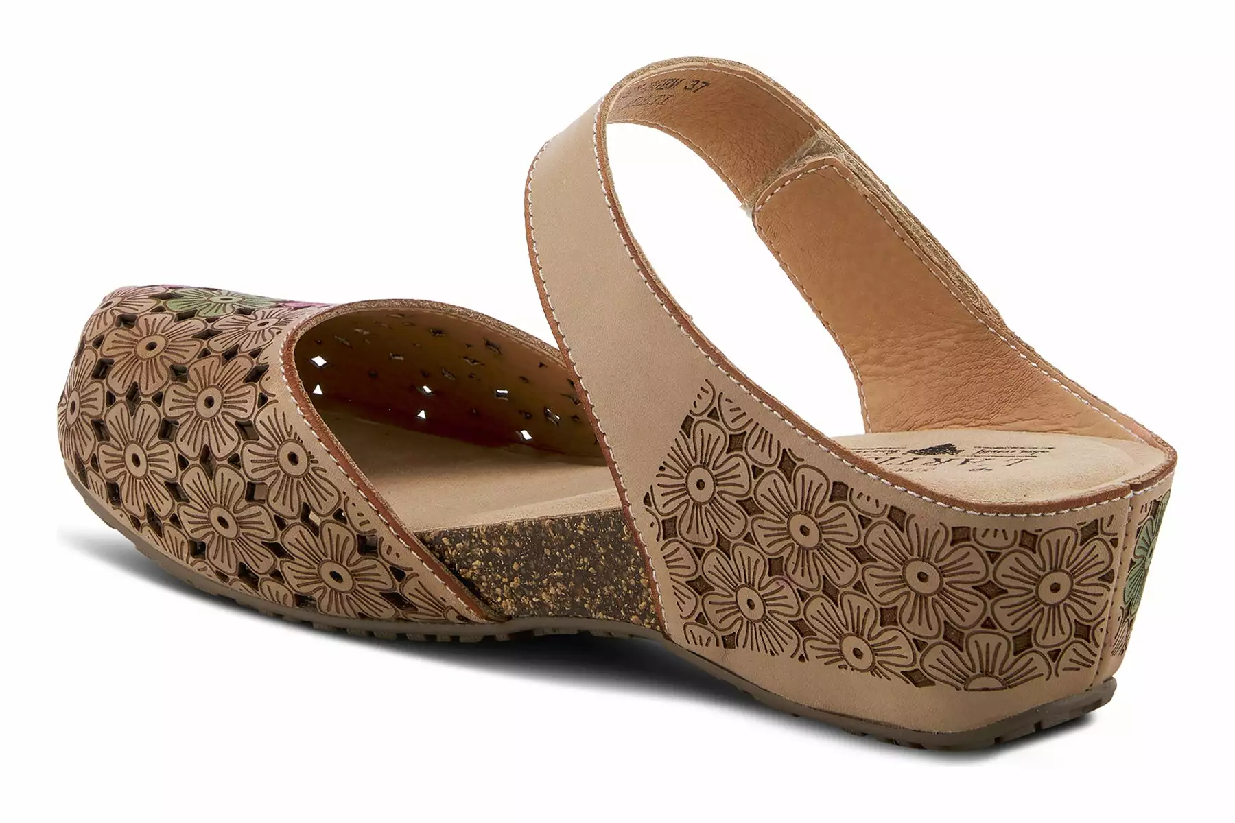 French-inspired, beautiful hand-painted premium leather clog featuring floral laser etching and cutout design, tonal stitchwork, and an adjustable hook and loop instep strap with an antiqued brushed metal ornament all on a cork and latex-wrapped, comfort wedge with a platform.