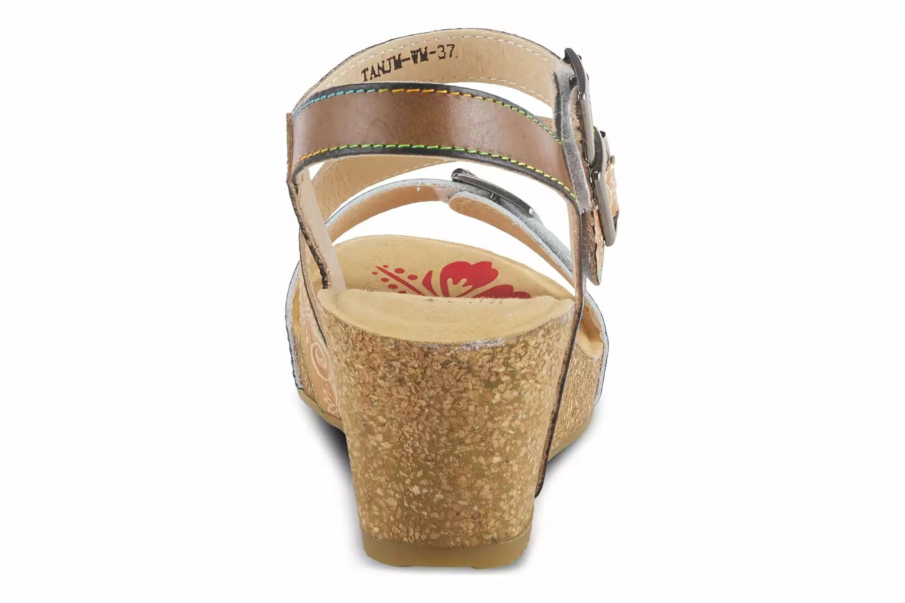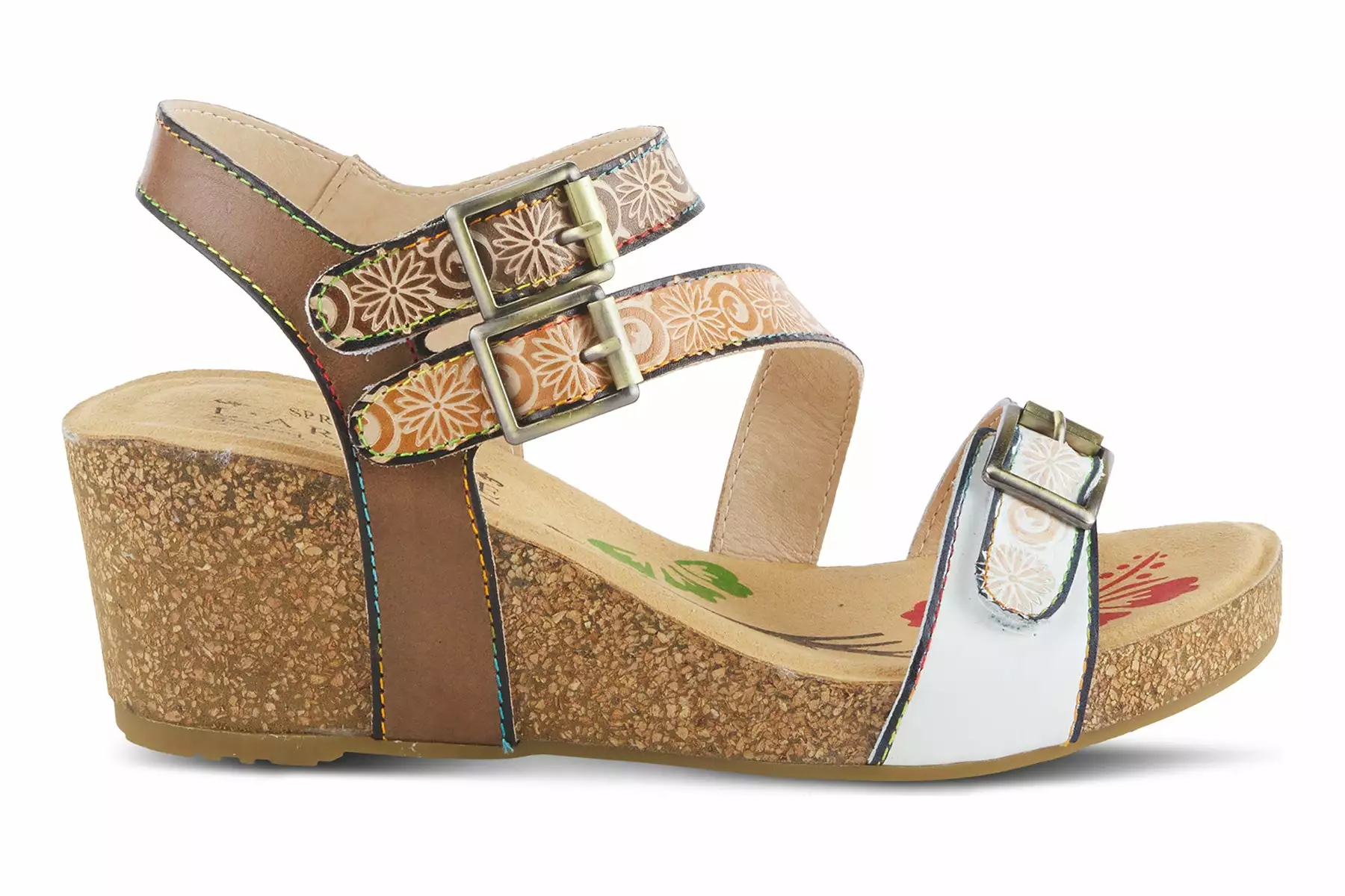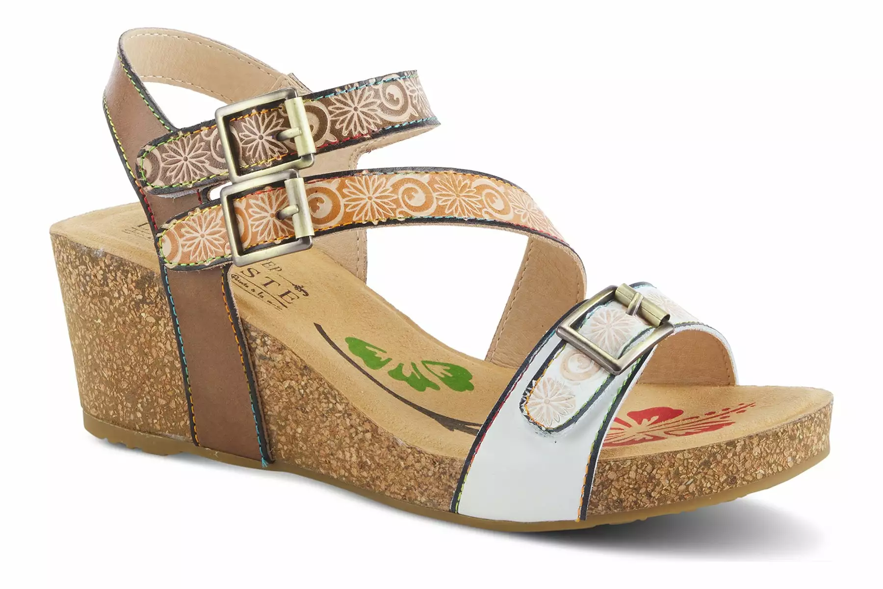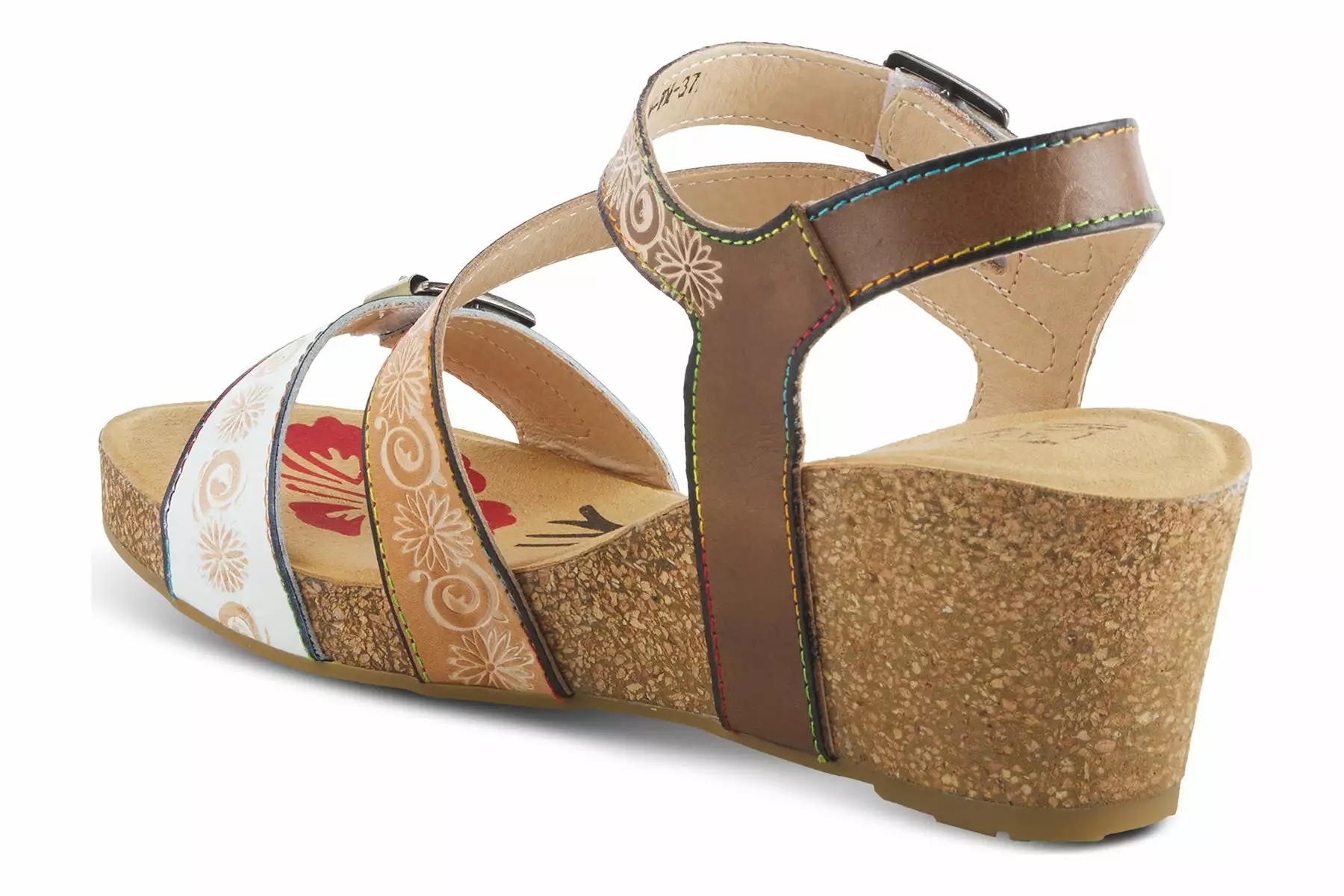 French-inspired, beautiful hand-painted premium leather asymmetrical quarter strap sandal featuring a floral embossed pattern, tonal stitchwork, and three (3) adjustable hook and loop straps all on a cork-infused, comfort wedge with a platform.