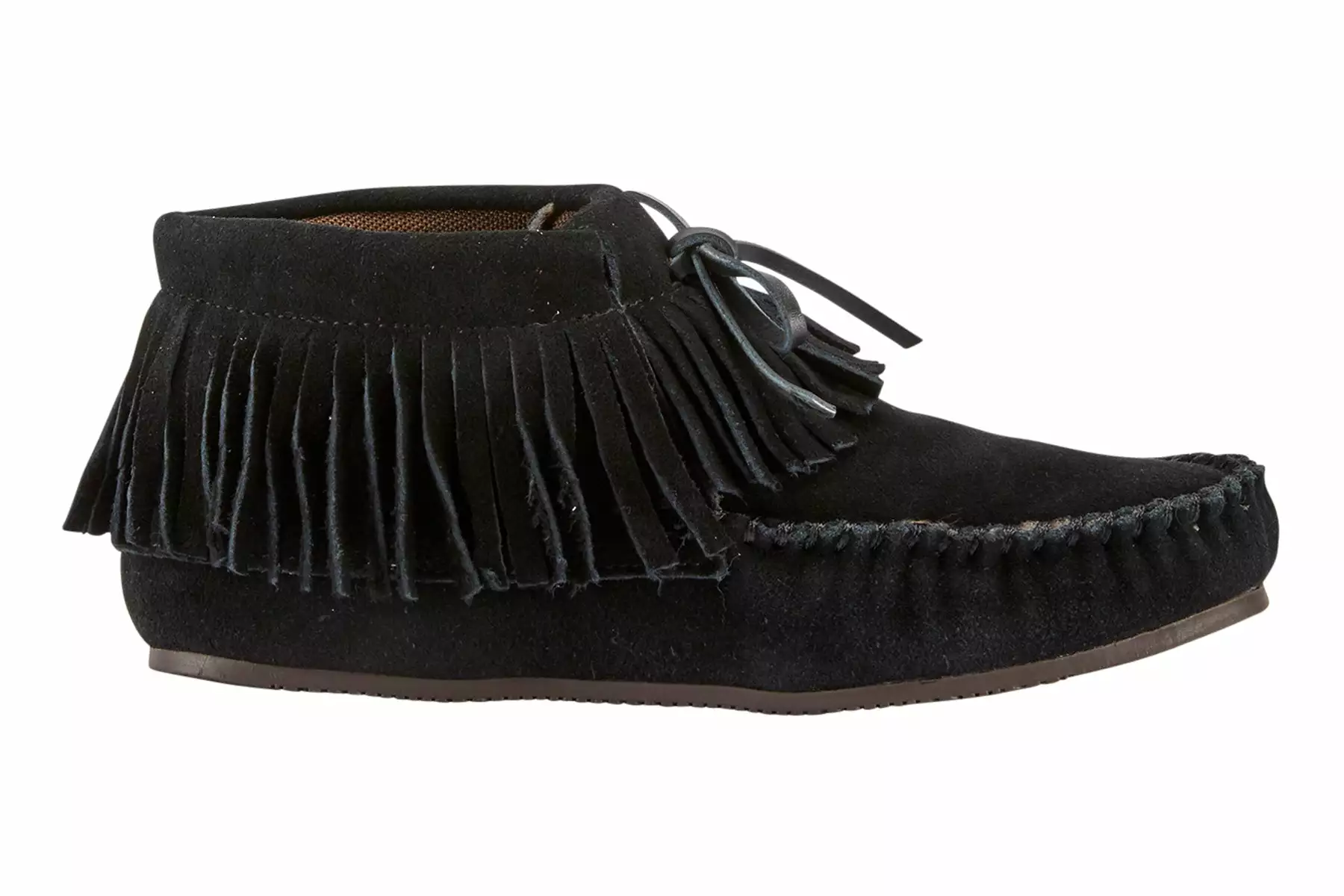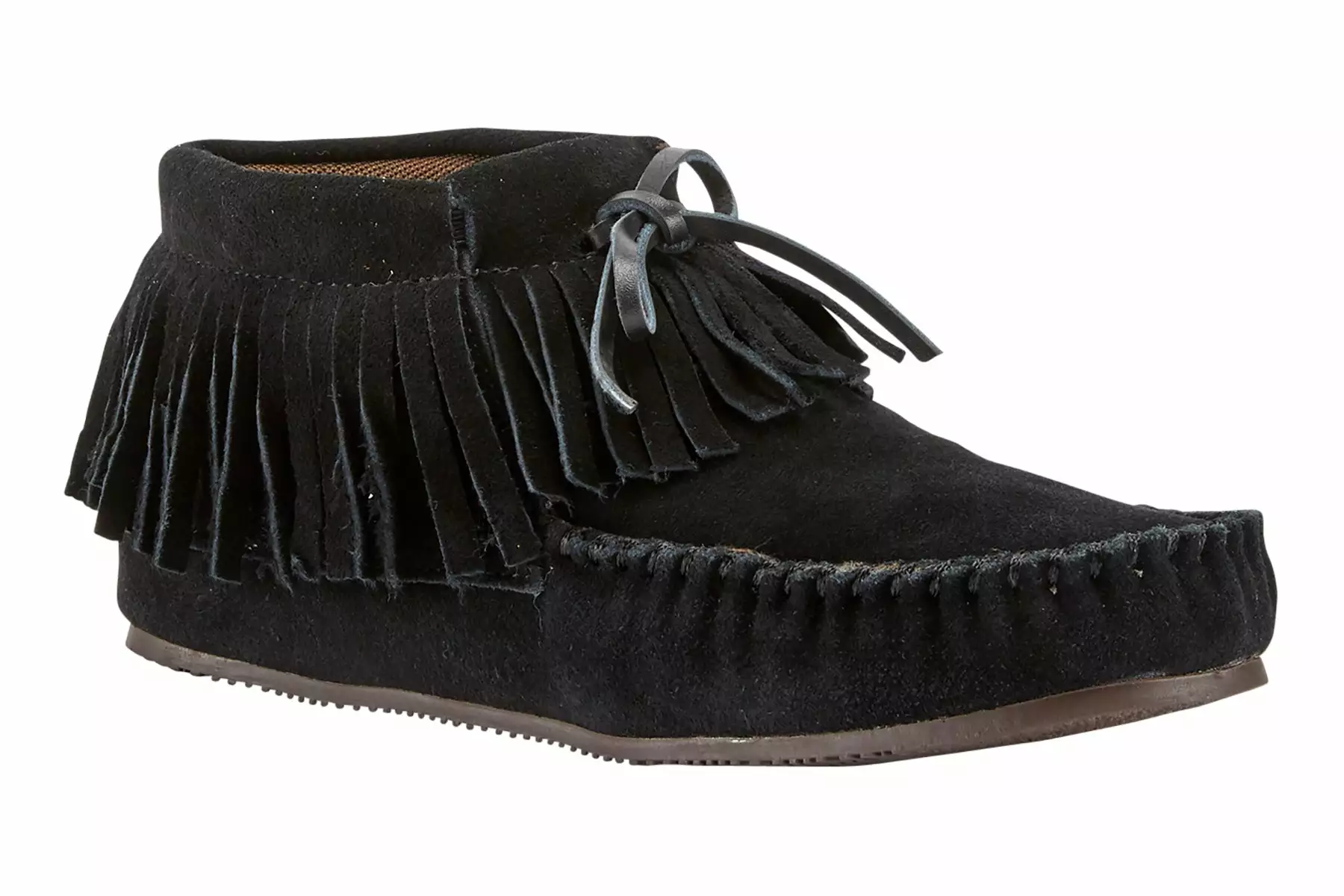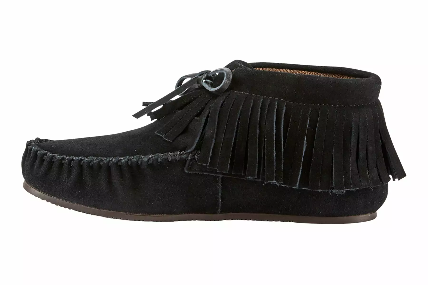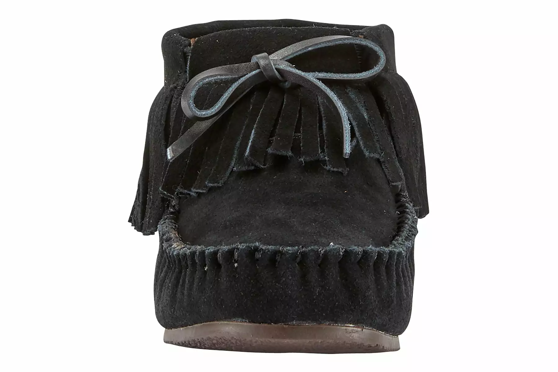 Crafted from a premium suede or textile upper, this moccasin ankle boot let?s the fringe flow. A decorative leather lace ties it all together as it sits atop a flexible low profile TPR outsole.