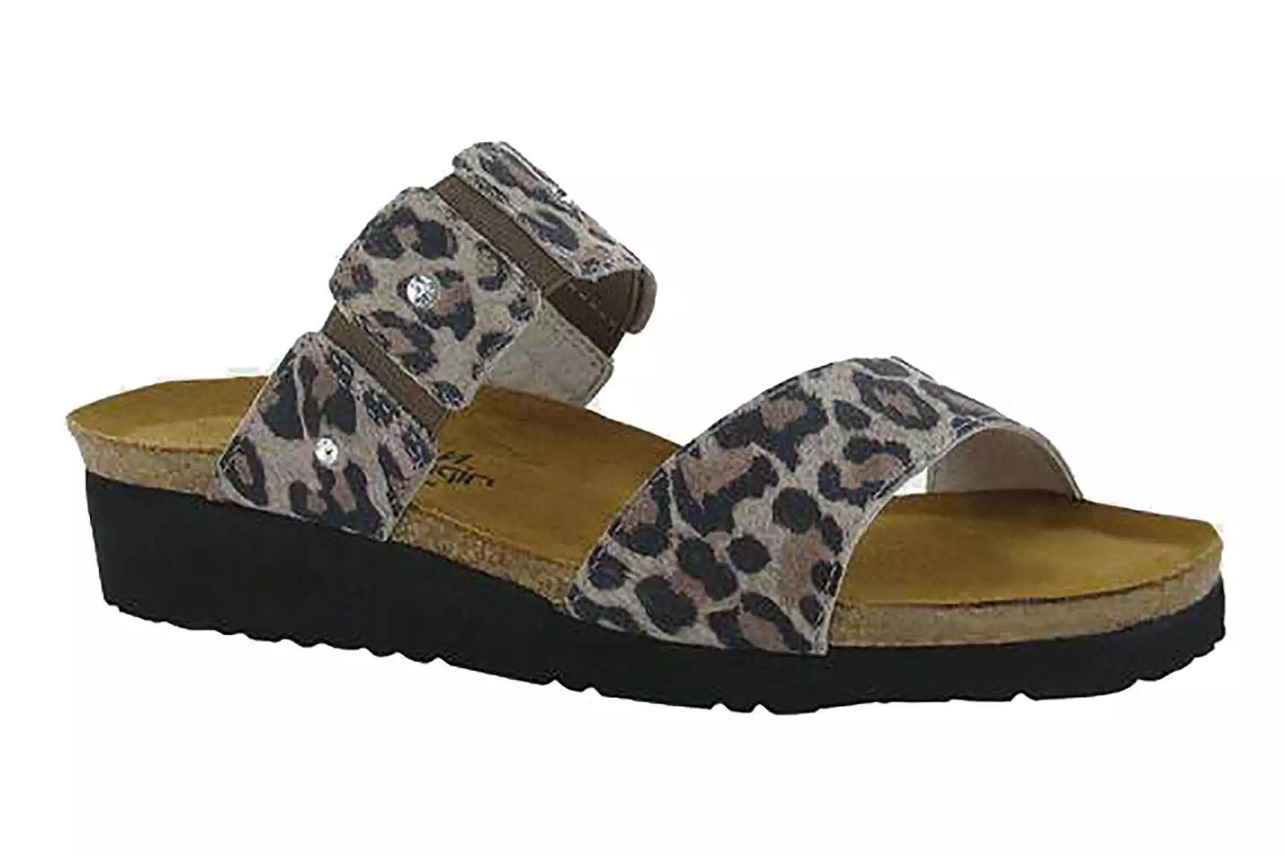 The Naot Ashley is a feminine slide sandal with rhinestone accents across the instep and gore for adjustability. Naot’s anatomic cork & latex footbed is wrapped in pampering suede and molds to the shape of the foot with wear.