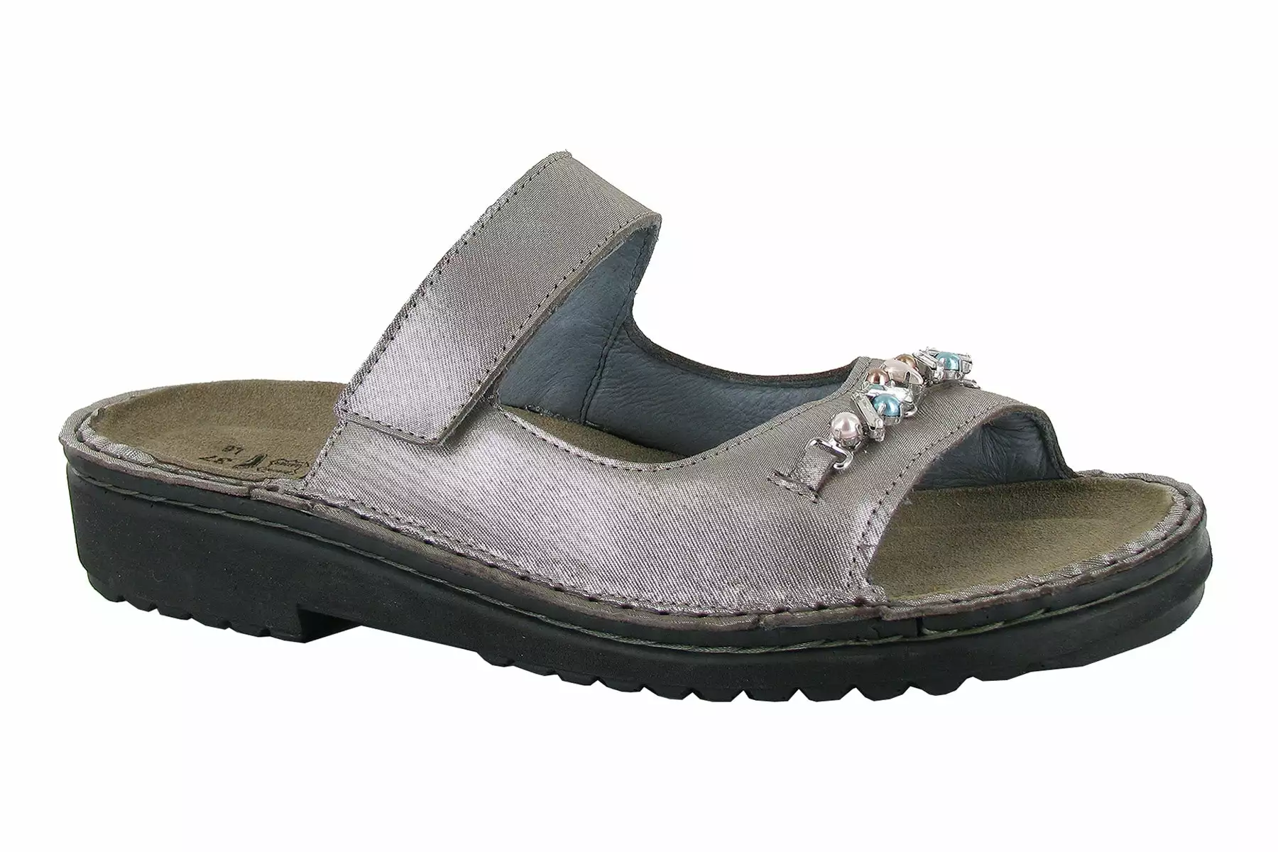 Naot Johanna is a stylish sandal with delicately crafted rhinestones on the toe strap. Naot’s removable, anatomic cork & latex footbed is wrapped in pampering suede and molds to the shape of the foot with wear. The Scandinavian Collection features a 1.25″ polyurethane sole which is extremely lightweight and durable.