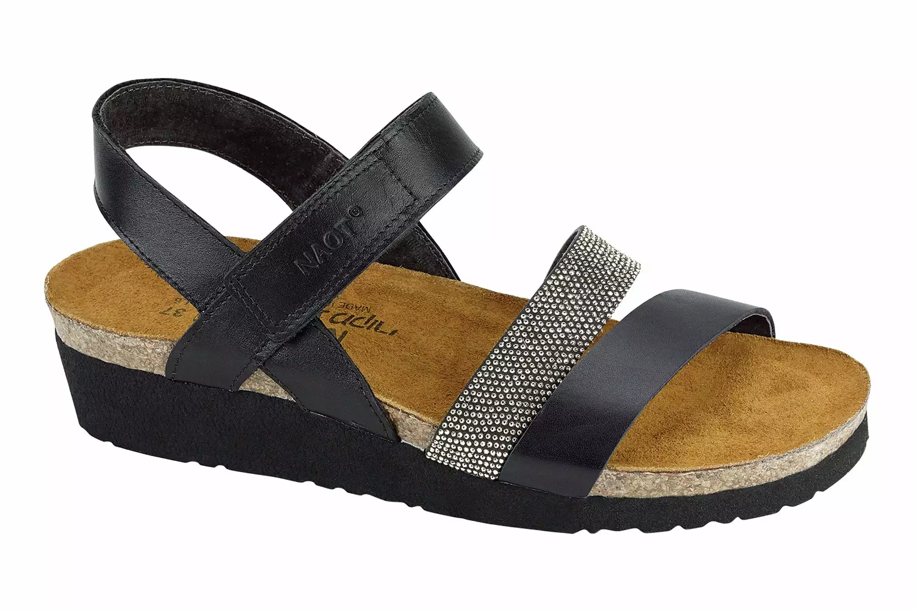 Naot Krista is a secure and comfortable slide sandal. These chic slides have 3 supportive leather straps, rhinestones, cork and latex footbed and a shock absorbent sole. A hook and loop strap makes for easy on and off, while multiple upper colors create a unique and stylish sandal.