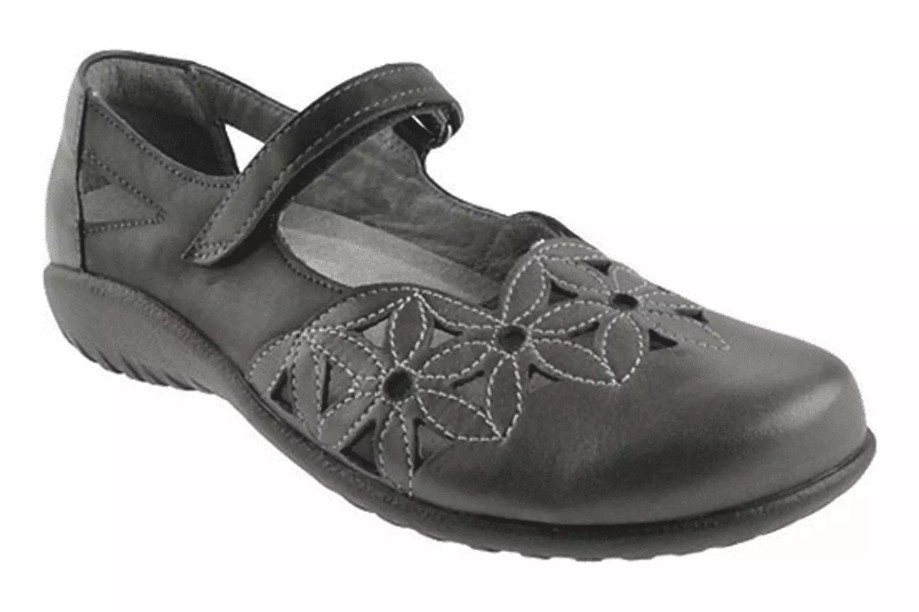The womenโs Naot Toatoa is a classic mary jane for the office. A premium leather and metallic leather upper has an adjustable instep strap with hook and loop closure for optimal fit. A removable, anatomical, suede covered cork and natural latex footbed will ensure comfort throughout the day, while a leather lining will make sure that your foot stays dry. A polyurethane sole will provide the ultimate in durability and traction