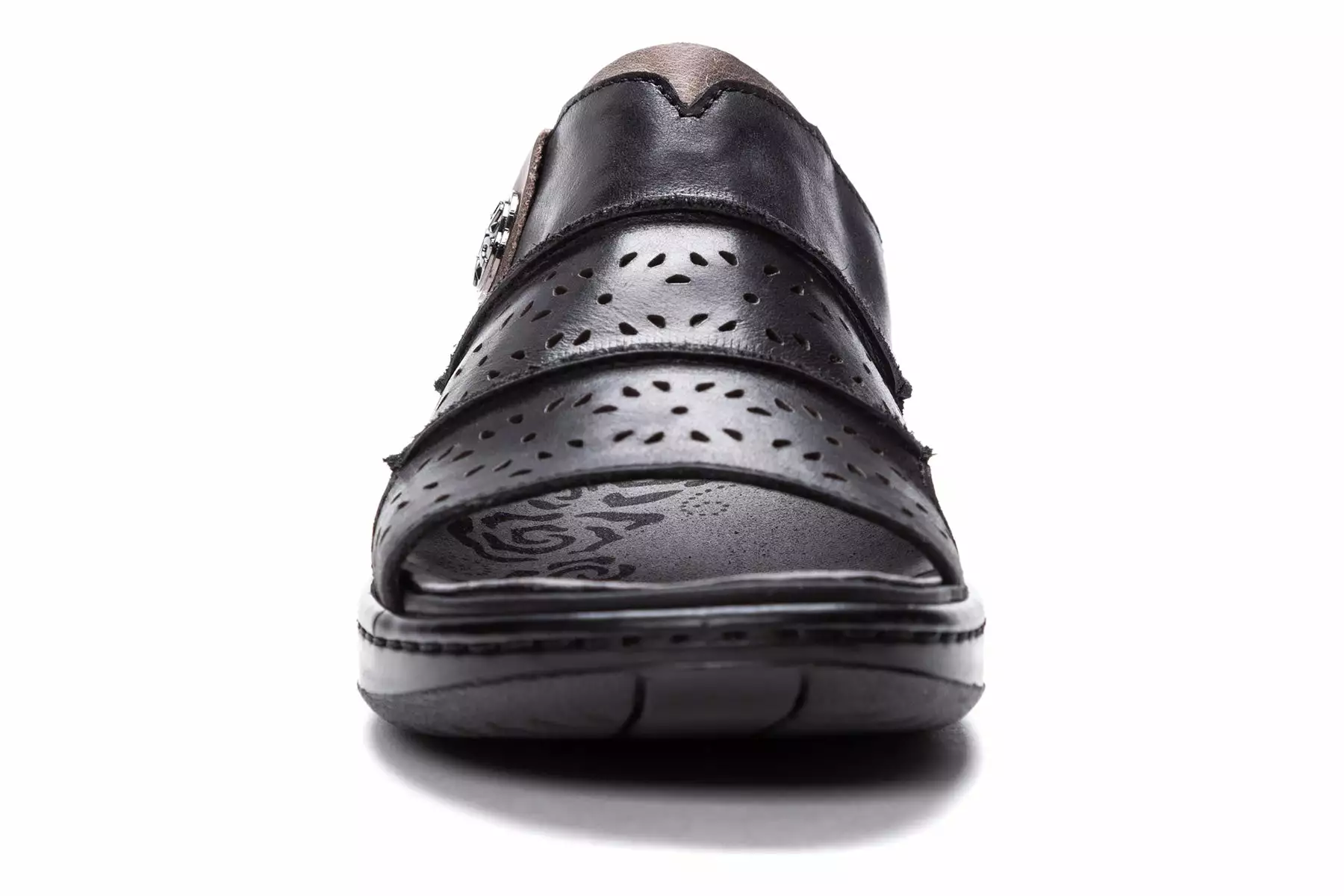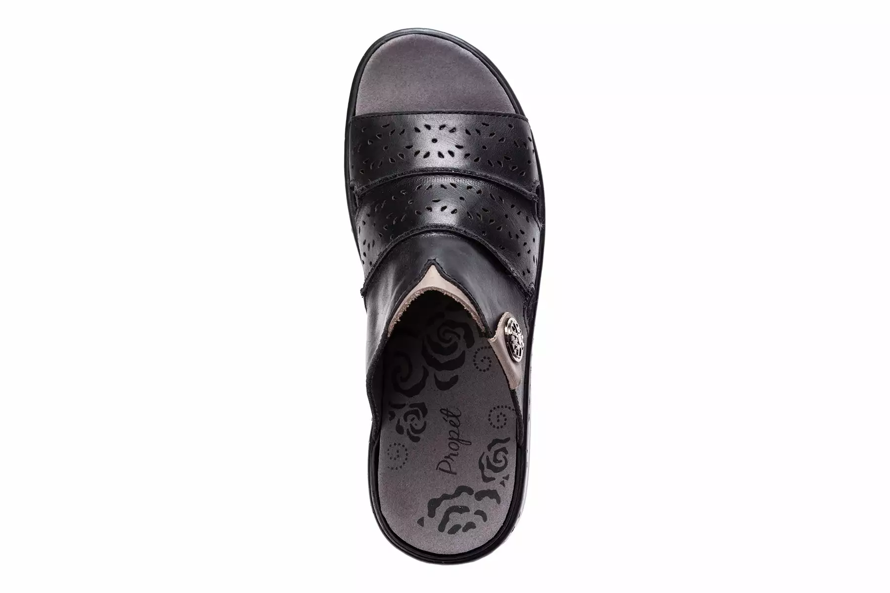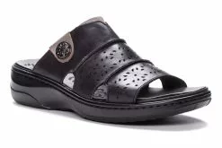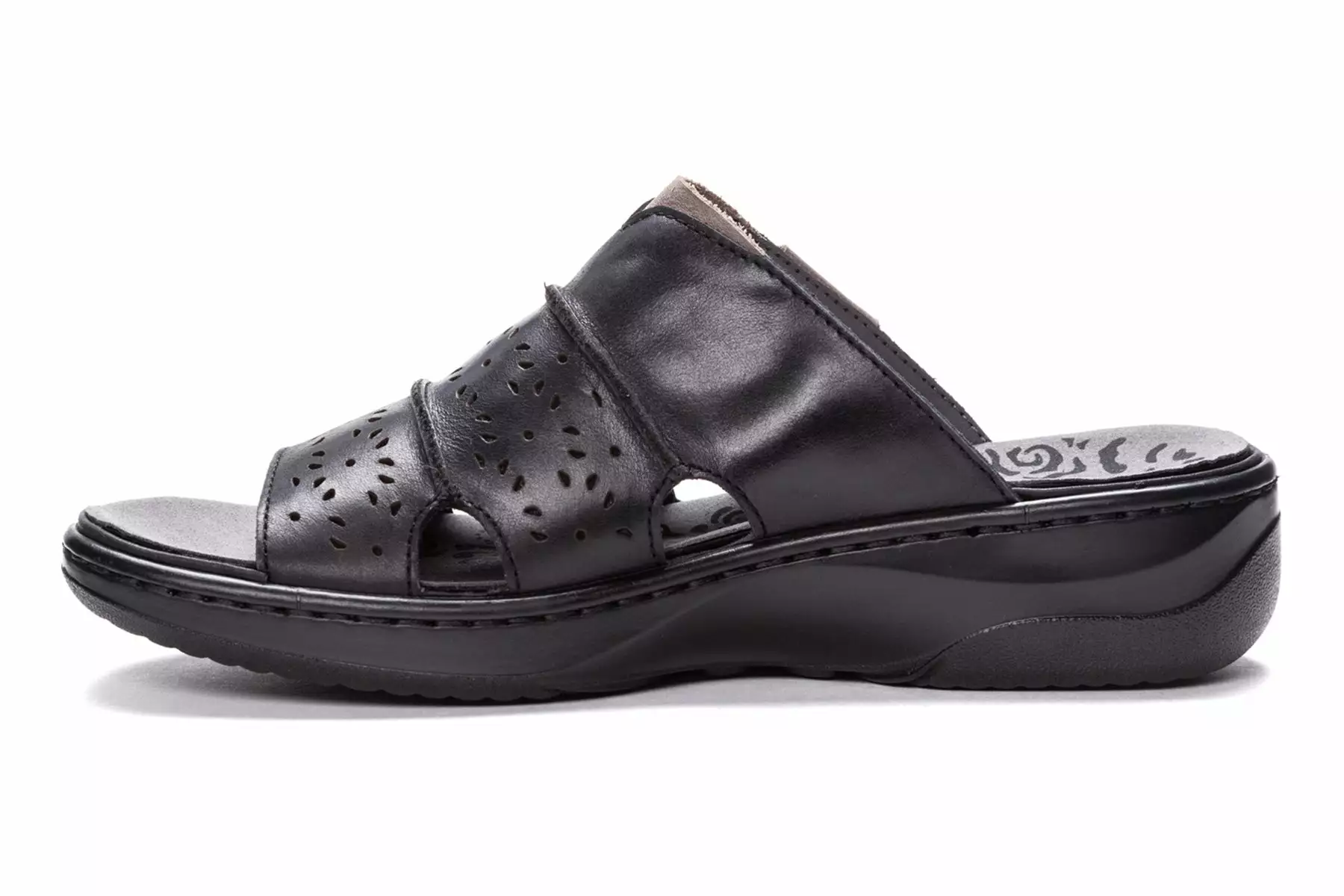 Slide sandal with laser-cut detailing and medallion embellishment. Extra-cushioned, removable PU insole with microfiber sock lining. Lightweight cushioning PU with rubber inserts for traction.