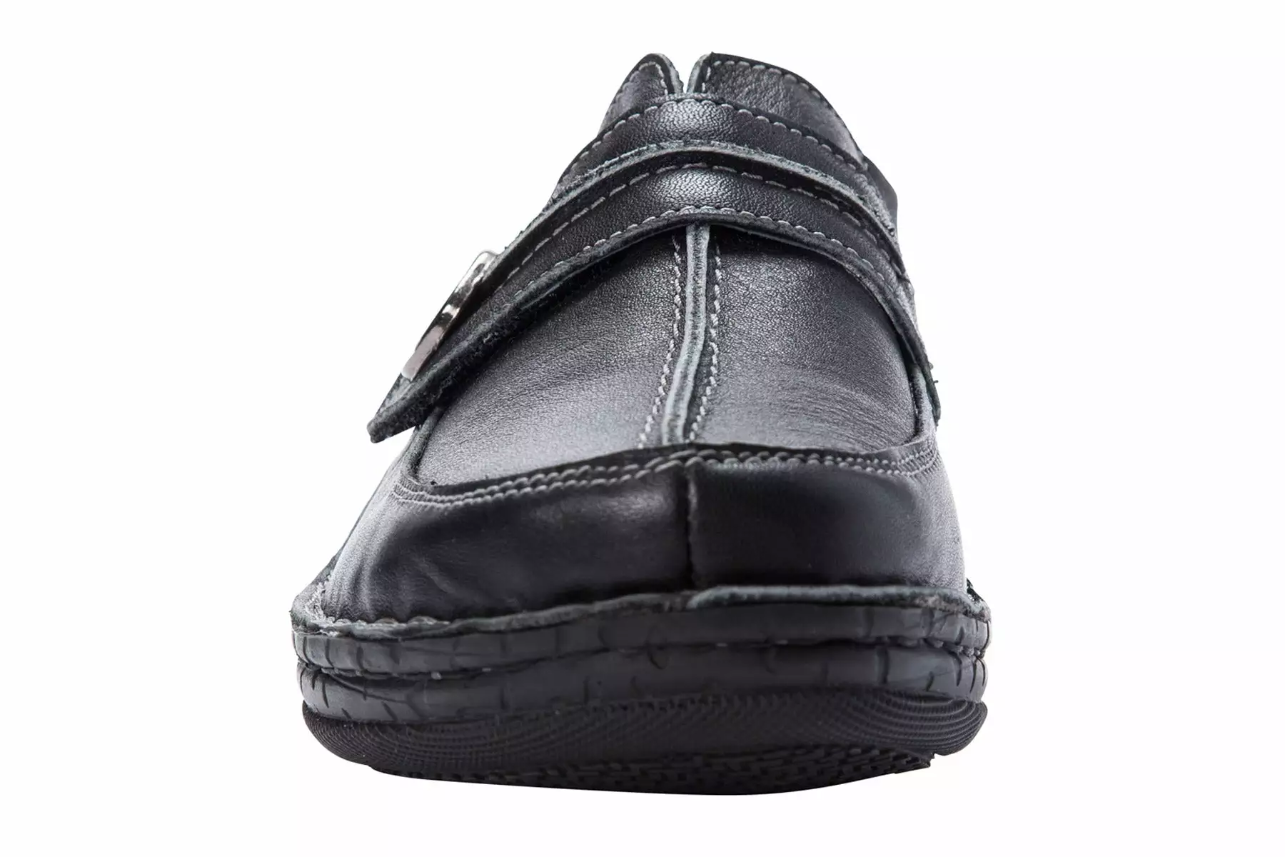 Slide into the women’s Propet Jana clog and experience all-day comfort. The full-grain leather upper is adorned with a decorative strap for added style. The removable OrthoLite® footbed accommodates custom orthotics, while the durable polyurethane outsole provides traction.