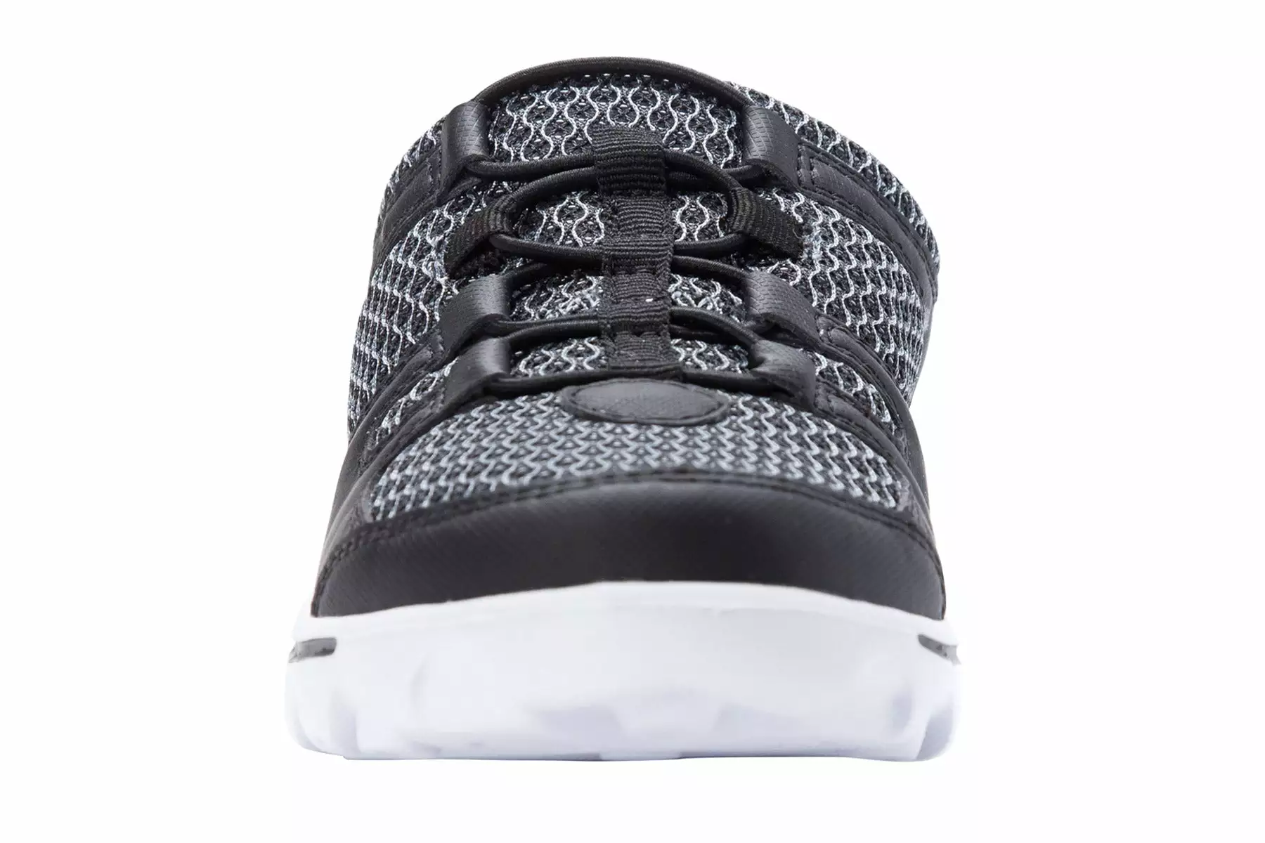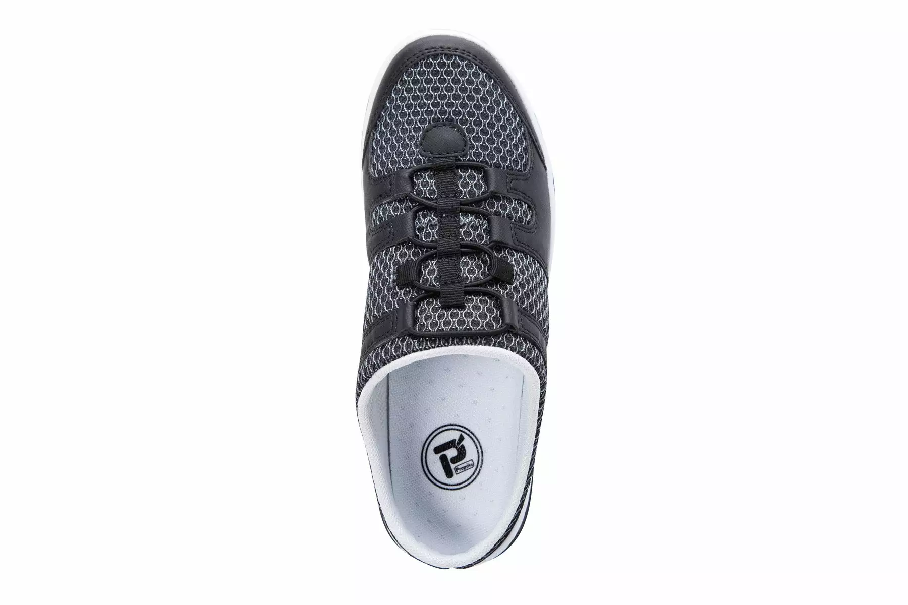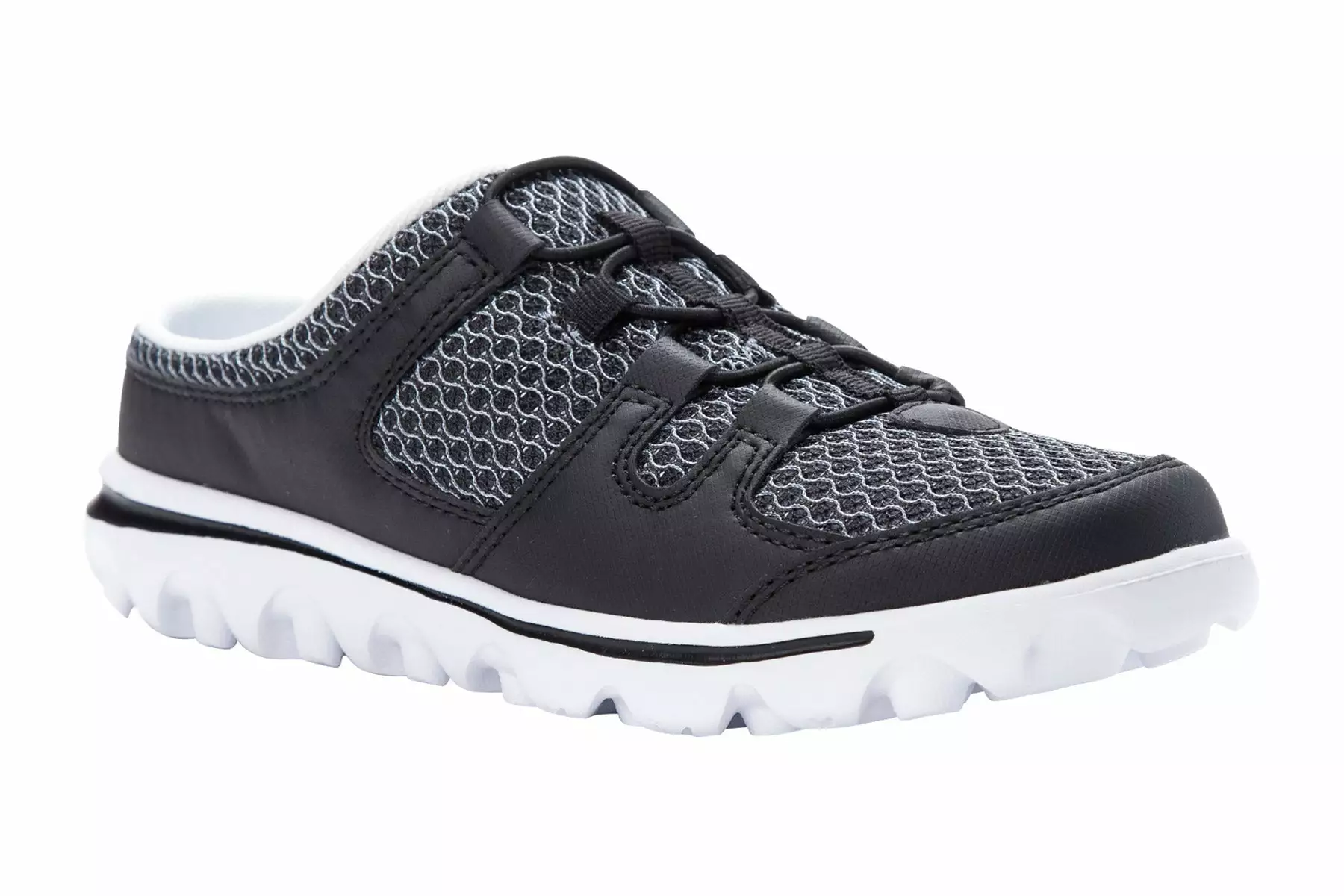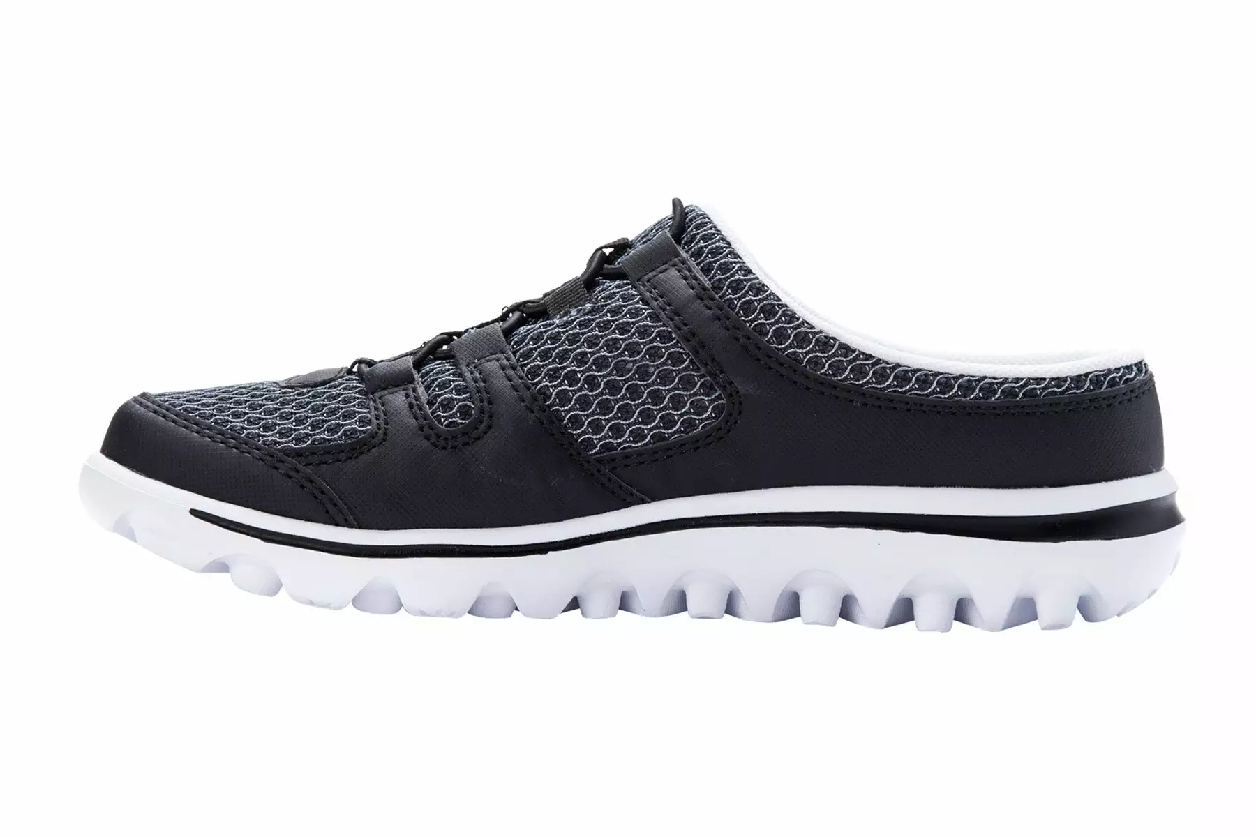Enjoy lightweight comfort and sporty style in the women’s Propet TravelActiv Slide. The mesh upper and lining offer moisture-wicking, breathable comfort. The removable EVA footbed accommodates custom orthotics, while the EVA outsole provides traction and durability.