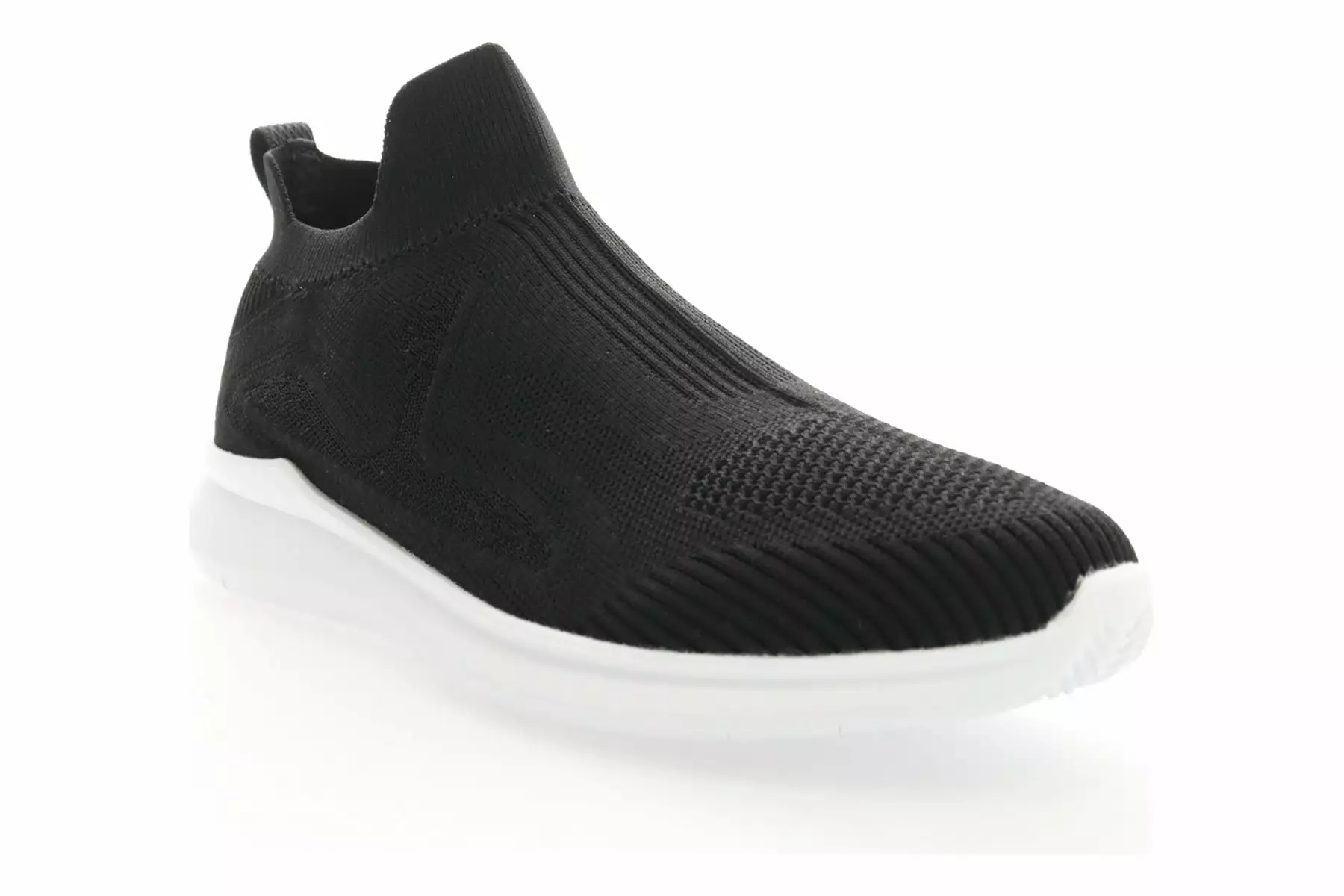 Propet TravelBound Slip-On is a dependable casual shoe. These laceless sneakers have a stretch knit upper, removable foam footbed and sturdy rubber outsole. A bungee front closure keeps feet secured, while a back pull tab provides easy on and off.