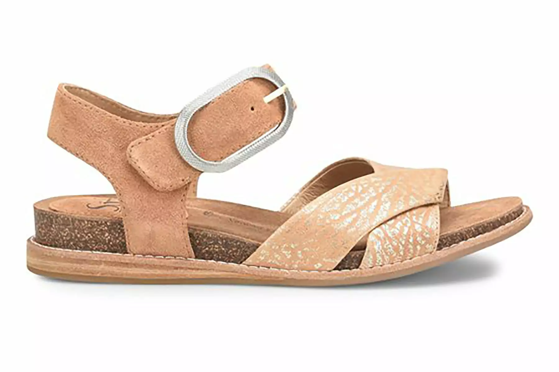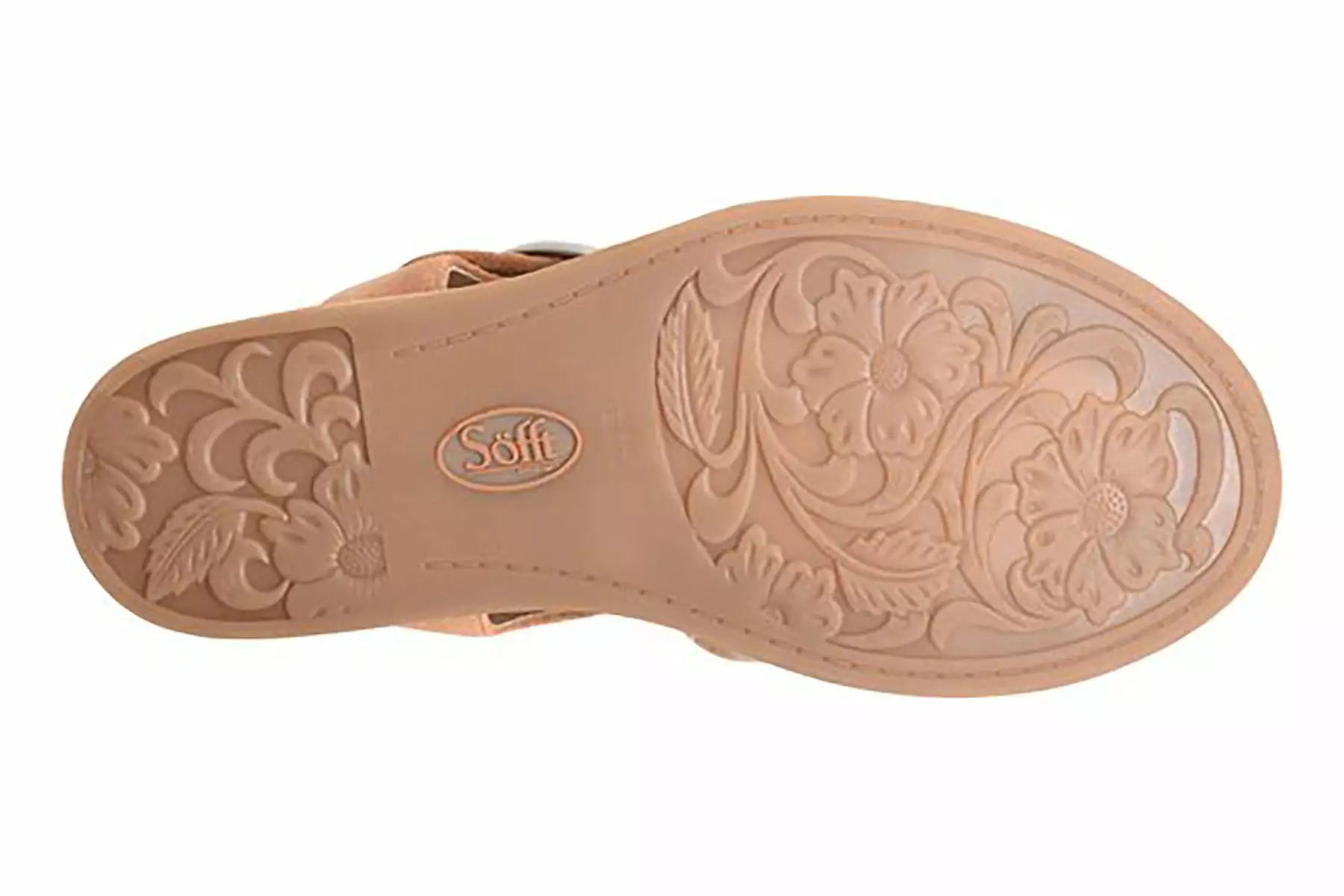 Sofft Bayo is a casual and fashionable asymmetric sandal. Features include soft Italian leather uppers, a suede-lined footbed and lightweight TPR outsole. A textured buckle with a hidden hook and loop strap supports feet, while a stacked 1 ΒΌ inch heel provides elevated comfort.