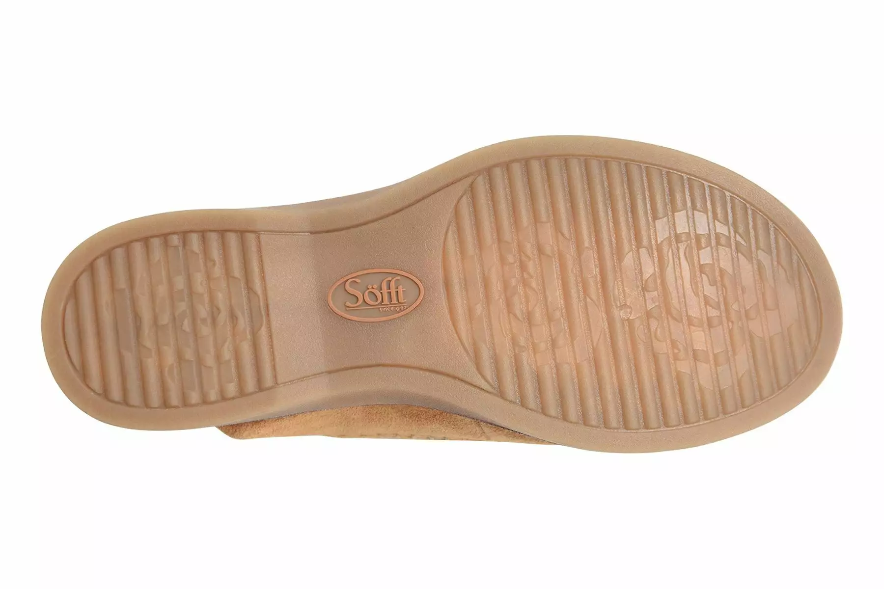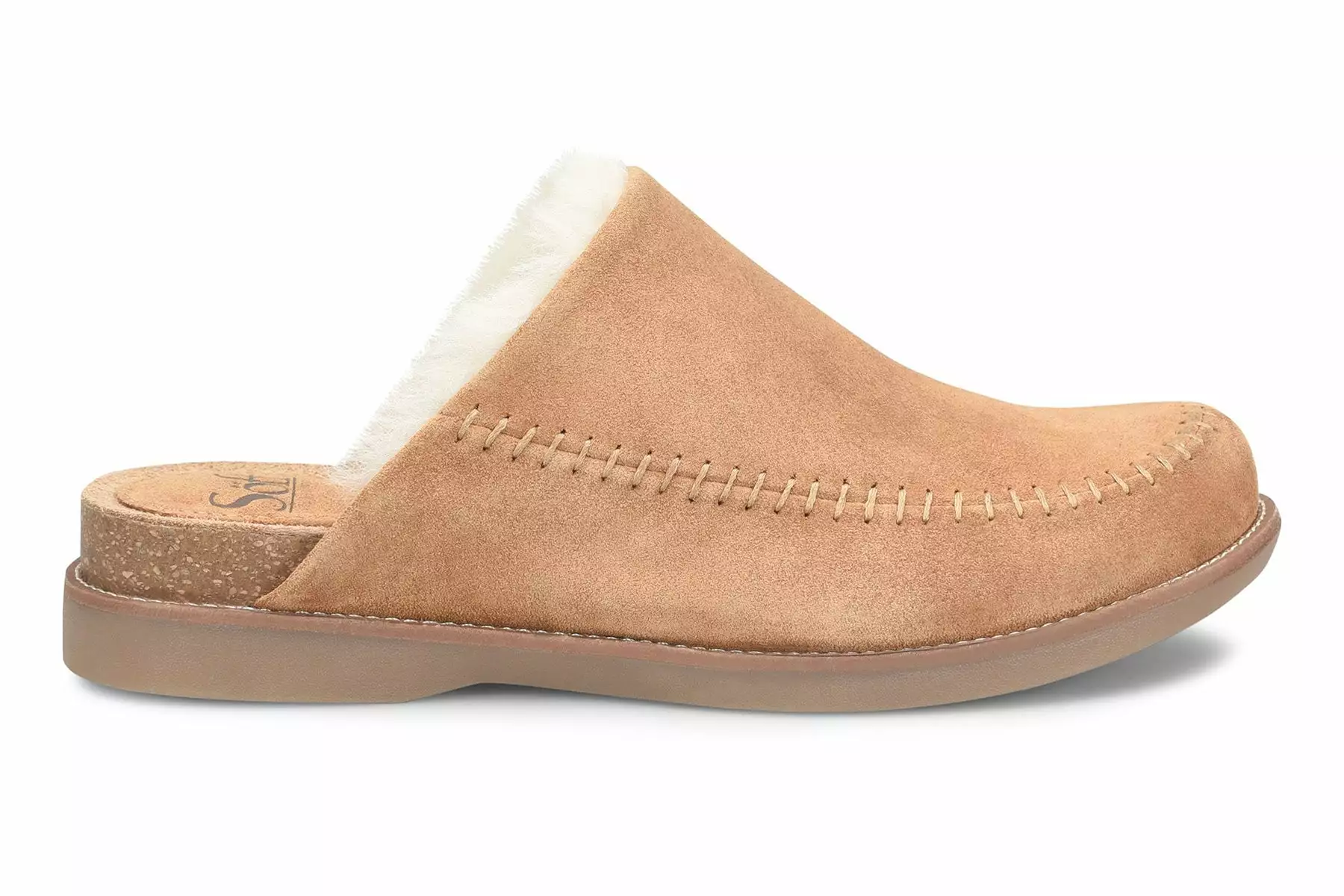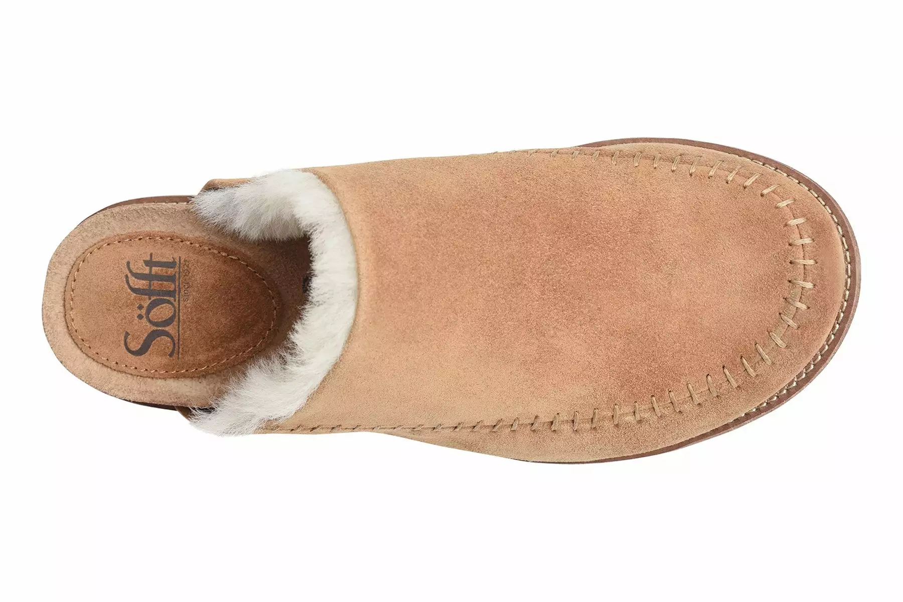 Sofft Bellflower is a warm and cozy mule clog. Prominent features include luxe Italian suede uppers, genuine shearling lining and a flexible TPR outsole. A cushioned cork footbed, accent stitching and 1 ½ inch heel height makes these comfortable mules a hit.