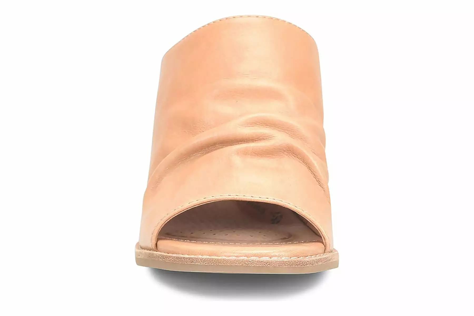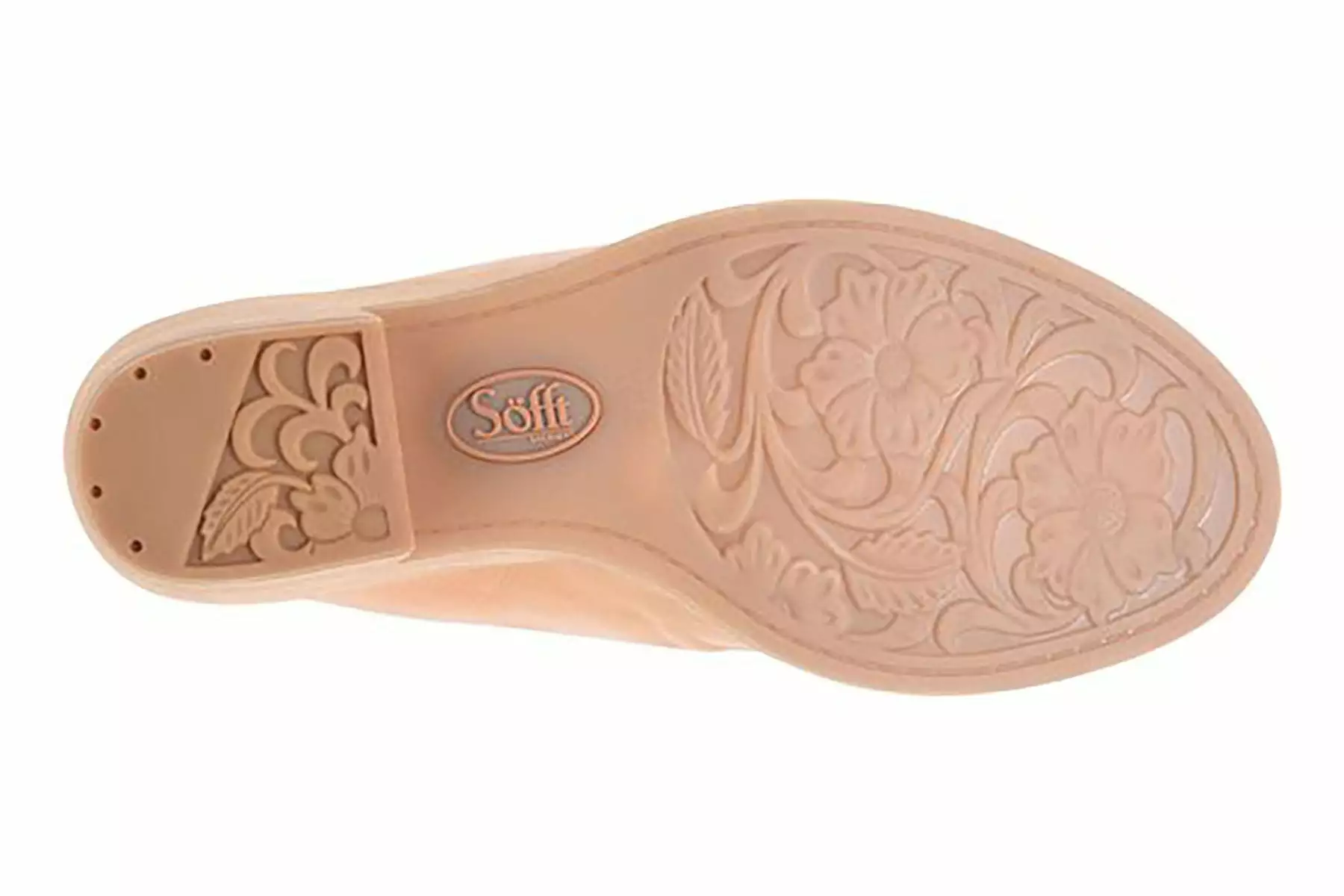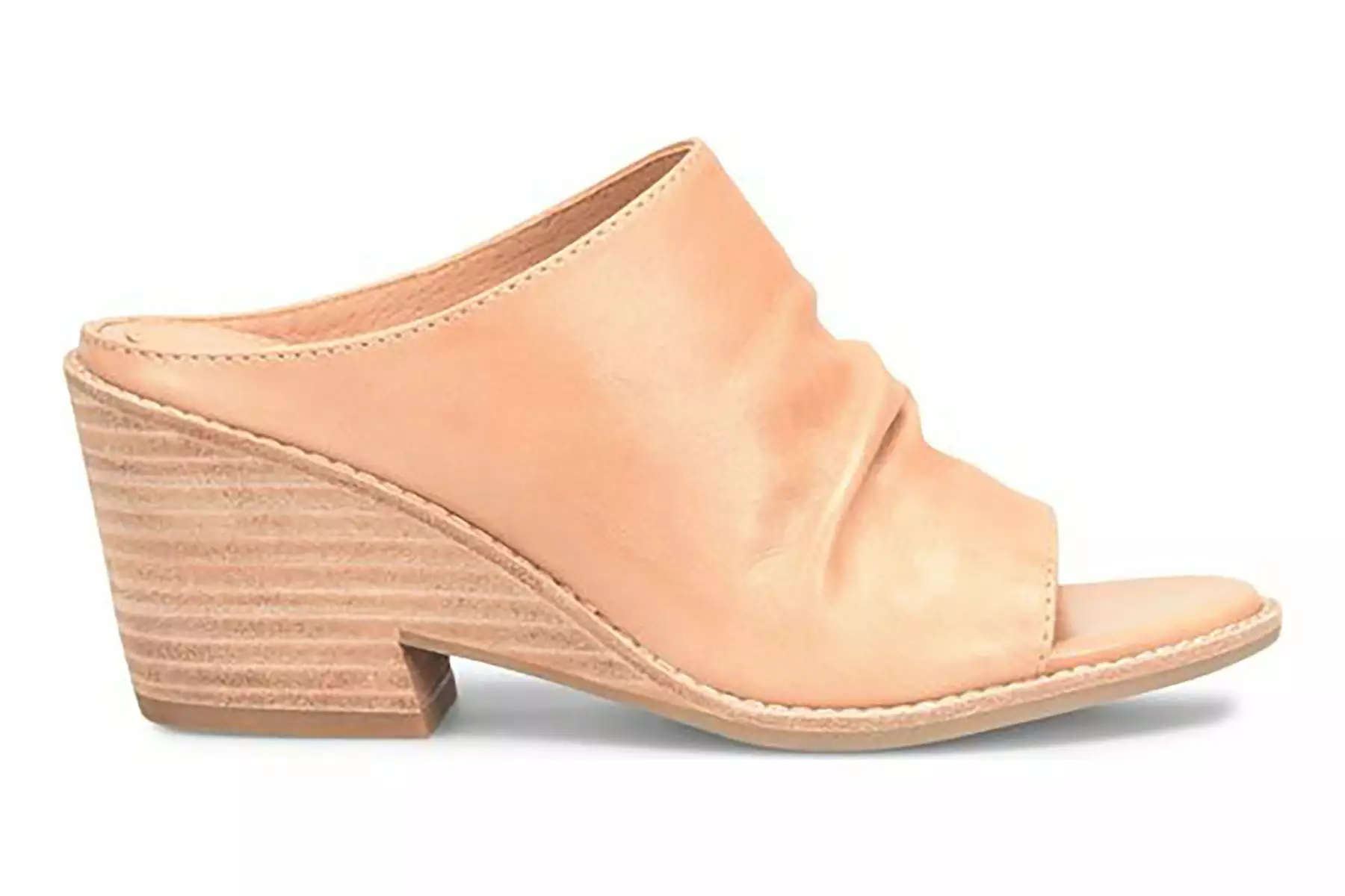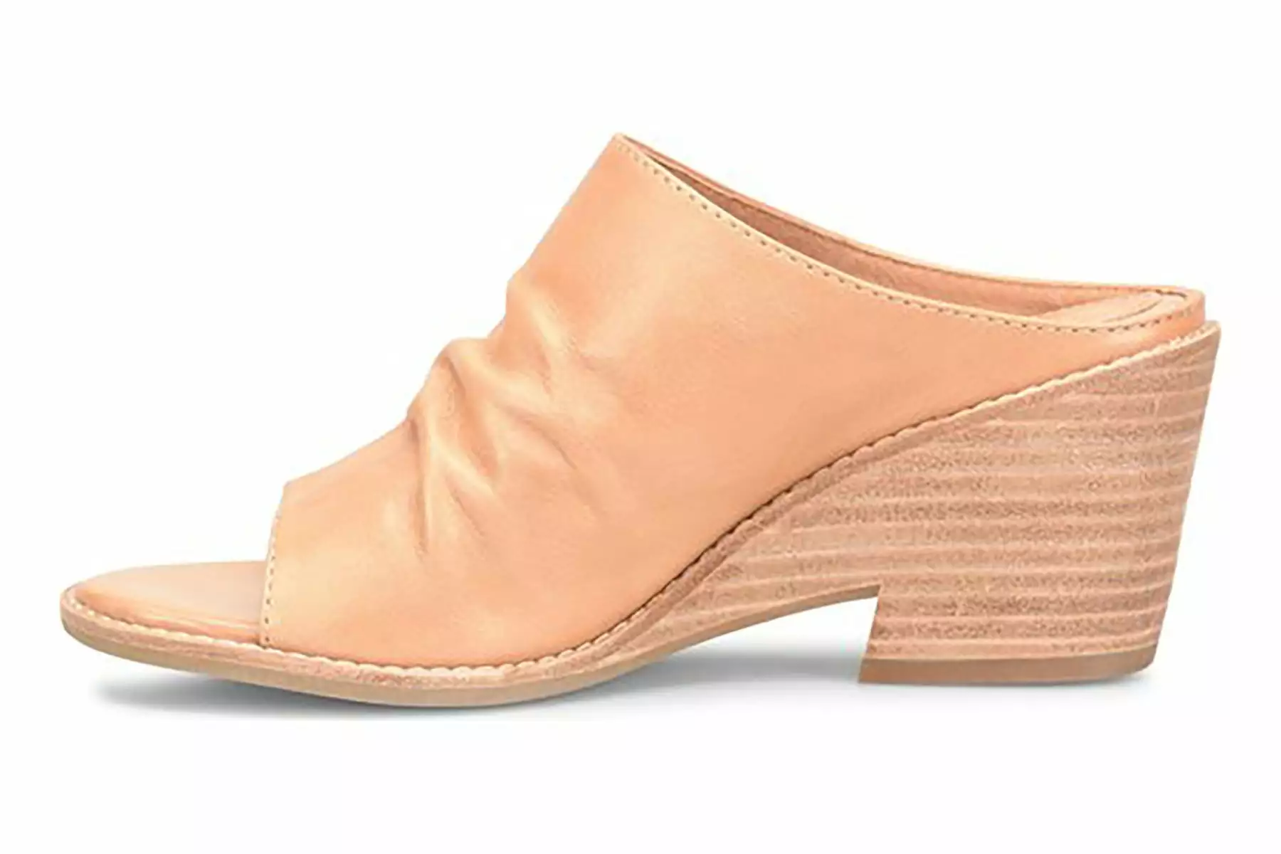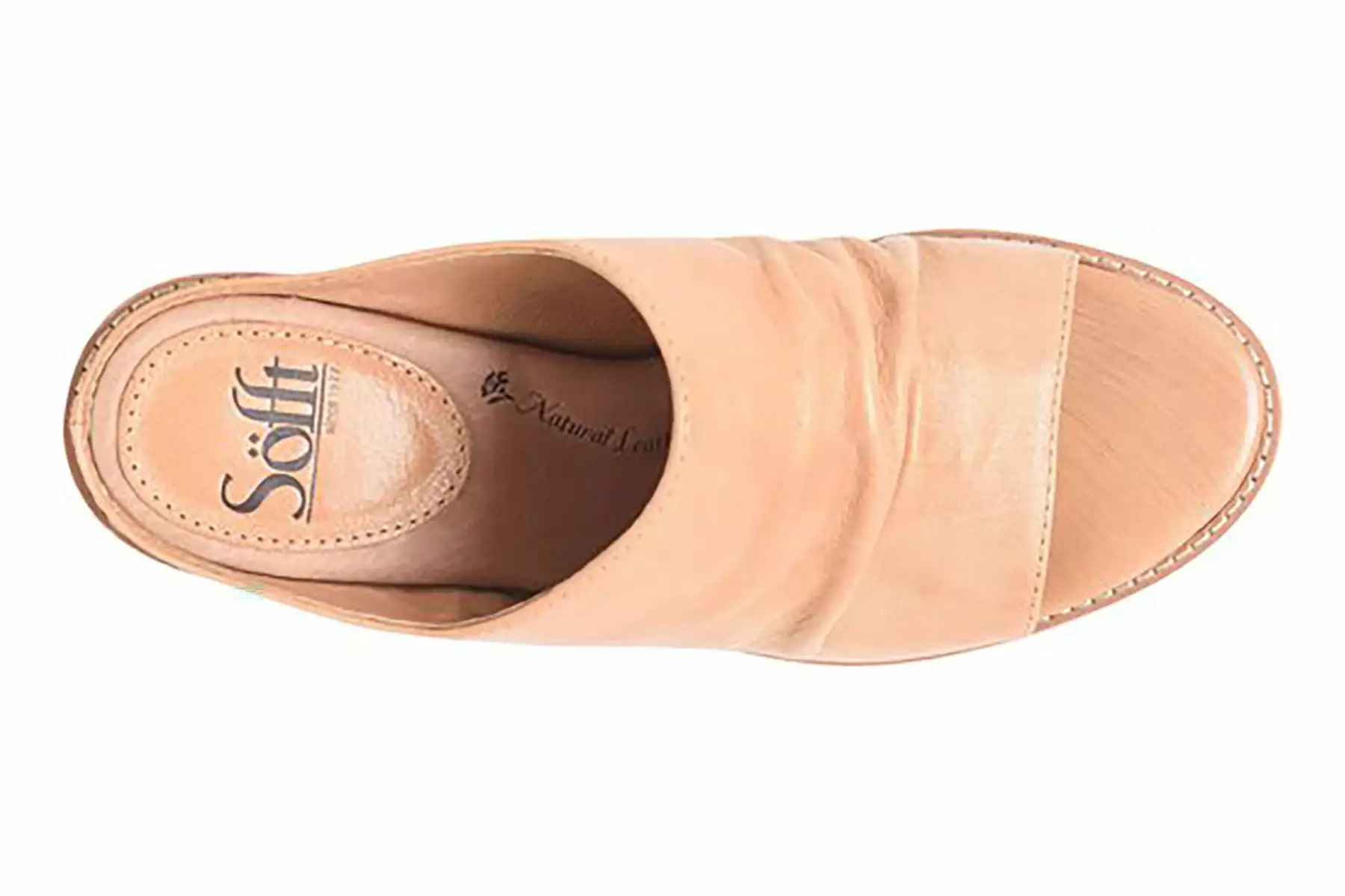 Sofft Strathmore is an upscale ruched slide sandal. These summer slides have Italian leather or suede uppers, microfiber lining and lightweight TPR outsole. A cushioned footbed, slip on construction and 3-inch stacked cut-out wedge heel.