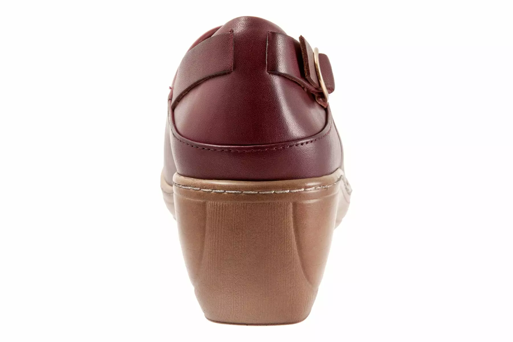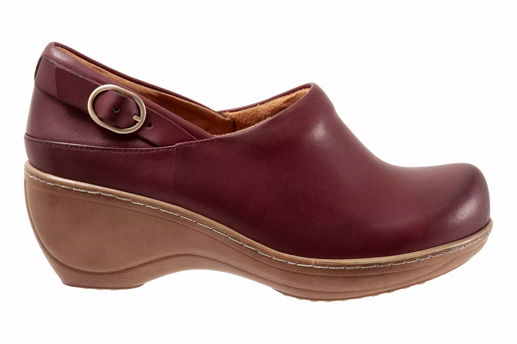 The Minna is a closed-back clog with a buckle ornament detail. A curvy platform wedge with faux wood treatment elevates the Minna and a padded collar and cushioned footbed keeps you comfortable.