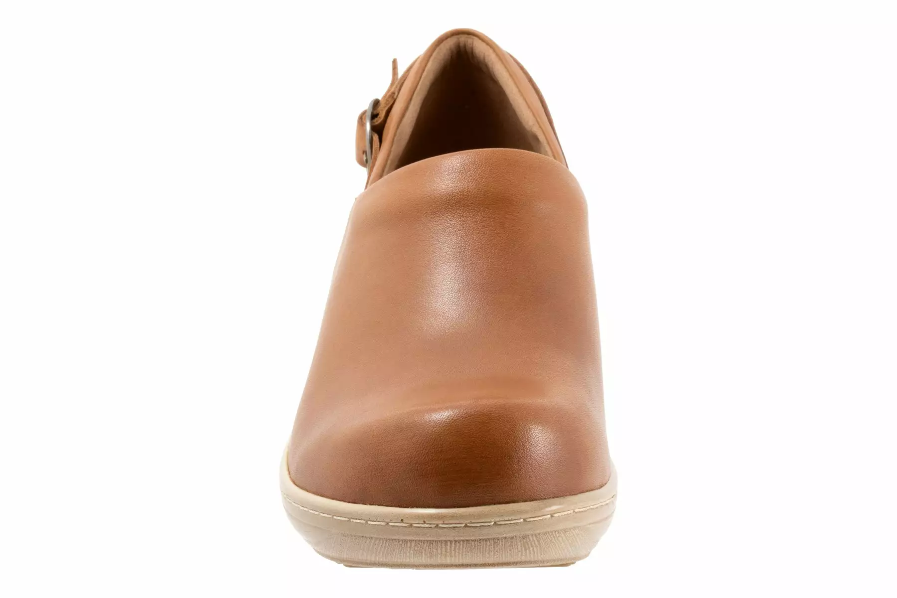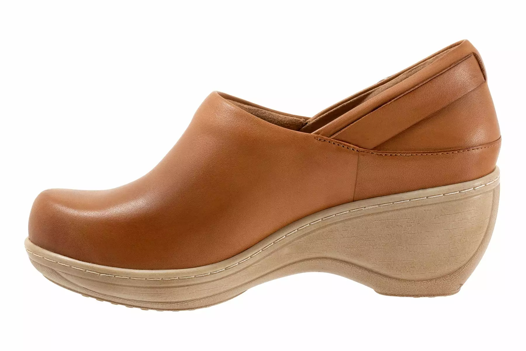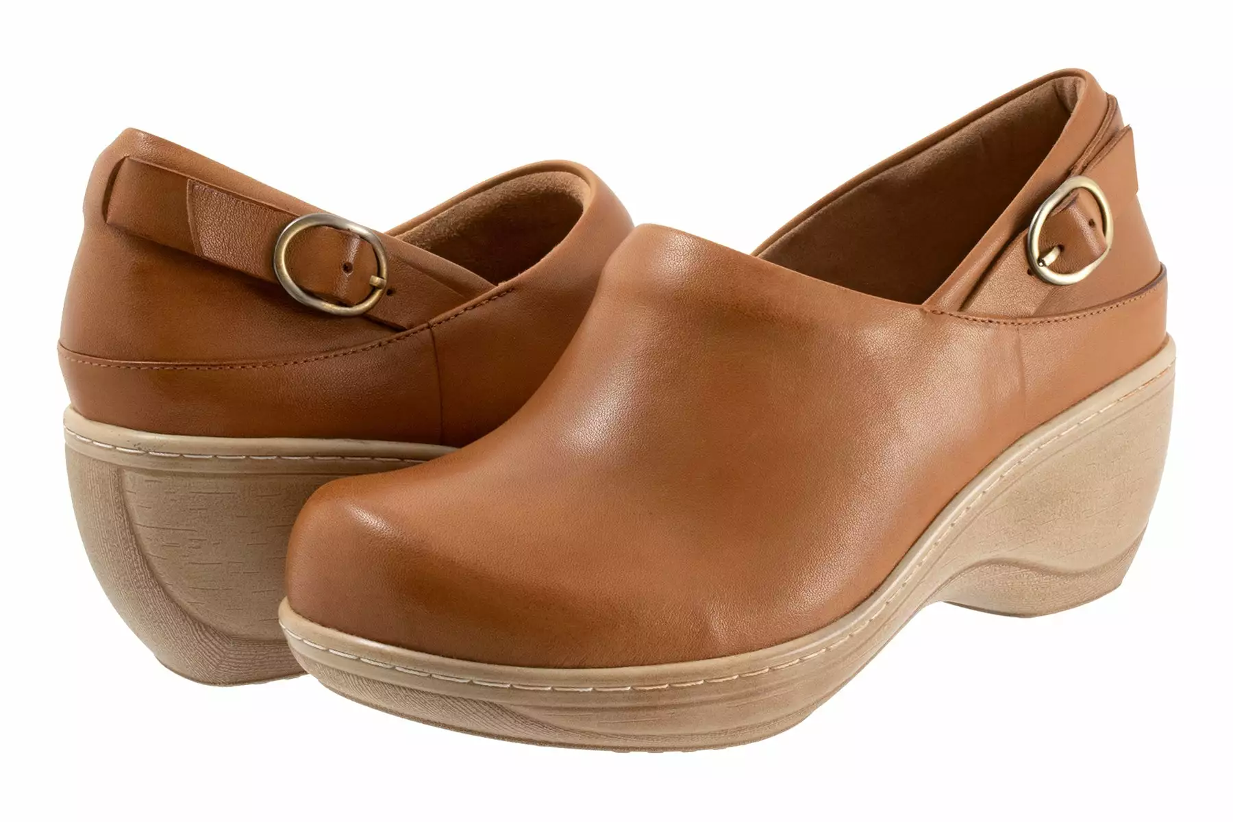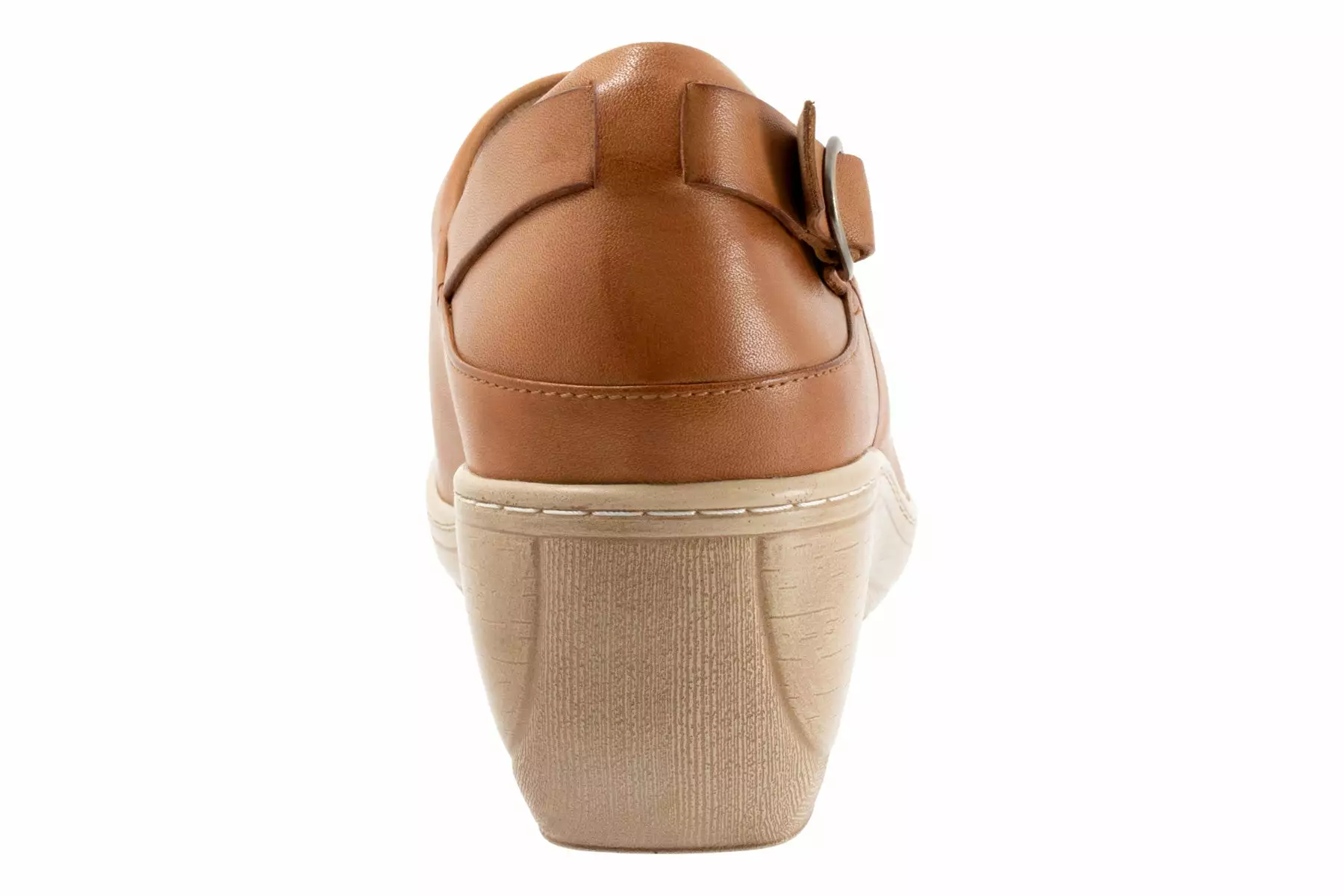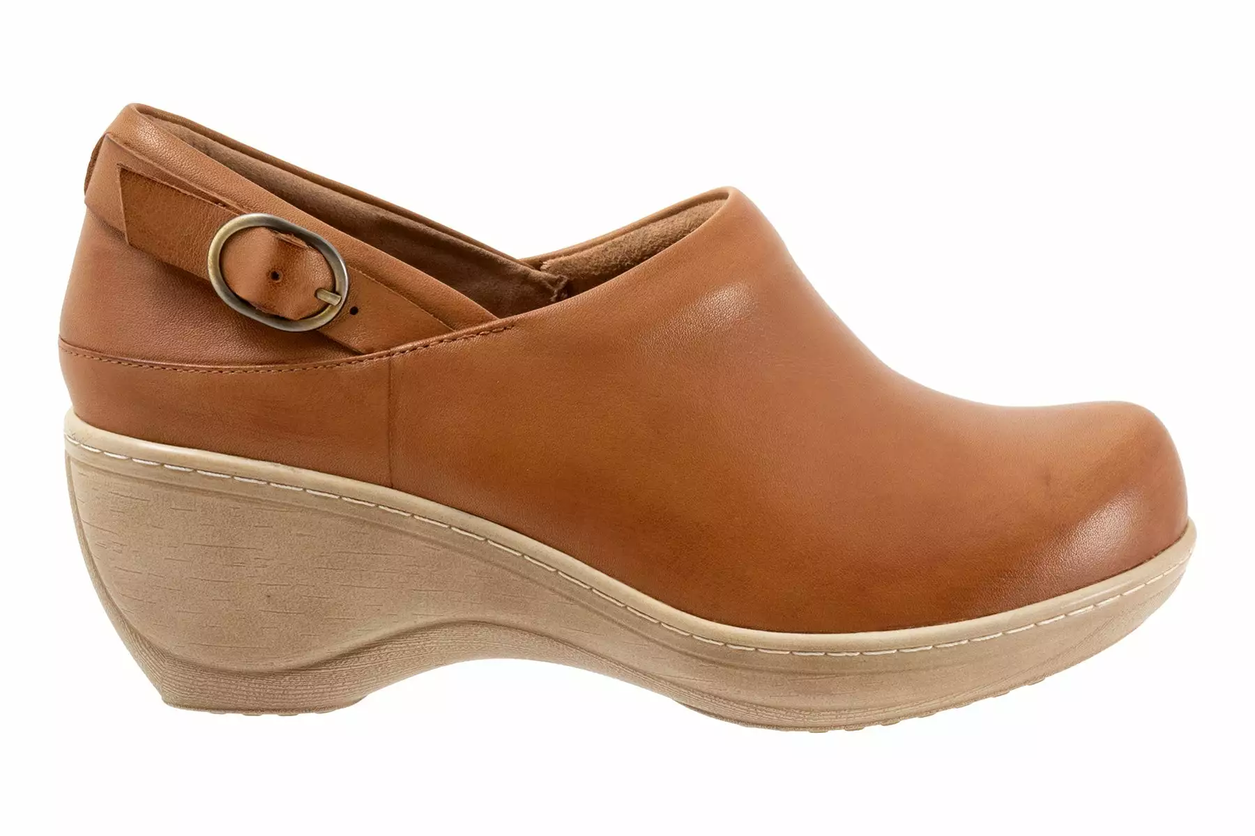 The Minna is a closed-back clog with a buckle ornament detail. A curvy platform wedge with faux wood treatment elevates the Minna and a padded collar and cushioned footbed keeps you comfortable.