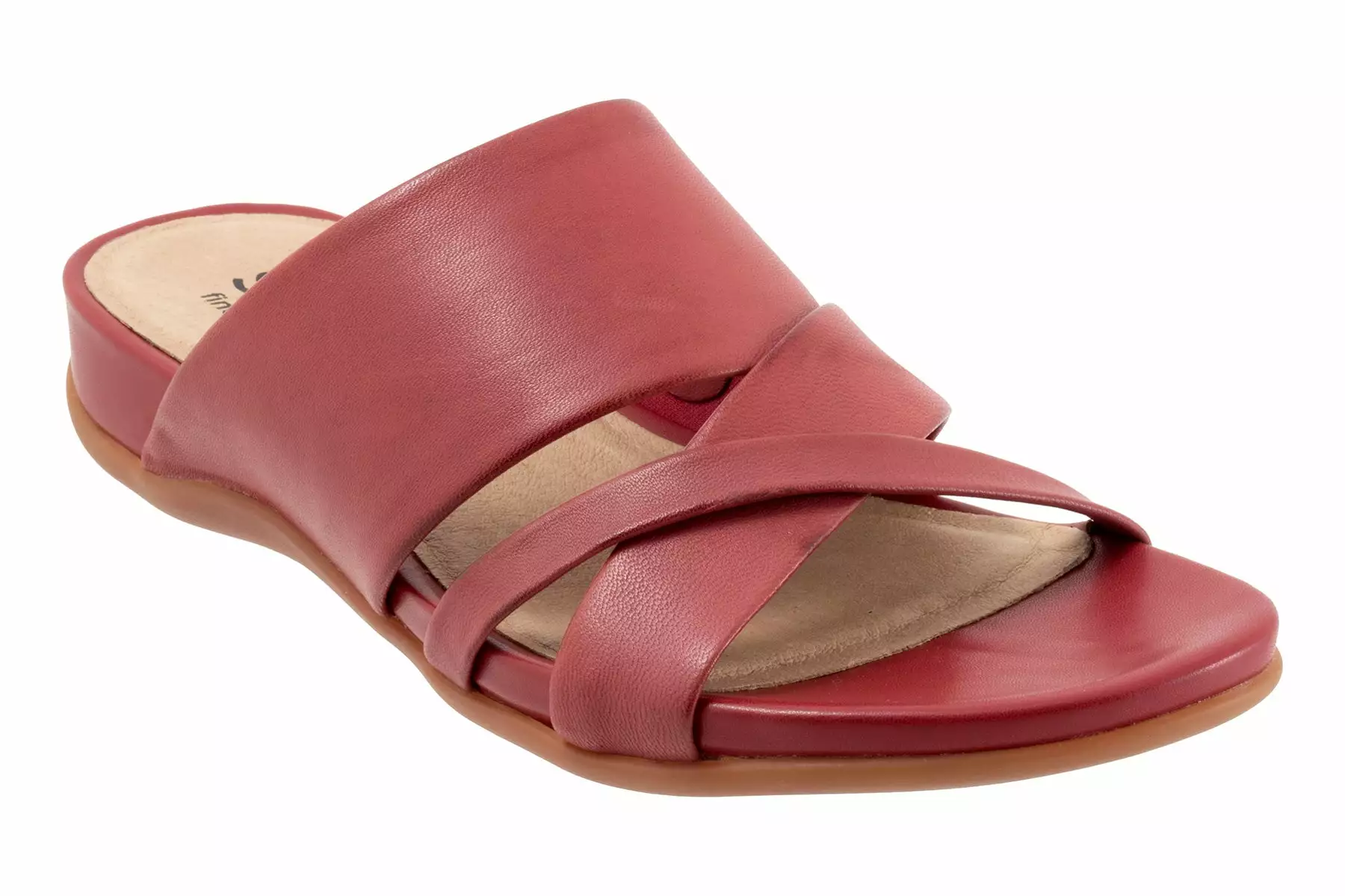 SoftWalk Taraz is a supportive and comfortable leather slide sandal. Crisscrossing vamp straps and a well-cushioned footbed provides long-lasting comfort. A leather upper and lining, along with a flexible and slip-resistant outsole, will have your feet happy and supported all day and night.