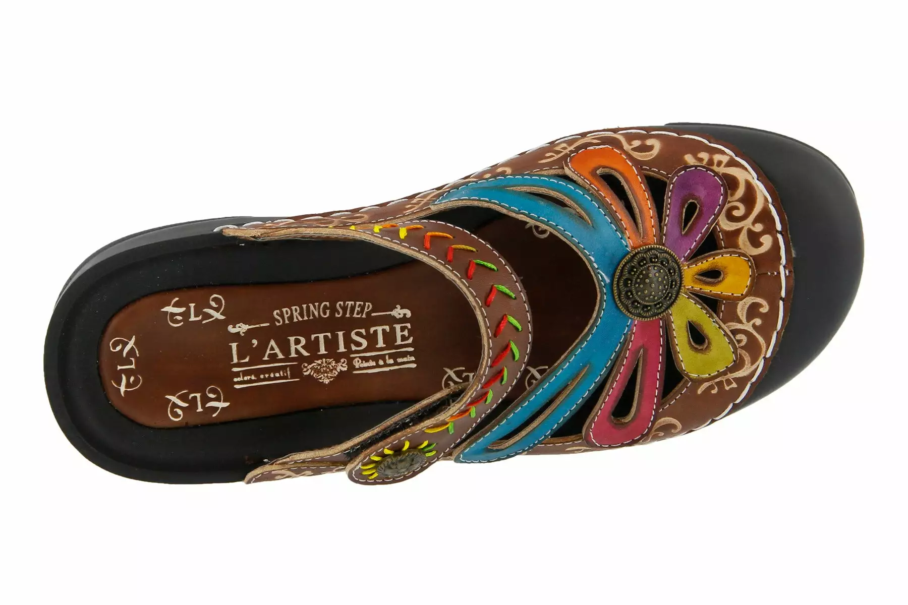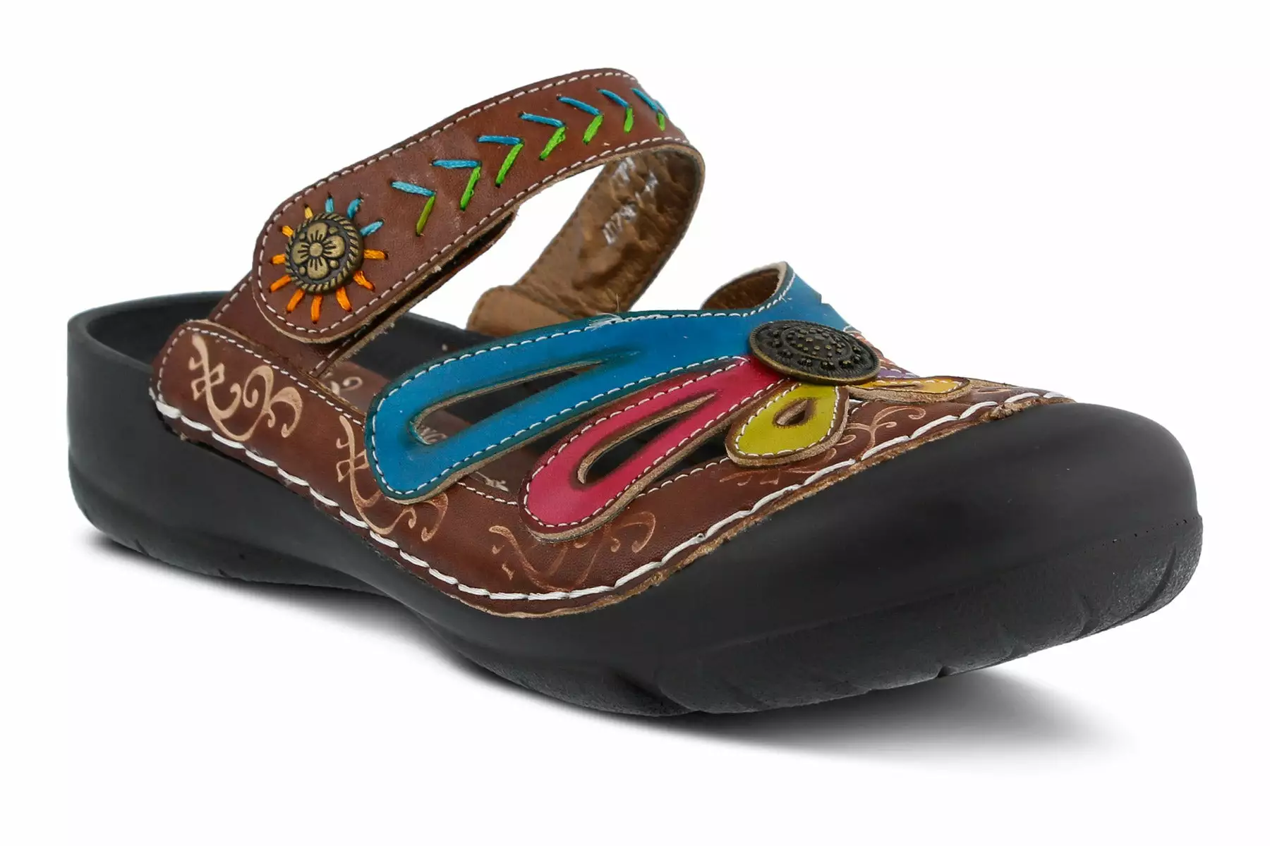 - Hand-painted leather upper with embossed detail and colorful threading for added interest.
