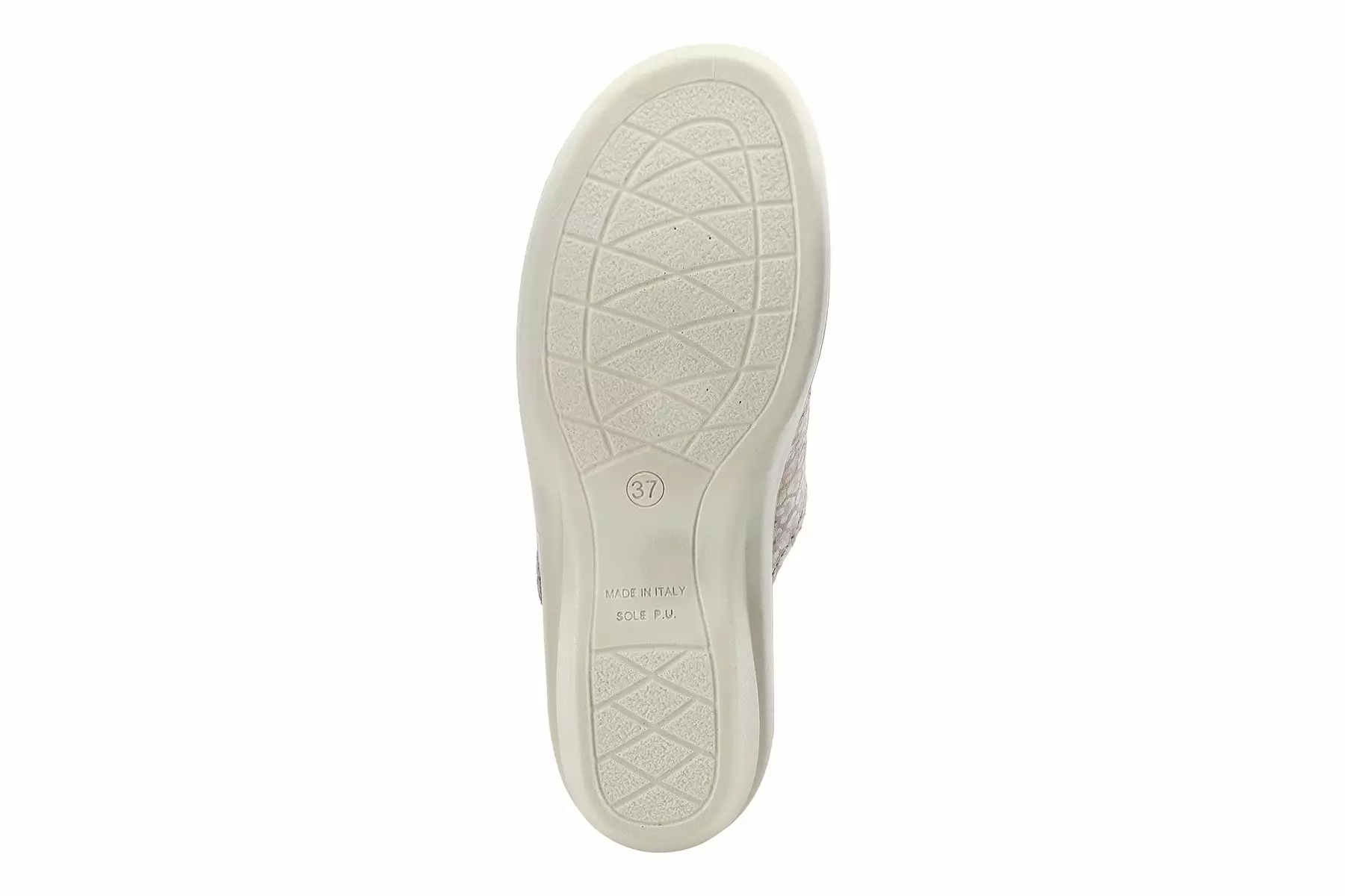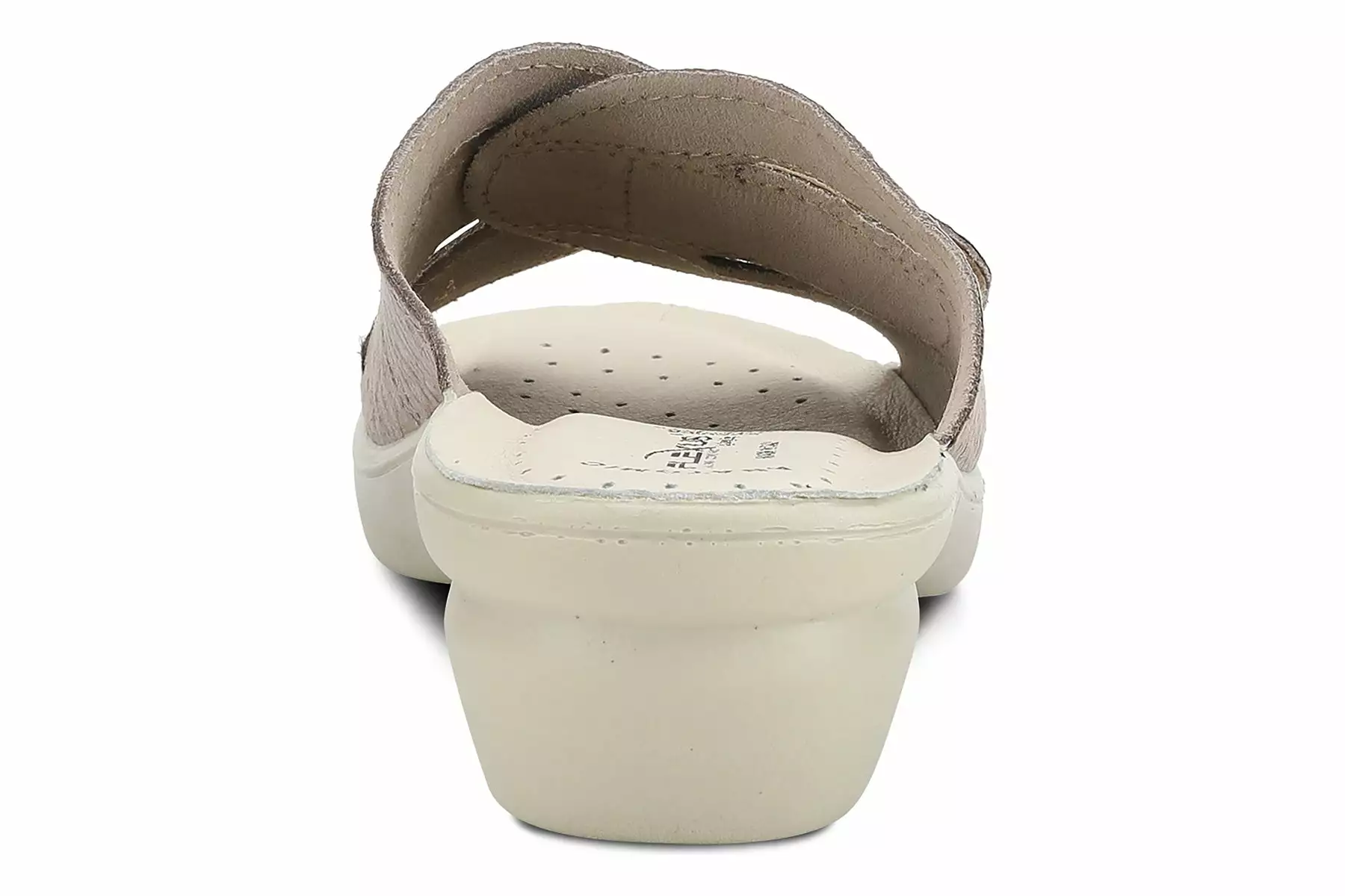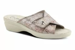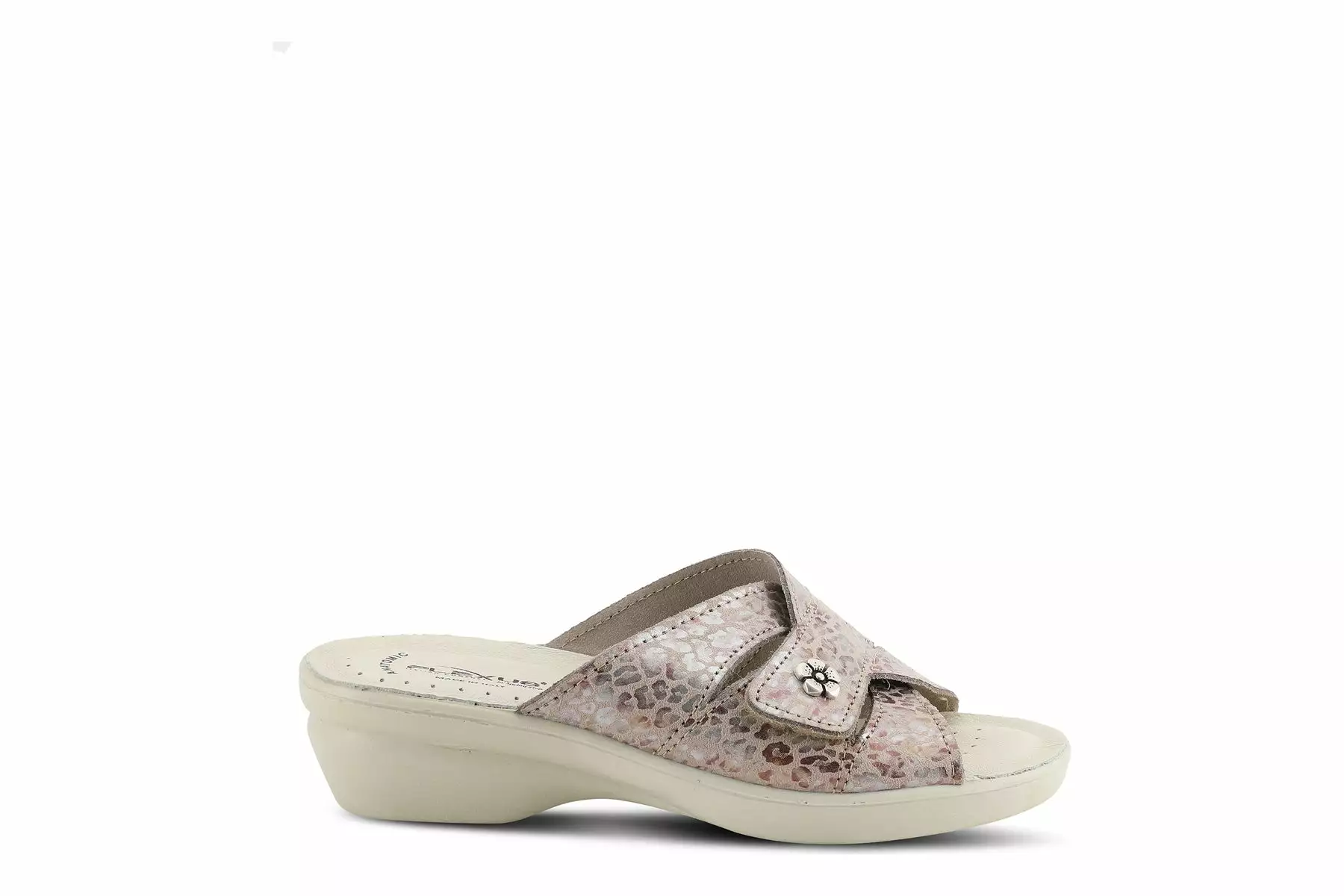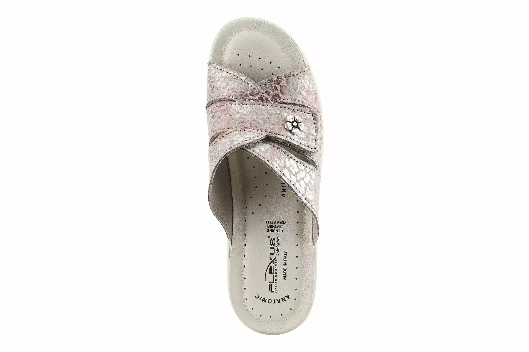 Flexus Style: Fedame- Italian made slide sandal with a modern metallic printed suede upper and a flower metal decorative button featuring a full length leather padded foot bed all on a flexible direct injection polyurethane wedge sole.