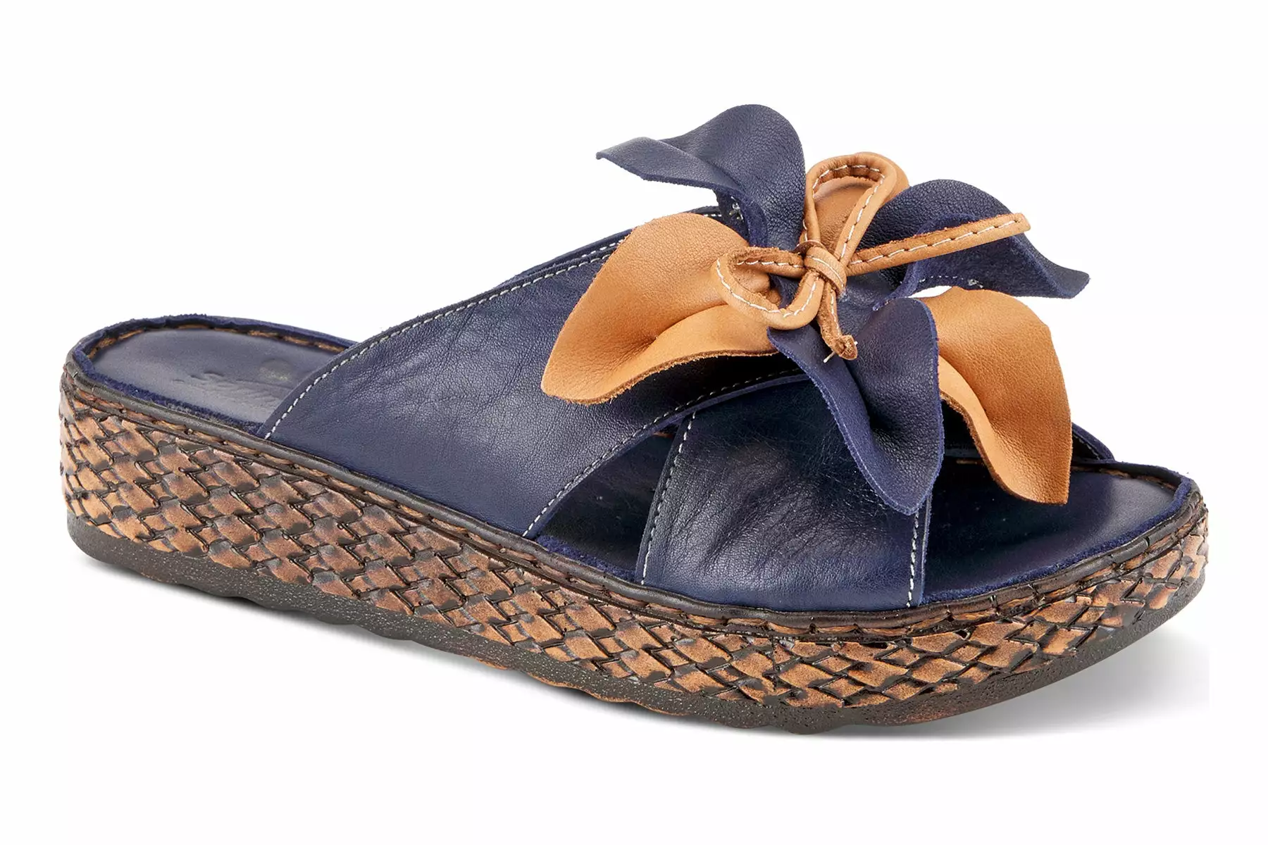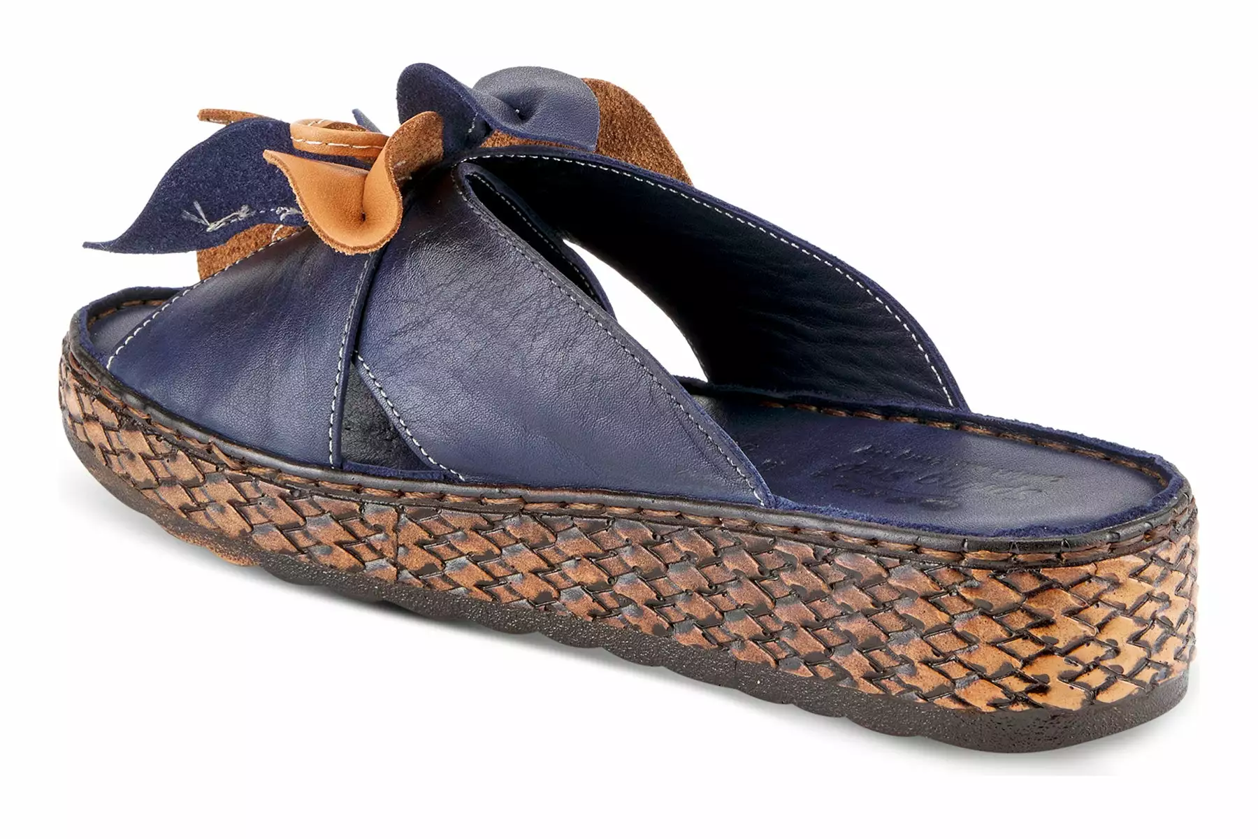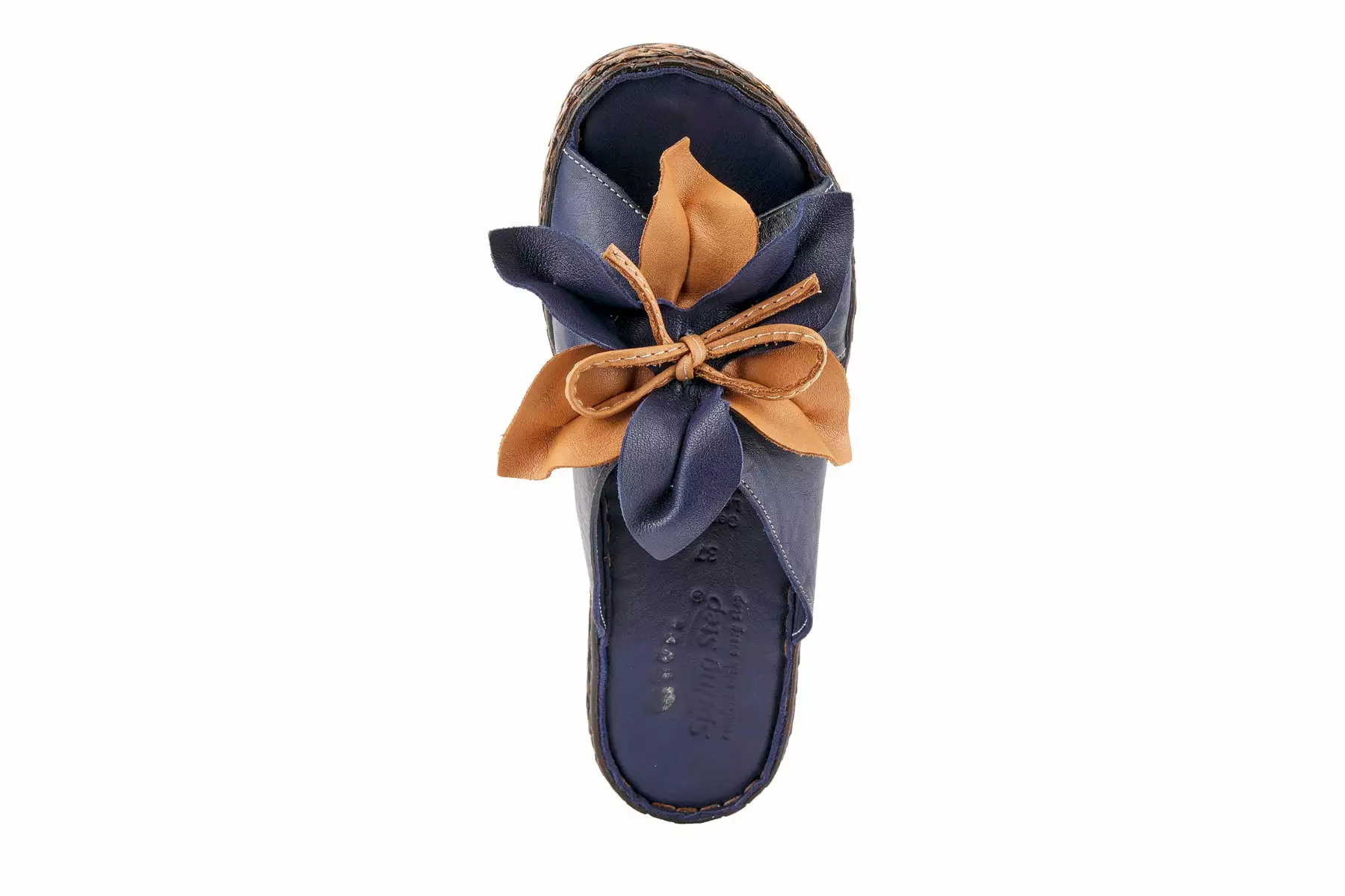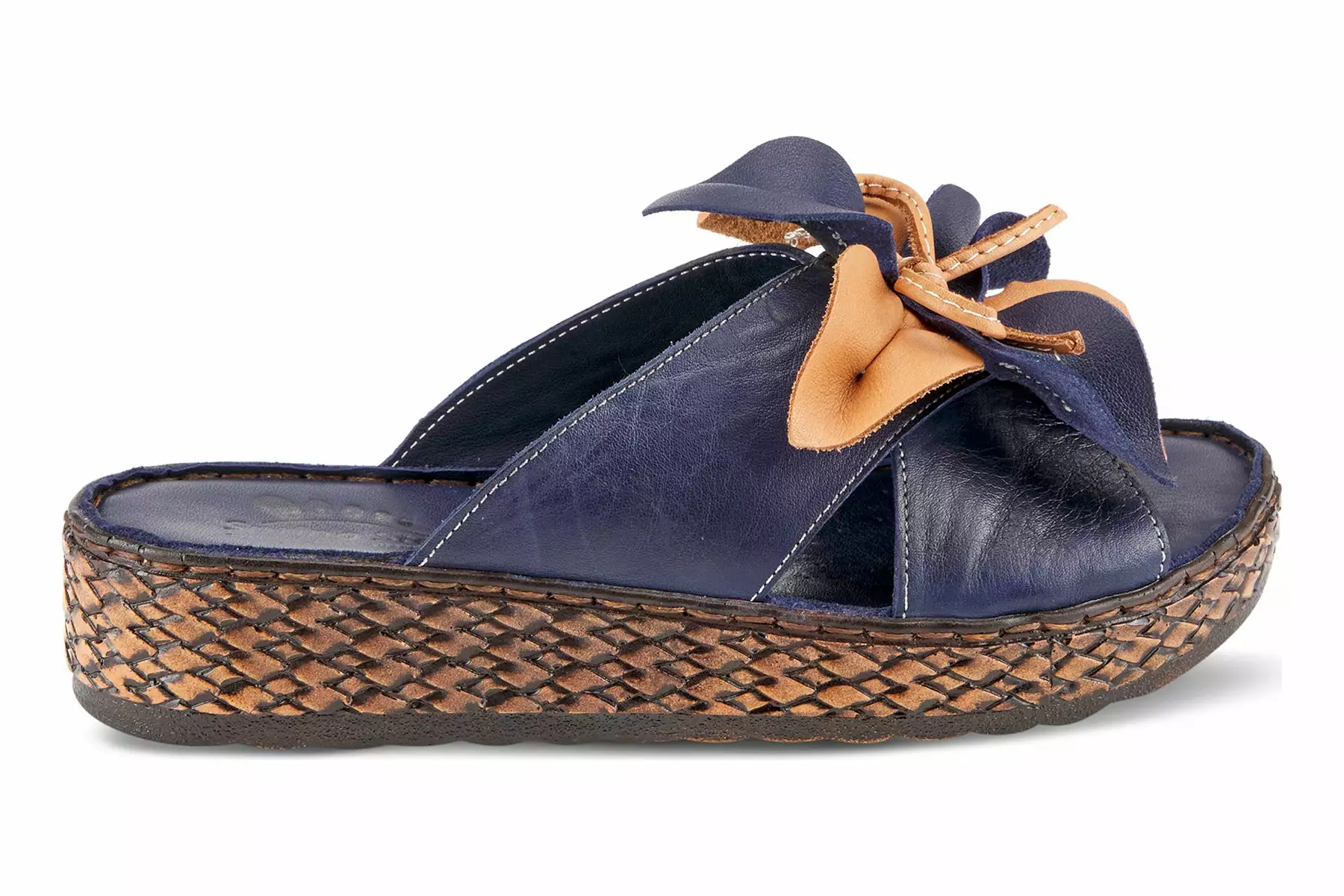 Make a dynamic statement with this whimsical, high quality and butter-soft leather slide sandal featuring a flower applique and padded footbed on a lightweight comfort sole with a flexible forefoot.