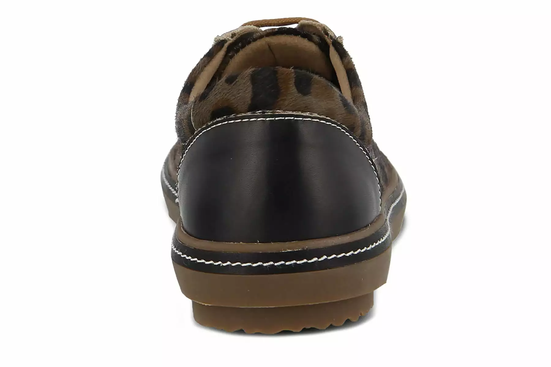 Modern Day Casual, extended facing six (6) eyelet lace-up featuring rich full-grain burnished polished leather and leopard print hair-on-hide, comfortable padded collar, fashionable, and flexible rubber outsole with leather contrast stitched inlay.
