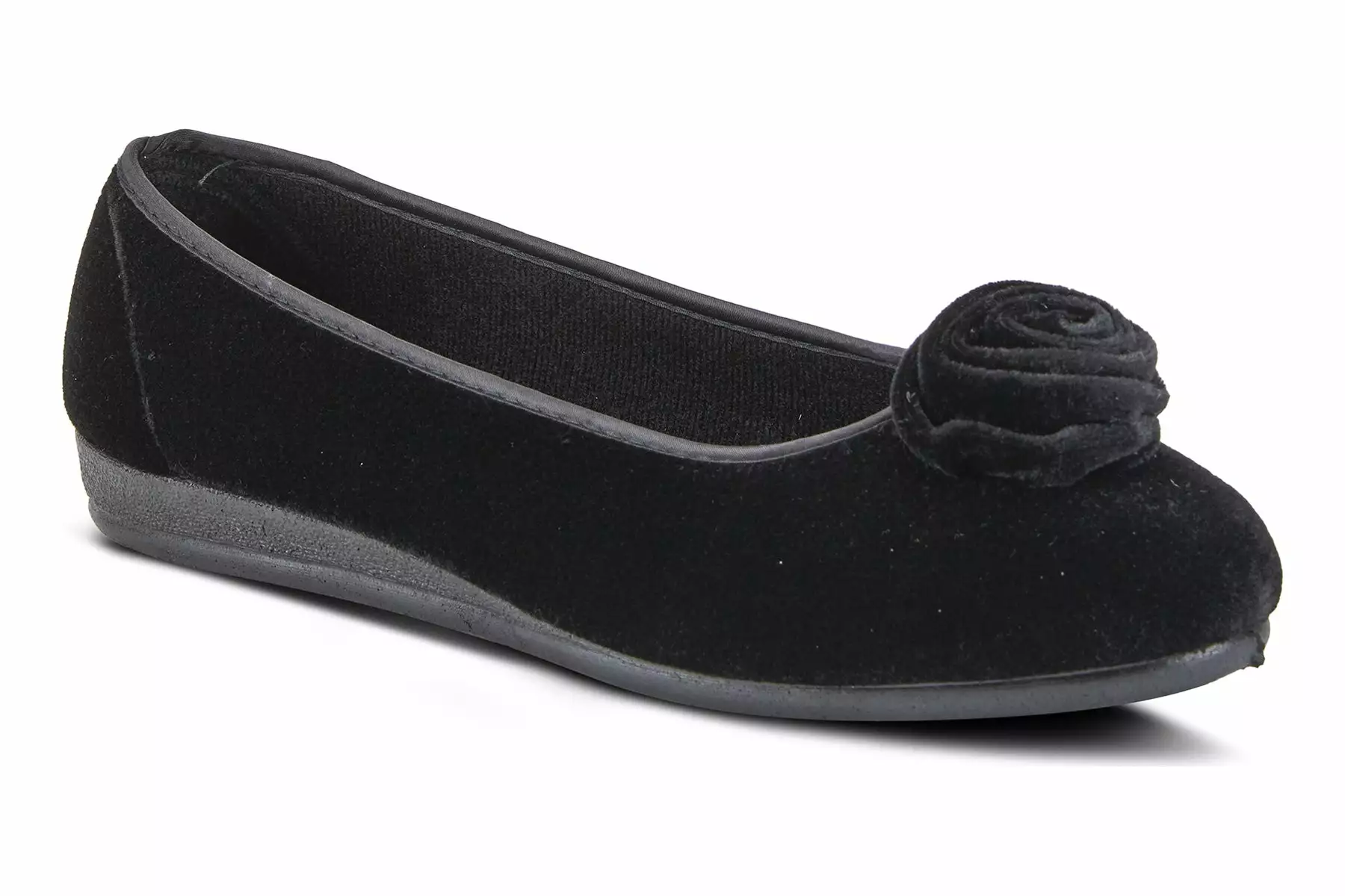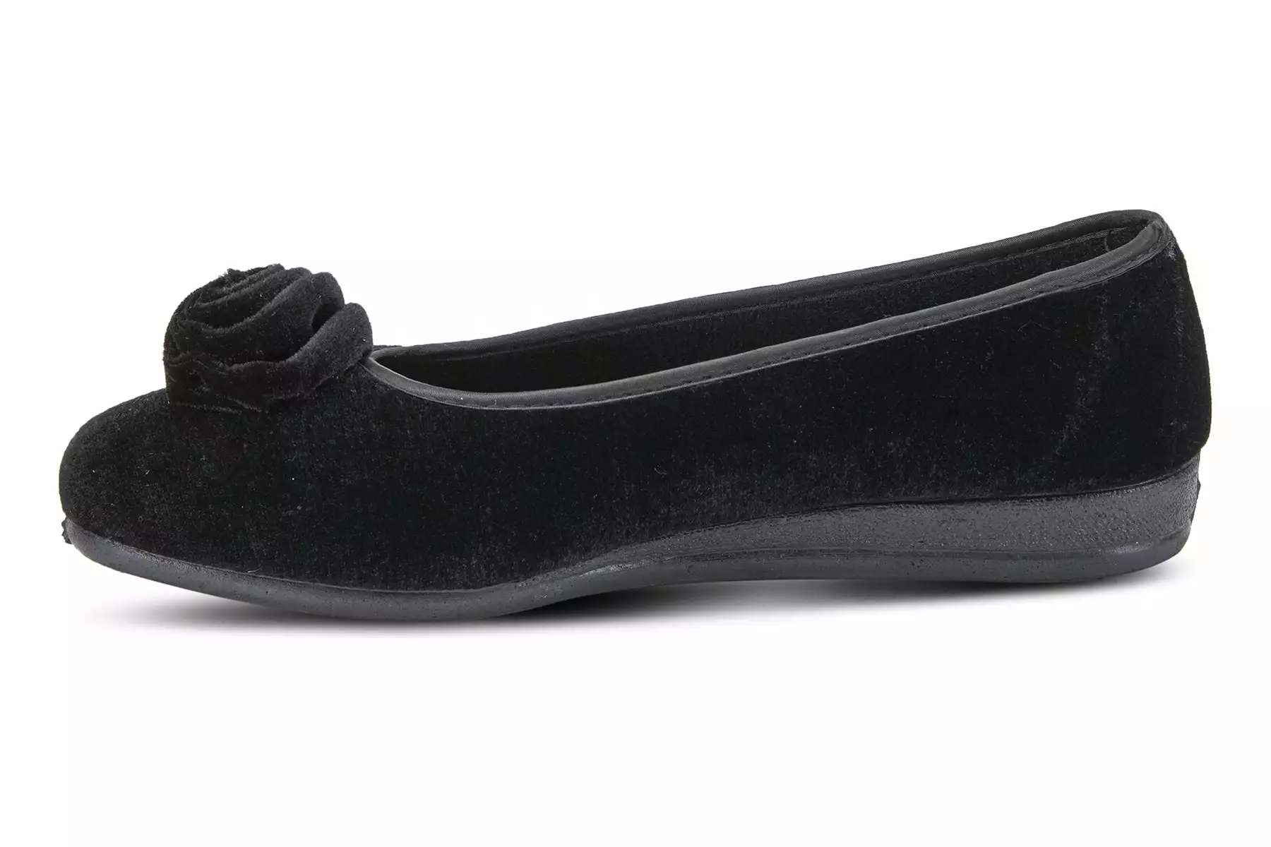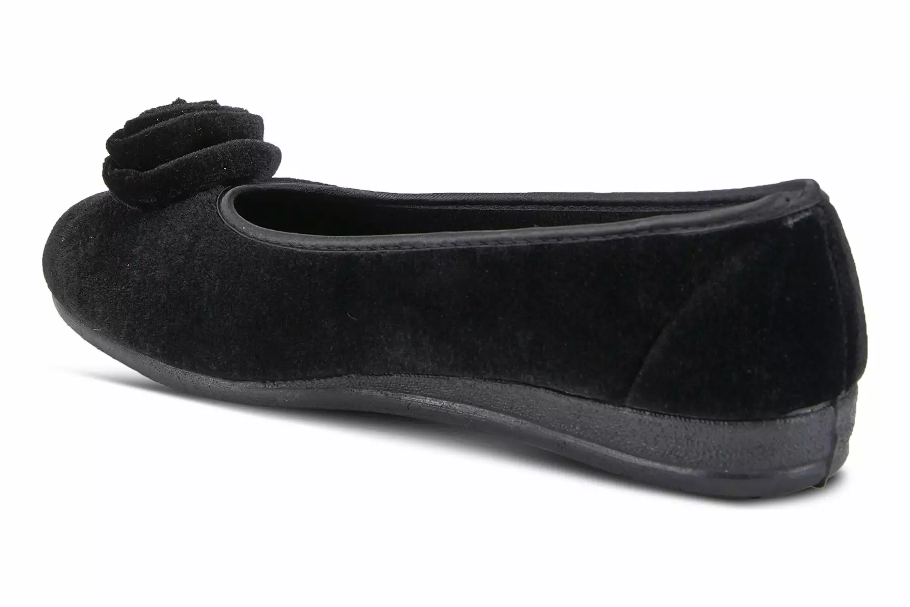 Easy to Slip-on velvet-like indoor/outdoor ballerina slipper with a matching color soft rose detail and superb cushioning for added comfort.