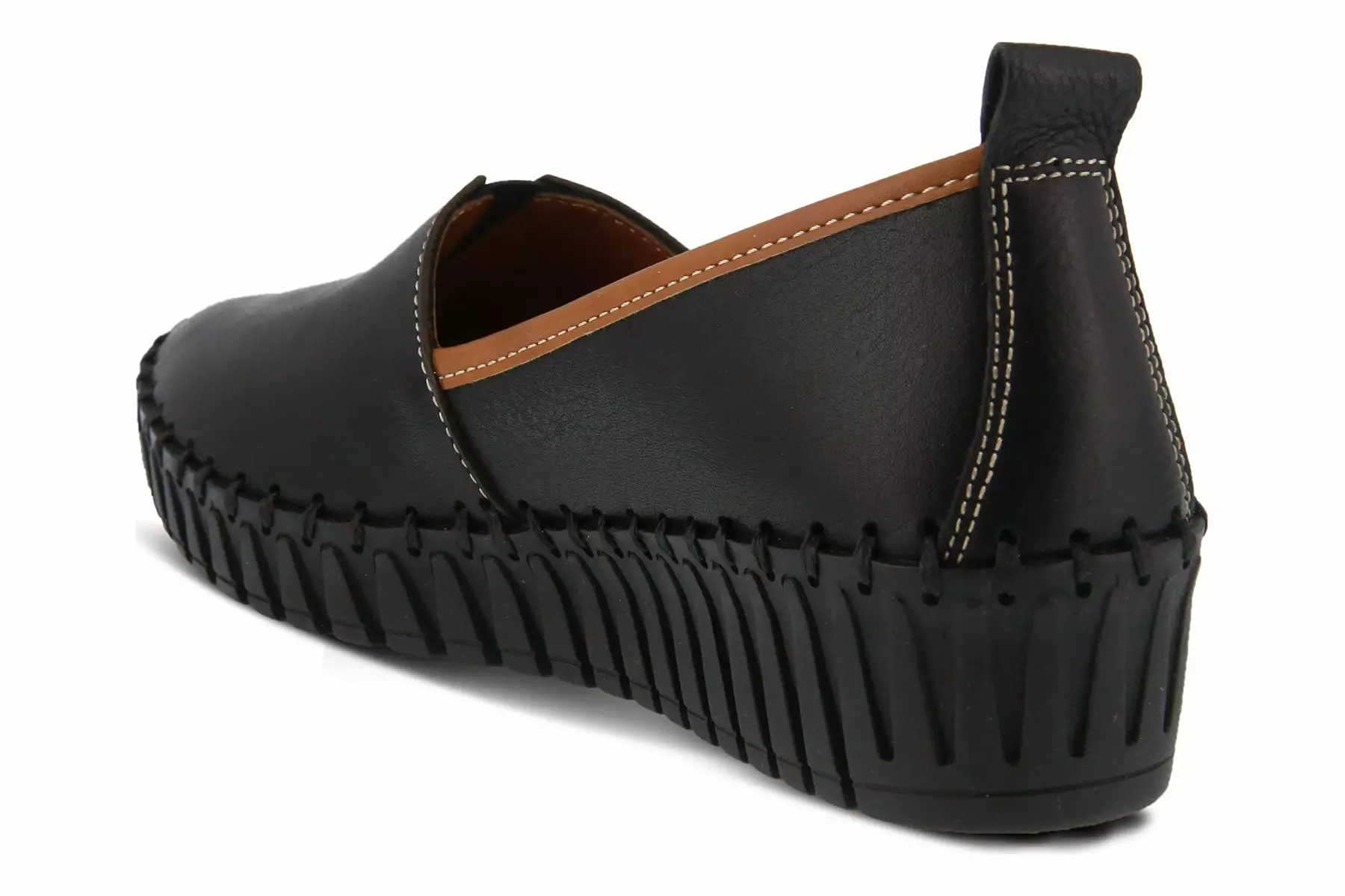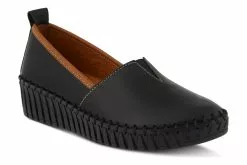 The Mediterranean influenced, high-quality premium leather Slip-on shoe featuring a notched center vamp with a V-shaped stretch elastic insert, easy pull-on heel tab, and dainty tonal stitchwork all on a strong stitched to sole construction, sculpted, comfort wedge with a flexible forefoot and removable insole.