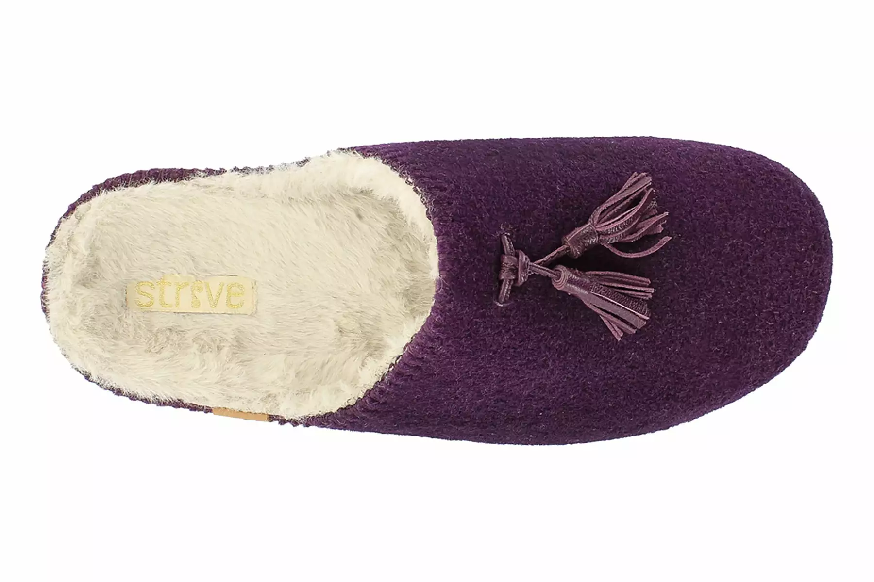 Strive Lille is a warm and cozy women’s slipper. These comfortable house shoes have textile uppers, faux fur lining, lightweight EVA midsole and rubber outsole. An open back silhouette, natural leather sock footbed and decorative tassel embellishment outlines these reliable slippers.