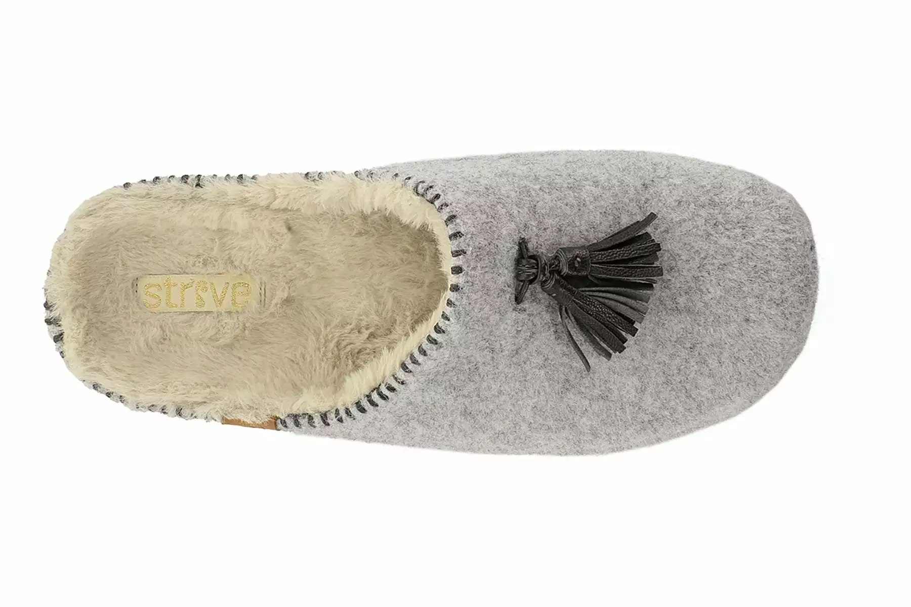 Strive Lille is a warm and cozy women’s slipper. These comfortable house shoes have textile uppers, faux fur lining, lightweight EVA midsole and rubber outsole. An open back silhouette, natural leather sock footbed and decorative tassel embellishment outlines these reliable slippers.