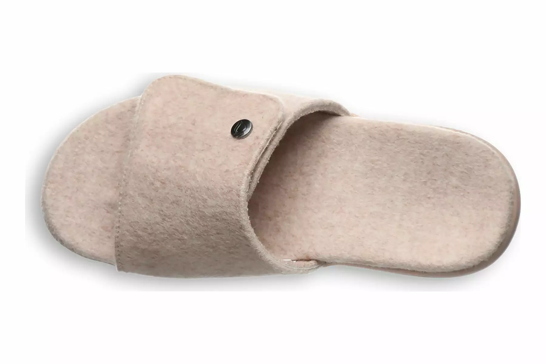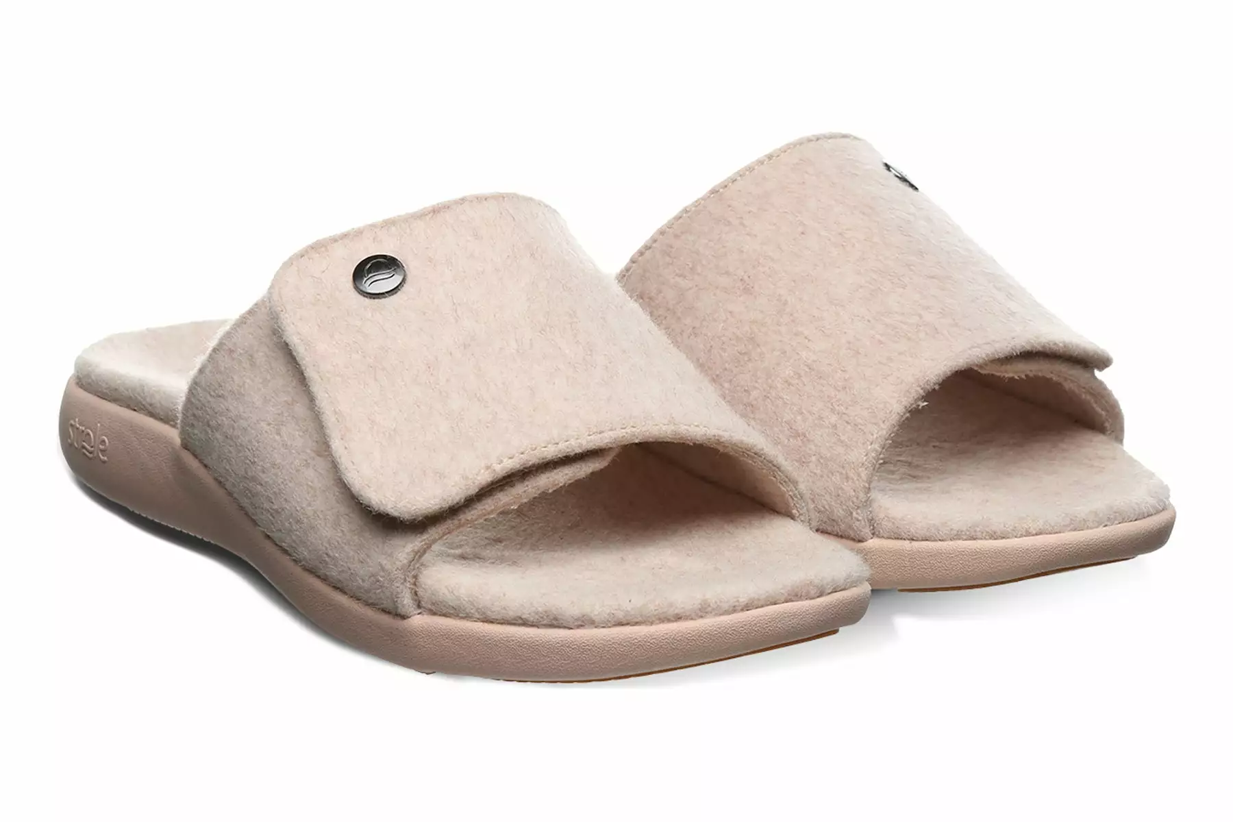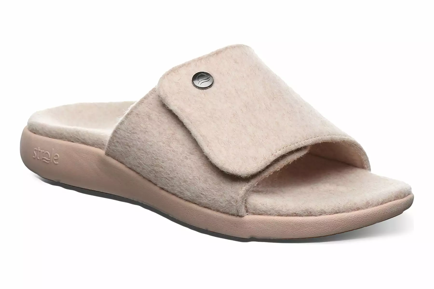 Strole Den is a comfortable slip-on slide sandal. These house slippers have a sandal construction, Melton wool upper, cushioned footbed and rubber outsole. An adjustable side strap secures feet in place, while the Soft Stride support system provides arch support and impact reduction.
