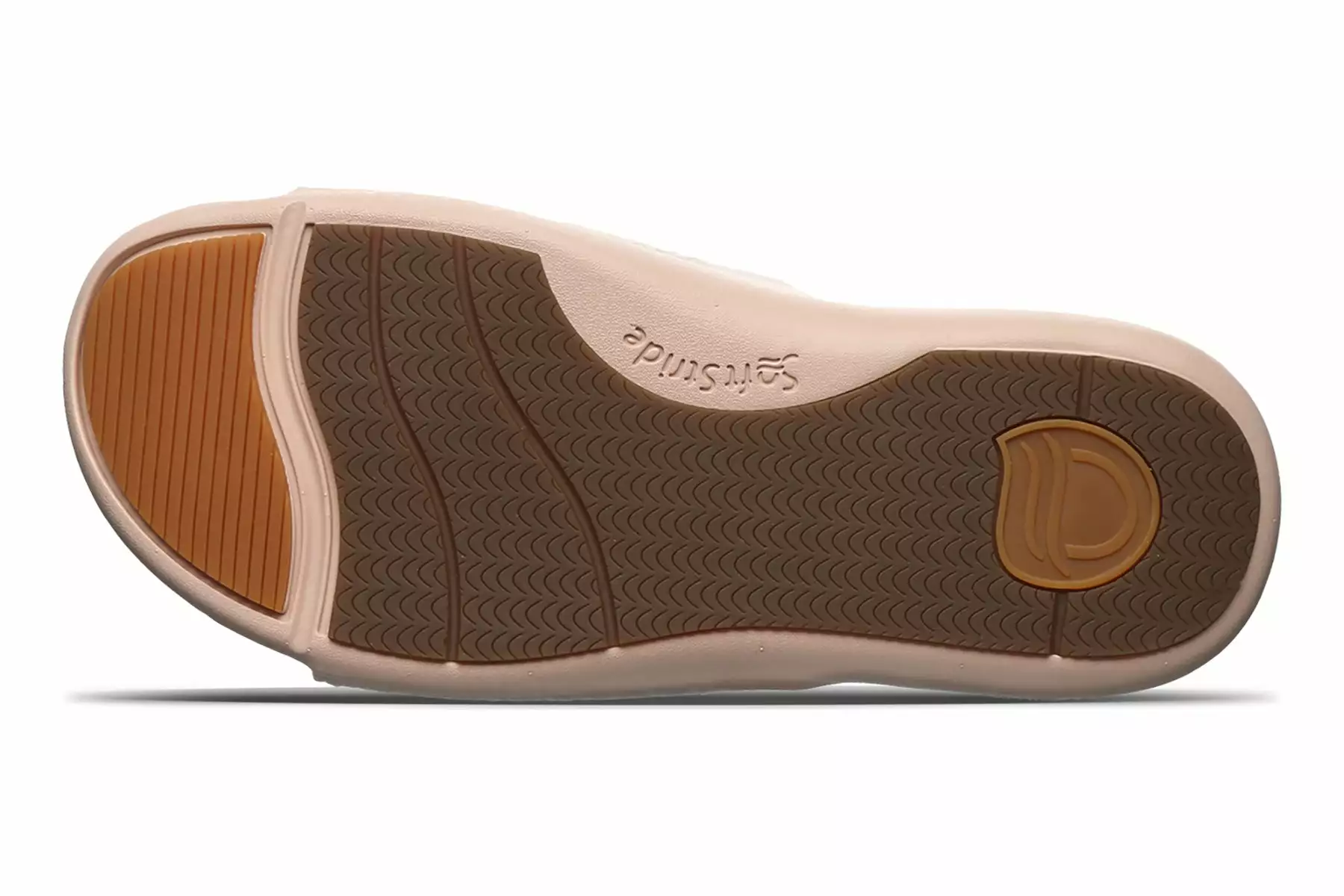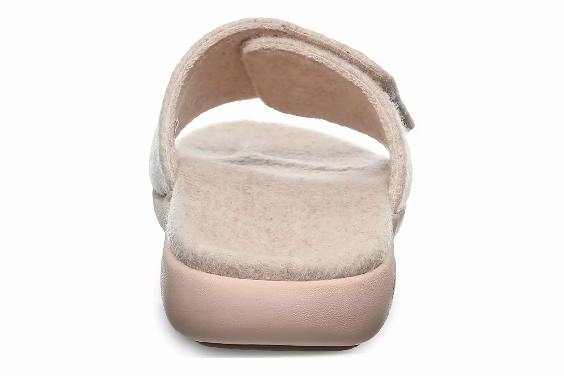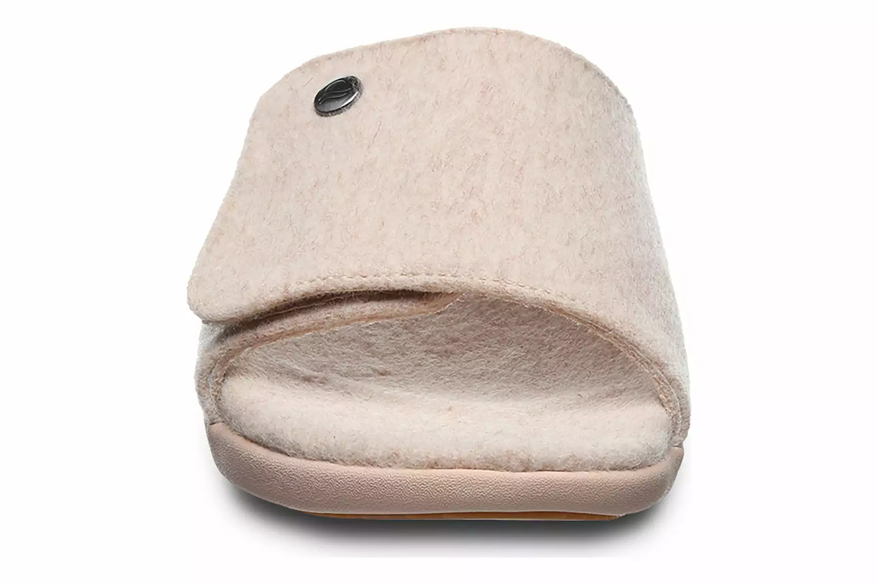 Strole Den is a comfortable slip-on slide sandal. These house slippers have a sandal construction, Melton wool upper, cushioned footbed and rubber outsole. An adjustable side strap secures feet in place, while the Soft Stride support system provides arch support and impact reduction.