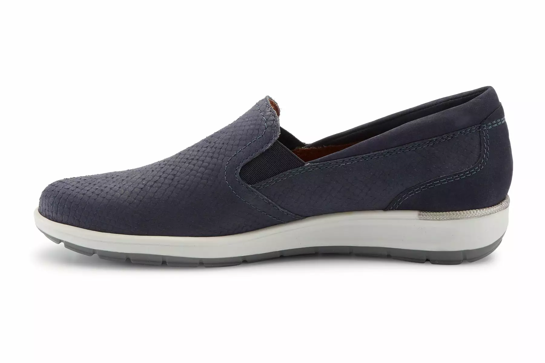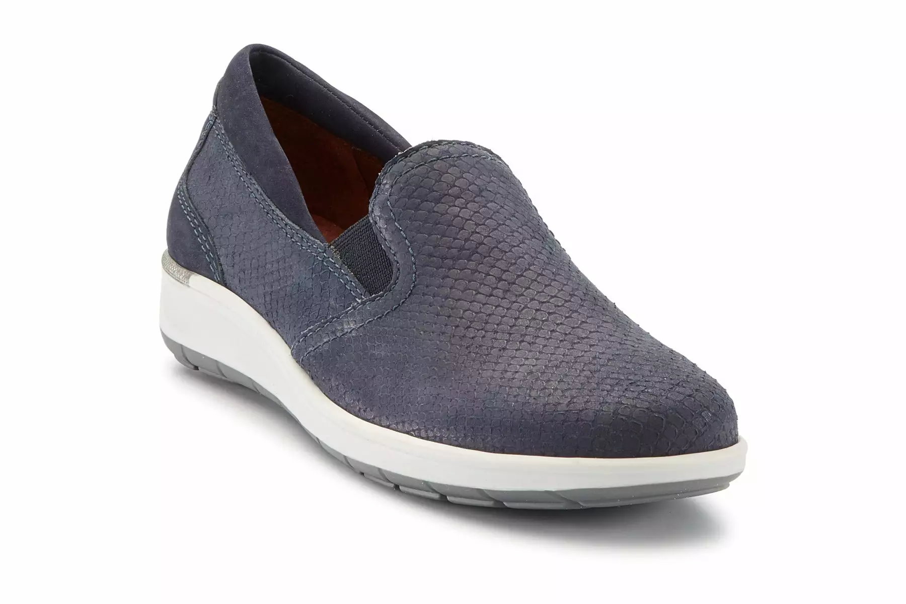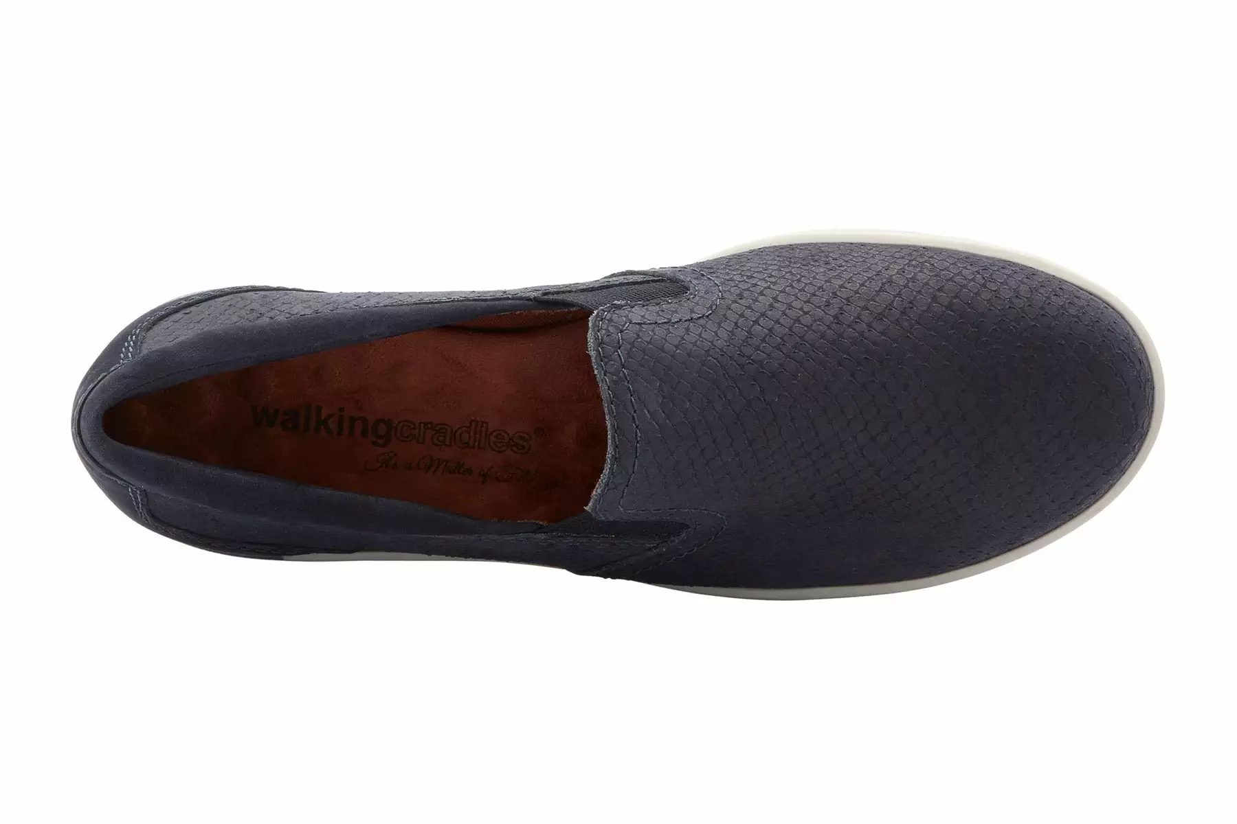 Walking Cradles Orleans is a casual and comfortable slip-on sneaker. Leather, snake print uppers offer support, while a padded collar comforts feet all day. Dual side goring allows for easy on-and-off and a TPR outsole adds traction and stability.